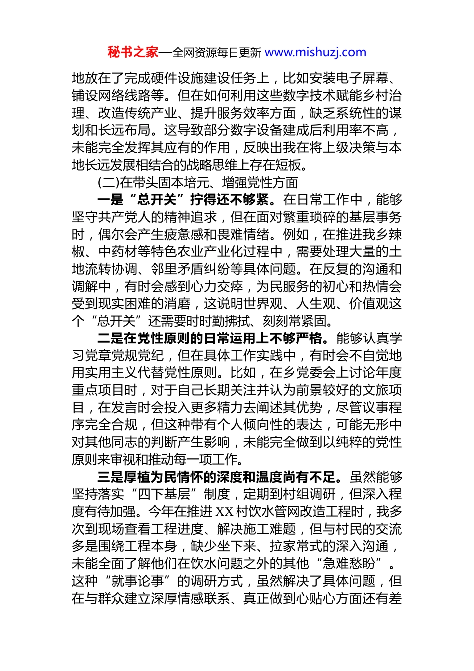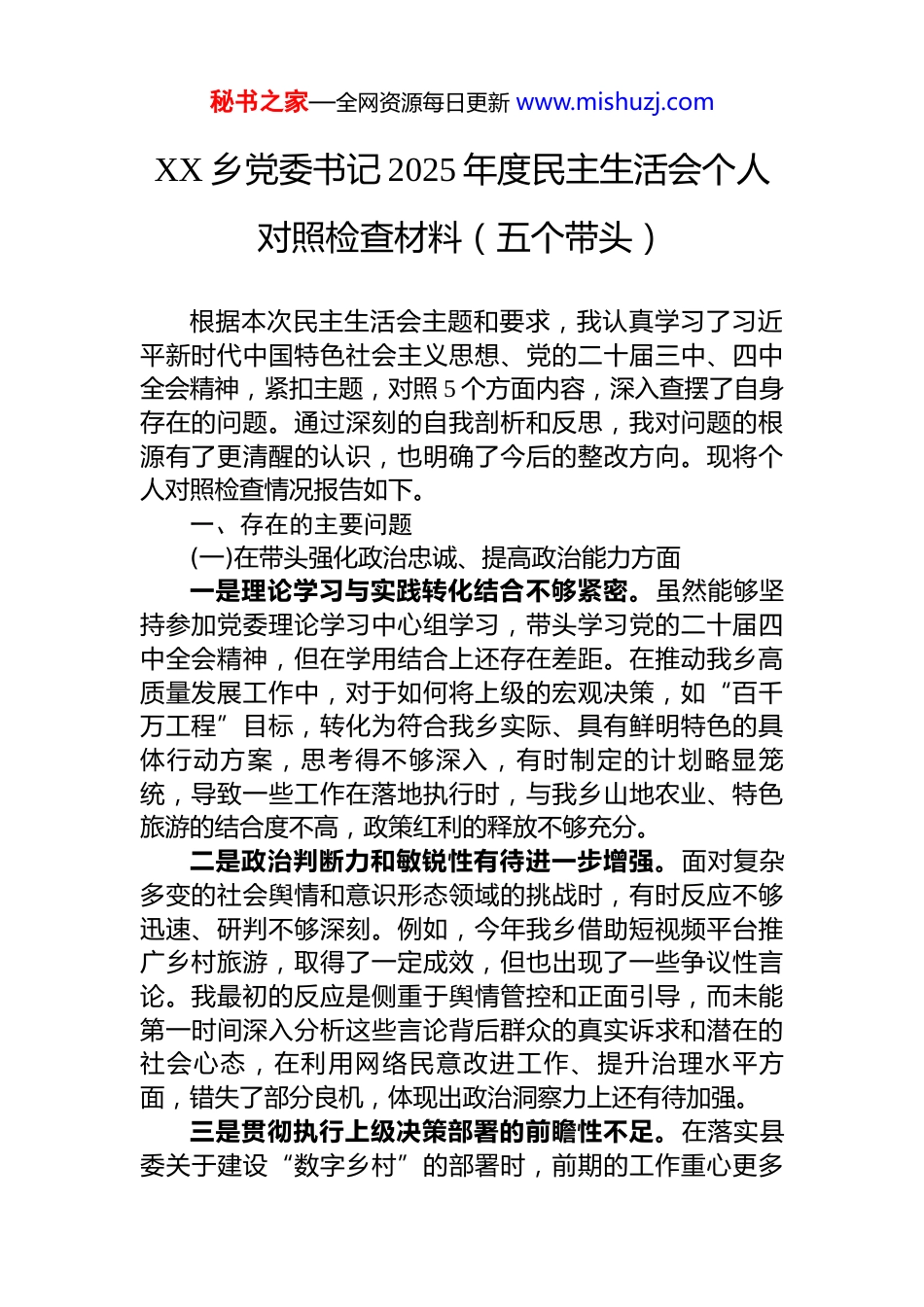 秘书之家—全网资源每日更新 www.mishuzj.comXX 乡党委书记 2025 年度民主生活会个人对照检查材料(五个带头)根据本次民主生活会主题和要求,我认真学习了习近平新时代中国特色社会主义思想、党的二十届三中、四中全会精神,紧扣主题,对照 5 个方面内容,深入查摆了自身存在的问题。通过深刻的自我剖析和反思,我对问题的根源有了更清醒的认识,也明确了今后的整改方向。现将个人对照检查情况报告如下。一、存在的主要问题(一)在带头强化政治忠诚、提高政治能力方面一是理论学习与实践转化结合不够紧密。虽然能够坚持参加党委理论学习中心组学习,带头学习党的二十届四中全会精神,但在学用结合上还存在差距。在推动我乡高质量发展工作中,对于如何将上级的宏观决策,如“百千万工程”目标,转化为符合我乡实际、具有鲜明特色的具体行动方案,思考得不够深入,有时制定的计划略显笼统,导致一些工作在落地执行时,与我乡山地农业、特色旅游的结合度不高,政策红利的释放不够充分。二是政治判断力和敏锐性有待进一步增强。面对复杂多变的社会舆情和意识形态领域的挑战时,有时反应不够迅速、研判不够深刻。例如,今年我乡借助短视频平台推广乡村旅游,取得了一定成效,但也出现了一些争议性言论。我最初的反应是侧重于舆情管控和正面引导,而未能第一时间深入分析这些言论背后群众的真实诉求和潜在的社会心态,在利用网络民意改进工作、提升治理水平方面,错失了部分良机,体现出政治洞察力上还有待加强。三是贯彻执行上级决策部署的前瞻性不足。在落实县委关于建设“数字乡村”的部署时,前期的工作重心更多秘书之家—全网资源每日更新 www.mishuzj.com地放在了完成硬件设施建设任务上,比如安装电子屏幕、铺设网络线路等。但在如何利用这些数字技术赋能乡村治理、改造传统产业、提升服务效率方面,缺乏系统性的谋划和长远布局。这导致部分数字设备建成后利用率不高,未能完全发挥其应有的作用,反映出我在将上级决策与本地长远发展相结合的战略思维上存在短板。(二)在带头固本培元、增强党性方面一是“总开关”拧得还不够紧。在日常工作中,能够坚守共产党人的精神追求,但在面对繁重琐碎的基层事务时,偶尔会产生疲惫感和畏难情绪。例如,在推进我乡辣椒、中药材等特色农业产业化过程中,需要处理大量的土地流转协调、邻里矛盾纠纷等具体问题。在反复的沟通和调解中,有时会感到心力交瘁,为民服务的初心和热情会受到现实困难的消磨,这说明世界观、人生观、价值观这个“总开关”还需要时时勤拂拭、刻刻常紧固。二是在党性原则的日常运用上不够严格。能够认真学习党章党规党纪,但在具体工作实践中,有时会不自觉地用实用主义代替党性原则。比如,在乡党委会上讨论年度重点项目时,对于自己长期关注并认为前景较好的文旅项目,在发言时会投入更多精力去阐述其优势,尽管议事程序完全合规,但这种带有个人倾向性的表达,可能无形中对其他同志的判断产生影响,未能完全做到以纯粹的党性原则来审视和推动每一项工作。三是厚植为民情怀的深度和温度尚有不足。虽然能够坚持落实“四下基层”制度,定期到村组调研,但深入程度有待加强。今年在推进 XX 村饮水管网改造工程时,我多次到现场查看工程进度、解决施工难题,但与村民的交流多是围绕工程本身,缺少坐下来、拉家常式的深入沟通,未能全面了解他们在饮水问题之外的其他“急难愁盼”。这种“就事论事”的调研方式,虽然解决了具体问题,但在与群众建立深厚情感联系、真正做到心贴心方面还有差秘书之家—全网资源每日更新 www.mishuzj.com距。(三)在带头敬畏人民、敬畏组织、敬畏法纪方面一是深入群众解决实际问题存在“温差”。在落实“四下基层”制度过程中,有时存在重形式、轻实效的倾向。例如,在今年组织的一次全乡人居环境整治督查中,我带队到几个点位进行了检查,主要听取了村干部的汇报,查看了主干道沿线的卫生状况。但由于时间紧张,未能亲自走到村庄的背街小巷、房前屋后去仔细查看,导致对部分区域存在的垃圾乱堆乱放等“顽疾”了解不深不透,影响了后续整改措施的精准性,没有完全将群众的“心愿清单”...