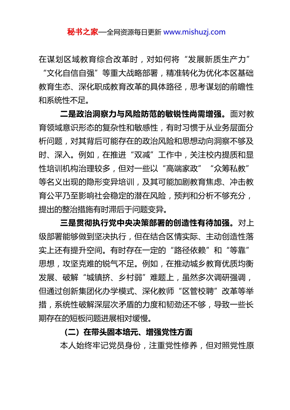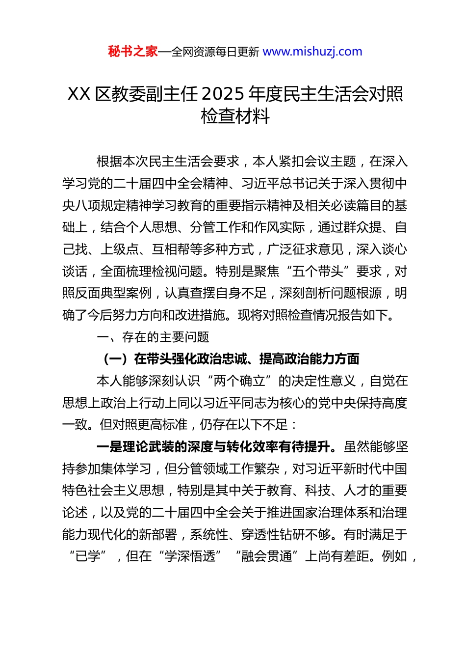 秘书之家—全网资源每日更新 www.mishuzj.comXX 区教委副主任 2025 年度民主生活会对照检查材料根据本次民主生活会要求,本人紧扣会议主题,在深入学习党的二十届四中全会精神、习近平总书记关于深入贯彻中央八项规定精神学习教育的重要指示精神及相关必读篇目的基础上,结合个人思想、分管工作和作风实际,通过群众提、自己找、上级点、互相帮等多种方式,广泛征求意见,深入谈心谈话,全面梳理检视问题。特别是聚焦“五个带头”要求,对照反面典型案例,认真查摆自身不足,深刻剖析问题根源,明确了今后努力方向和改进措施。现将对照检查情况报告如下。一、存在的主要问题(一)在带头强化政治忠诚、提高政治能力方面本人能够深刻认识“两个确立”的决定性意义,自觉在思想上政治上行动上同以习近平同志为核心的党中央保持高度一致。但对照更高标准,仍存在以下不足:一是理论武装的深度与转化效率有待提升。虽然能够坚持参加集体学习,但分管领域工作繁杂,对习近平新时代中国特色社会主义思想,特别是其中关于教育、科技、人才的重要论述,以及党的二十届四中全会关于推进国家治理体系和治理能力现代化的新部署,系统性、穿透性钻研不够。有时满足于“已学”,但在“学深悟透”“融会贯通”上尚有差距。例如,秘书之家—全网资源每日更新 www.mishuzj.com在谋划区域教育综合改革时,对如何将“发展新质生产力”“文化自信自强”等重大战略部署,精准转化为优化本区基础教育生态、深化职成教育改革的具体路径,思考谋划的前瞻性和系统性不足。二是政治洞察力与风险防范的敏锐性尚需增强。面对教育领域意识形态的复杂性和敏感性,有时习惯于从业务层面分析问题,对其背后可能存在的政治风险和思想动向洞察不够及时、深入。例如,在推进“双减”工作中,关注校内提质和显性培训机构治理较多,但对一些以“高端家政”“众筹私教”等名义出现的隐形变异培训,及其可能加剧教育焦虑、冲击教育公平乃至影响社会稳定的潜在风险,预判和分析不够充分,提出的整治措施有时滞后于问题变异。三是贯彻执行党中央决策部署的创造性有待加强。对上级部署能够做到坚决执行,但在结合区情实际、主动创造性落实上还有提升空间。有时存在一定的“路径依赖”和“等靠”思想,攻坚克难的锐气不足。例如,在推动城乡教育优质均衡发展、破解“城镇挤、乡村弱”难题上,虽然多次调研强调,但通过创新集团化办学模式、深化教师“区管校聘”改革等举措,系统性破解深层次矛盾的力度和韧劲还不够,导致一些长期存在的短板问题进展相对缓慢。(二)在带头固本培元、增强党性方面本人始终牢记党员身份,注重党性修养,但对照党性原秘书之家—全网资源每日更新 www.mishuzj.com则的严苛要求,仍有差距:一是党性锤炼与日常工作融合不够紧密。有时不自觉地认为抓好分管业务就是党性强的表现,未能时刻将具体工作置于党性原则的天平上考量。在执行双重组织生活制度上存在不足,有时因事务性工作“选择性”参加支部活动,即便参加,也常以领导身份听取汇报、布置工作多,以普通党员身份深入交流、接受监督少。开展批评与自我批评时,“辣味”不足,对自身问题多谈工作不足、少挖思想根源,对同志缺点多以建议代替批评。二是理想信念在攻坚克难中的韧劲有待锤炼。面对分管领域的一些“硬骨头”,如学前教育普惠性资源的结构性矛盾、职业教育产教融合“壁炉现象”、体育美育评价改革阻力等,虽然深知其重要性,但在持续推进过程中,当遇到体制机制障碍或部门协调困难时,偶尔会产生畏难情绪和急躁心态,缺乏“一竿子插到底”的狠劲和“功成不必在我”的境界,革命意志和斗争精神有所弱化。三是为民情怀的践行深度有待拓展。下基层调研有时存在“被安排”现象,看“门面”“窗口”多,看“后院”“角落”少。例如,在调研乡村小规模学校建设和留守儿童关爱服务工作时,更多是听取学校和部门汇报,与一线教师、留守儿童及其监护人面对面、心贴心的深度交流不够,导致对群众“急难愁盼”的感知不够精准、鲜活。提出的政策建议有时宏秘书之家—全网资源每日更新 www.mishuzj.com观原则多,能精准解决个体痛点的“...