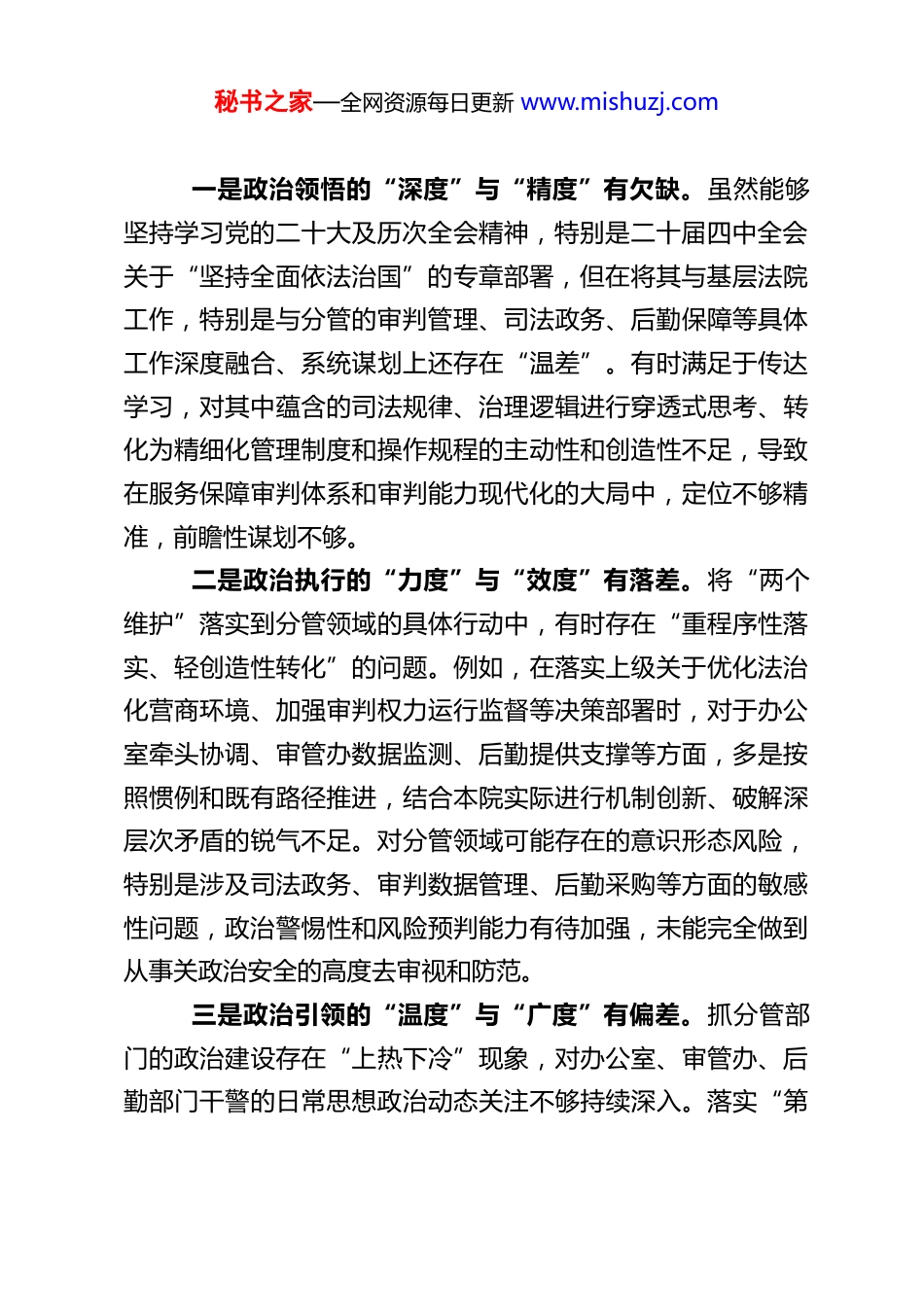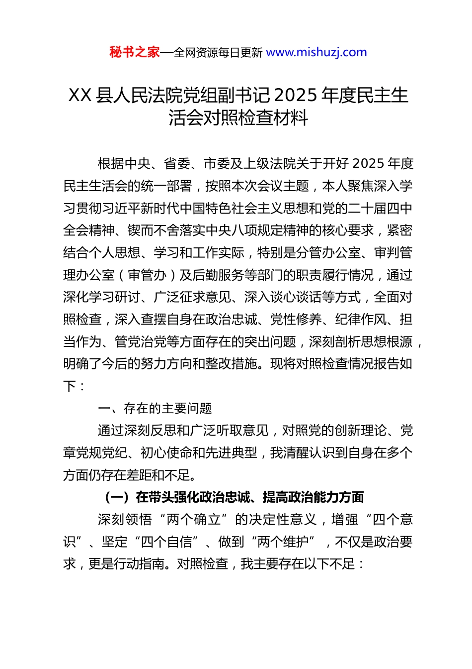 秘书之家—全网资源每日更新 www.mishuzj.comXX 县人民法院党组副书记 2025 年度民主生活会对照检查材料根据中央、省委、市委及上级法院关于开好 2025 年度民主生活会的统一部署,按照本次会议主题,本人聚焦深入学习贯彻习近平新时代中国特色社会主义思想和党的二十届四中全会精神、锲而不舍落实中央八项规定精神的核心要求,紧密结合个人思想、学习和工作实际,特别是分管办公室、审判管理办公室(审管办)及后勤服务等部门的职责履行情况,通过深化学习研讨、广泛征求意见、深入谈心谈话等方式,全面对照检查,深入查摆自身在政治忠诚、党性修养、纪律作风、担当作为、管党治党等方面存在的突出问题,深刻剖析思想根源,明确了今后的努力方向和整改措施。现将对照检查情况报告如下:一、存在的主要问题通过深刻反思和广泛听取意见,对照党的创新理论、党章党规党纪、初心使命和先进典型,我清醒认识到自身在多个方面仍存在差距和不足。(一)在带头强化政治忠诚、提高政治能力方面深刻领悟“两个确立”的决定性意义,增强“四个意识”、坚定“四个自信”、做到“两个维护”,不仅是政治要求,更是行动指南。对照检查,我主要存在以下不足:秘书之家—全网资源每日更新 www.mishuzj.com一是政治领悟的“深度”与“精度”有欠缺。虽然能够坚持学习党的二十大及历次全会精神,特别是二十届四中全会关于“坚持全面依法治国”的专章部署,但在将其与基层法院工作,特别是与分管的审判管理、司法政务、后勤保障等具体工作深度融合、系统谋划上还存在“温差”。有时满足于传达学习,对其中蕴含的司法规律、治理逻辑进行穿透式思考、转化为精细化管理制度和操作规程的主动性和创造性不足,导致在服务保障审判体系和审判能力现代化的大局中,定位不够精准,前瞻性谋划不够。二是政治执行的“力度”与“效度”有落差。将“两个维护”落实到分管领域的具体行动中,有时存在“重程序性落实、轻创造性转化”的问题。例如,在落实上级关于优化法治化营商环境、加强审判权力运行监督等决策部署时,对于办公室牵头协调、审管办数据监测、后勤提供支撑等方面,多是按照惯例和既有路径推进,结合本院实际进行机制创新、破解深层次矛盾的锐气不足。对分管领域可能存在的意识形态风险,特别是涉及司法政务、审判数据管理、后勤采购等方面的敏感性问题,政治警惕性和风险预判能力有待加强,未能完全做到从事关政治安全的高度去审视和防范。三是政治引领的“温度”与“广度”有偏差。抓分管部门的政治建设存在“上热下冷”现象,对办公室、审管办、后勤部门干警的日常思想政治动态关注不够持续深入。落实“第秘书之家—全网资源每日更新 www.mishuzj.com一议题”制度有时与部门业务会“套开”,学习研讨的深度和针对性不足,存在一定的形式化倾向。在将党的政治建设要求融入办文办会、审判管理、后勤服务等日常业务方面,探索形成的有效载体和特色做法不多,党建引领业务发展的融合度、可见度有待提升。(二)在带头固本培元、增强党性方面党性是党员干部立身、立业、立言、立德的基石。对照检查,我在强化理论武装、锤炼坚强党性上还需持续用力:一是理论学习的系统性和实践性结合不紧。学习《习近平谈治国理政》(第五卷)等权威著作,对“法治篇”“全面从严治党篇”关注较多,但对其他篇章中蕴含的立场、观点、方法学习领会不够全面深入,存在一定的“选择性阅读”。运用习近平法治思想指导解决分管工作实际难题的成效不显,例如,运用“坚持抓住领导干部这个‘关键少数’”的思想来加强内设机构管理,运用“坚持建设德才兼备的高素质法治工作队伍”的要求来抓分管部门队伍建设,结合点找得不够准,转化效果不够理想。个人学习笔记中,结合分管工作深入思考、提出对策建议的内容占比偏低。二是党性锤炼的主动性和自觉性有所放松。随着职务提升和事务性工作增多,有时不自觉地放松了严格的党性锻炼,以事务工作代替党性修养。对照党章党规党纪进行自我检视、自我净化、自我提高的主动频率有所下降。在参加双重组织生秘书之家—全网资源每日更新 www.mishuzj.com活时,有时以领导身份指导工...