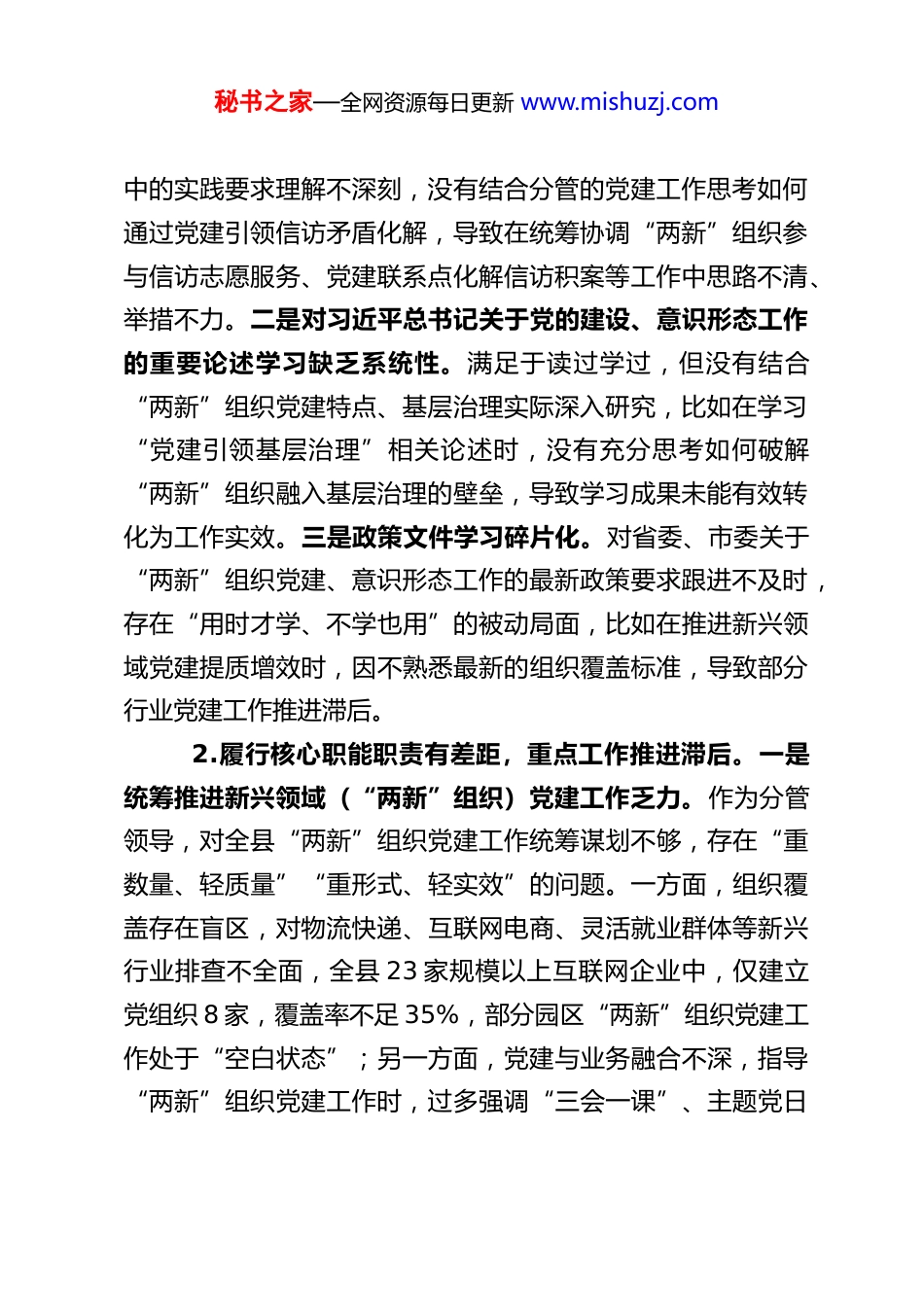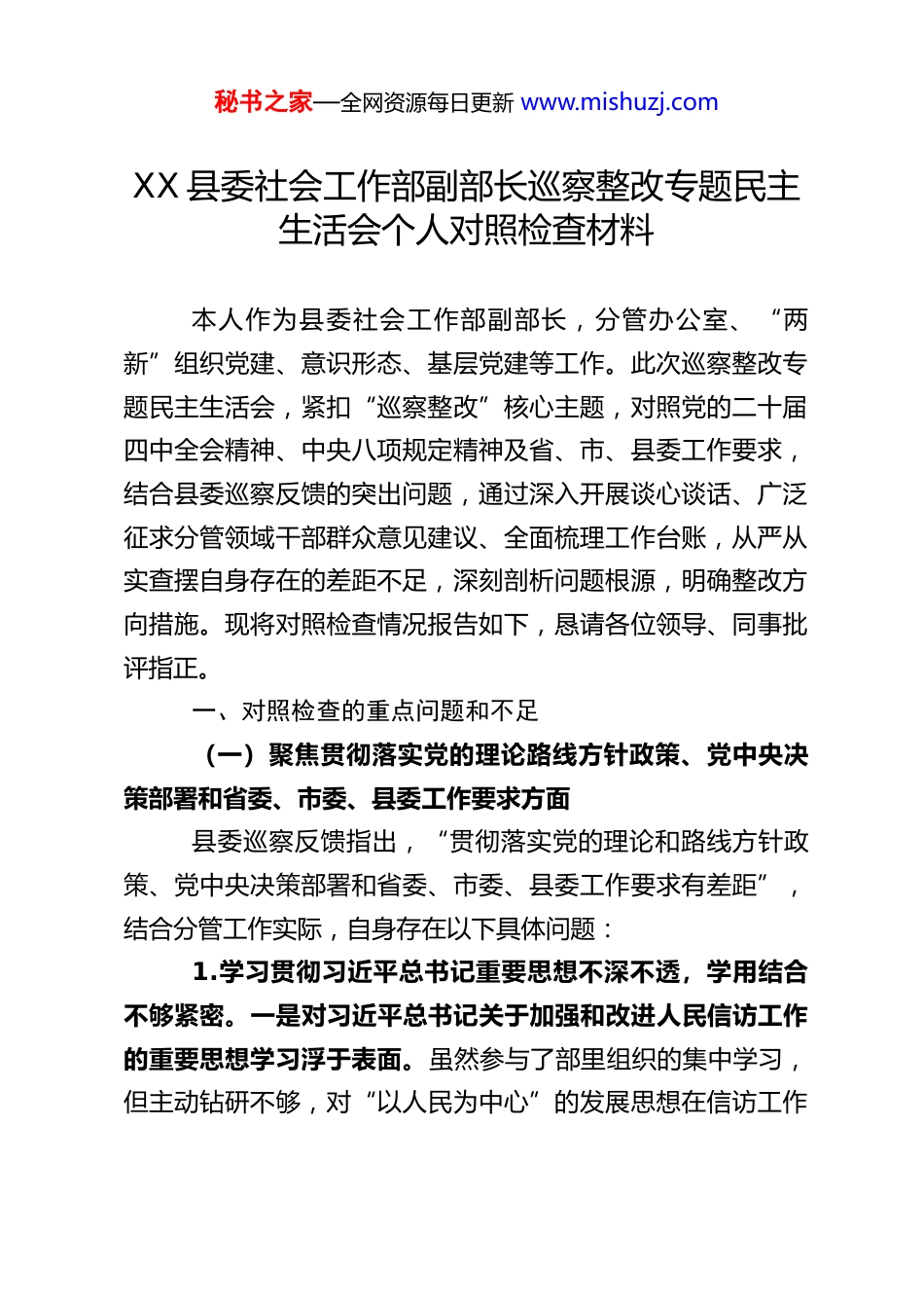 秘书之家—全网资源每日更新 www.mishuzj.comXX 县委社会工作部副部长巡察整改专题民主生活会个人对照检查材料本人作为县委社会工作部副部长,分管办公室、“两新”组织党建、意识形态、基层党建等工作。此次巡察整改专题民主生活会,紧扣“巡察整改”核心主题,对照党的二十届四中全会精神、中央八项规定精神及省、市、县委工作要求,结合县委巡察反馈的突出问题,通过深入开展谈心谈话、广泛征求分管领域干部群众意见建议、全面梳理工作台账,从严从实查摆自身存在的差距不足,深刻剖析问题根源,明确整改方向措施。现将对照检查情况报告如下,恳请各位领导、同事批评指正。一、对照检查的重点问题和不足(一)聚焦贯彻落实党的理论路线方针政策、党中央决策部署和省委、市委、县委工作要求方面县委巡察反馈指出,“贯彻落实党的理论和路线方针政策、党中央决策部署和省委、市委、县委工作要求有差距”,结合分管工作实际,自身存在以下具体问题:1.学习贯彻习近平总书记重要思想不深不透,学用结合不够紧密。一是对习近平总书记关于加强和改进人民信访工作的重要思想学习浮于表面。虽然参与了部里组织的集中学习,但主动钻研不够,对“以人民为中心”的发展思想在信访工作秘书之家—全网资源每日更新 www.mishuzj.com中的实践要求理解不深刻,没有结合分管的党建工作思考如何通过党建引领信访矛盾化解,导致在统筹协调“两新”组织参与信访志愿服务、党建联系点化解信访积案等工作中思路不清、举措不力。二是对习近平总书记关于党的建设、意识形态工作的重要论述学习缺乏系统性。满足于读过学过,但没有结合“两新”组织党建特点、基层治理实际深入研究,比如在学习“党建引领基层治理”相关论述时,没有充分思考如何破解“两新”组织融入基层治理的壁垒,导致学习成果未能有效转化为工作实效。三是政策文件学习碎片化。对省委、市委关于“两新”组织党建、意识形态工作的最新政策要求跟进不及时,存在“用时才学、不学也用”的被动局面,比如在推进新兴领域党建提质增效时,因不熟悉最新的组织覆盖标准,导致部分行业党建工作推进滞后。2.履行核心职能职责有差距,重点工作推进滞后。一是统筹推进新兴领域(“两新”组织)党建工作乏力。作为分管领导,对全县“两新”组织党建工作统筹谋划不够,存在“重数量、轻质量”“重形式、轻实效”的问题。一方面,组织覆盖存在盲区,对物流快递、互联网电商、灵活就业群体等新兴行业排查不全面,全县 23 家规模以上互联网企业中,仅建立党组织 8 家,覆盖率不足 35%,部分园区“两新”组织党建工作处于“空白状态”;另一方面,党建与业务融合不深,指导“两新”组织党建工作时,过多强调“三会一课”、主题党日秘书之家—全网资源每日更新 www.mishuzj.com等基础动作,对如何结合企业生产经营、行业服务特点设计党建载体思考不足,全县 60%以上的“两新”组织党组织存在“党建与业务两张皮”现象,党组织在企业发展中的政治引领作用未能充分发挥。此外,对“两新”组织党务工作者培养力度不够,全年仅开展 1 次集中培训,且培训内容针对性不强,导致部分党务工作者不会干、不愿干。二是统筹指导党建引领基层治理工作不扎实。未能有效发挥党建“总抓手”作用,统筹协调民政、政法、乡镇(街道)等部门推进基层治理的力度不足,存在“单打独斗”现象。比如在推进“党建+网格”治理中,没有及时推动“两新”组织党组织与社区网格党组织结对共建,全县仅 12 家“两新”组织参与网格志愿服务,占比不足 8%;在化解基层治理中的矛盾纠纷时,未能充分调动“两新”组织中的党员骨干力量,党建引领基层治理的合力未形成。三是推进志愿者协会组建工作严重滞后。对县委部署的志愿者协会组建工作重视不够,仅简单安排办公室牵头,未亲自研究制定工作方案、未主动对接相关部门整合资源,导致组建工作拖延半年仍未完成。具体表现为:未开展全县志愿服务资源普查,对现有志愿者队伍、服务项目底数不清;未建立牵头协调机制,民政、团委、工会等部门联动不足;未制定激励保障措施,志愿者参与积极性不高,最终导致这项工作成为县委重点...