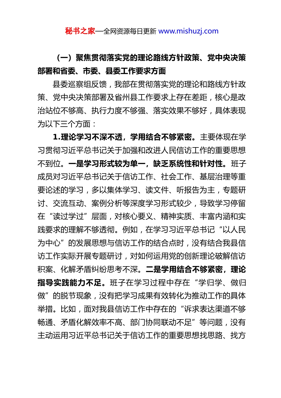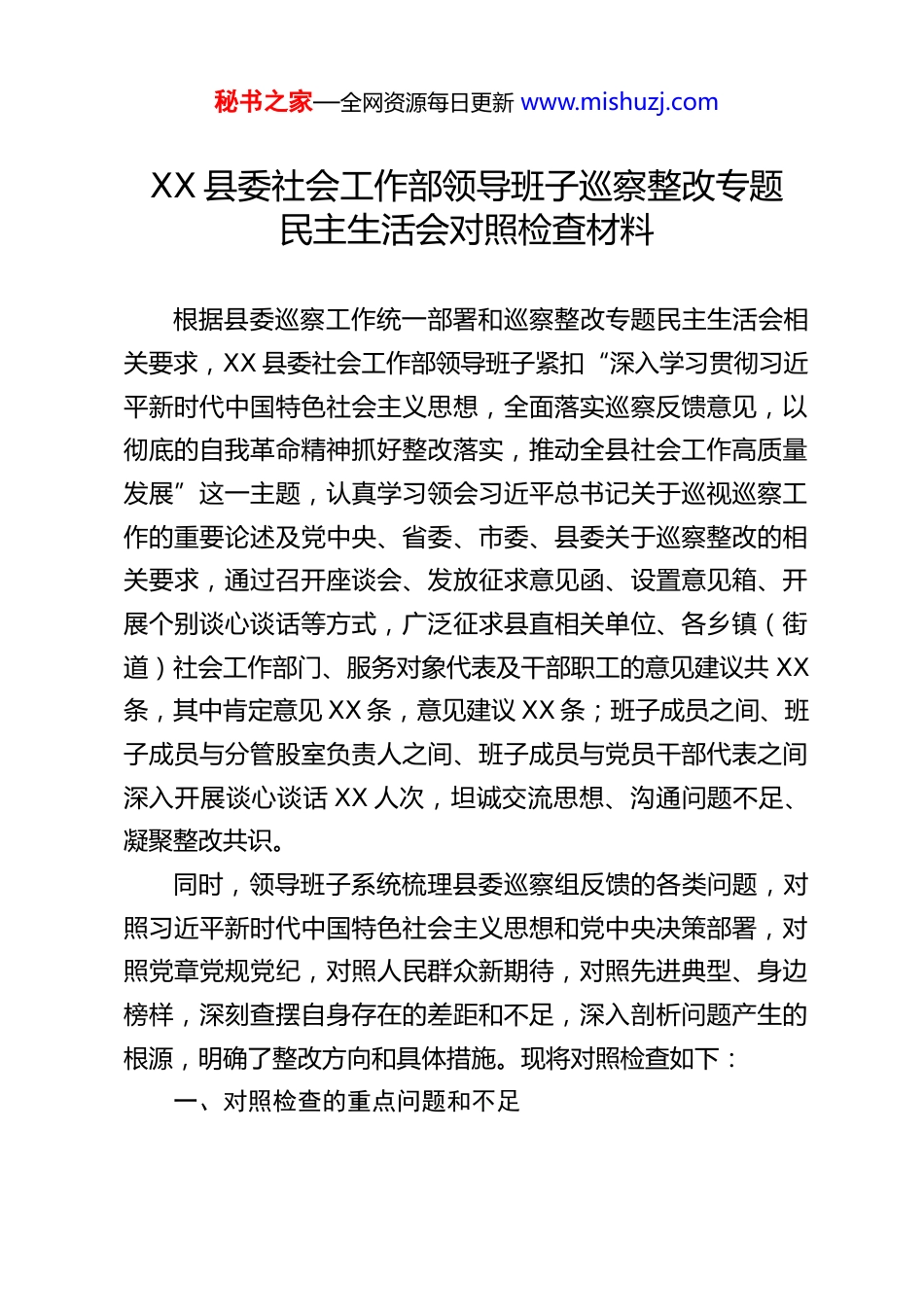 秘书之家—全网资源每日更新 www.mishuzj.comXX 县委社会工作部领导班子巡察整改专题民主生活会对照检查材料根据县委巡察工作统一部署和巡察整改专题民主生活会相关要求,XX 县委社会工作部领导班子紧扣“深入学习贯彻习近平新时代中国特色社会主义思想,全面落实巡察反馈意见,以彻底的自我革命精神抓好整改落实,推动全县社会工作高质量发展”这一主题,认真学习领会习近平总书记关于巡视巡察工作的重要论述及党中央、省委、市委、县委关于巡察整改的相关要求,通过召开座谈会、发放征求意见函、设置意见箱、开展个别谈心谈话等方式,广泛征求县直相关单位、各乡镇(街道)社会工作部门、服务对象代表及干部职工的意见建议共 XX条,其中肯定意见 XX 条,意见建议 XX 条;班子成员之间、班子成员与分管股室负责人之间、班子成员与党员干部代表之间深入开展谈心谈话 XX 人次,坦诚交流思想、沟通问题不足、凝聚整改共识。同时,领导班子系统梳理县委巡察组反馈的各类问题,对照习近平新时代中国特色社会主义思想和党中央决策部署,对照党章党规党纪,对照人民群众新期待,对照先进典型、身边榜样,深刻查摆自身存在的差距和不足,深入剖析问题产生的根源,明确了整改方向和具体措施。现将对照检查如下:一、对照检查的重点问题和不足秘书之家—全网资源每日更新 www.mishuzj.com(一)聚焦贯彻落实党的理论路线方针政策、党中央决策部署和省委、市委、县委工作要求方面县委巡察组反馈,我部在贯彻落实党的理论和路线方针政策、党中央决策部署及省州县工作要求上存在差距,核心是政治站位不够高、执行力度不够强、落实效果不够好,具体表现为以下三个方面:1.理论学习不深不透,学用结合不够紧密。主要体现在学习贯彻习近平总书记关于加强和改进人民信访工作的重要思想不到位。一是学习形式较为单一,缺乏系统性和针对性。班子成员对习近平总书记关于信访工作、社会工作、基层治理等重要论述的学习,多以集体学习、读文件、听报告为主,专题研讨、交流互动、案例分析等深度学习形式较少,导致学习停留在“读过学过”层面,对核心要义、精神实质、丰富内涵和实践要求的理解不够透彻。例如,在学习习近平总书记“以人民为中心”的发展思想与信访工作的结合点时,没有结合我县信访工作实际开展专题研讨,对如何运用党的创新理论破解信访积案、化解矛盾纠纷思考不深。二是学用结合不够紧密,理论指导实践能力不足。班子在学习过程中存在“学归学、做归做”的脱节现象,没有把学习成果有效转化为推动工作的具体举措。比如,面对我县信访工作中存在的“诉求表达渠道不够畅通、矛盾化解效率不高、部门协同联动不足”等问题,没有主动运用习近平总书记关于信访工作的重要思想找思路、找方秘书之家—全网资源每日更新 www.mishuzj.com法,依然沿用传统工作模式,导致部分信访问题久拖不决,群众满意度不高。三是学习覆盖不够全面,基层一线学习传导不足。对乡镇(街道)社会工作服务站、村(社区)相关工作人员的学习指导不够,没有建立常态化的学习传导机制,导致党的创新理论在基层一线的知晓度和执行力层层递减,部分基层工作人员对信访工作的政策要求、工作标准掌握不精准,影响了工作质效。2.履职尽责存在短板,核心职能发挥不充分。班子在统筹推进各项工作中,存在统筹协调不够、推进力度不足、工作落实不扎实等问题,具体表现为四个方面:一是新兴领域党建工作推进滞后。随着我县互联网企业、社会组织、新就业形态劳动者群体等新兴领域快速发展,党建工作覆盖不足、引领不够的问题日益突出。班子对新兴领域党建工作的重要性认识不足,缺乏系统谋划和统筹推进,没有结合新兴领域特点制定针对性的党建工作方案,导致新兴领域党组织组建率偏低,已建立的党组织也存在“空转”现象,党组织在凝聚人心、引领发展中的作用没有充分发挥。例如,我县互联网企业中已建立党组织的仅占 XX%,且多数党组织没有开展常态化组织生活,党建工作与业务工作“两张皮”问题突出。二是全县信访工作指导协调不到位。班子在统筹指导全县信访工作中,存在“重部署、轻落实,重接访、轻化解”的倾...