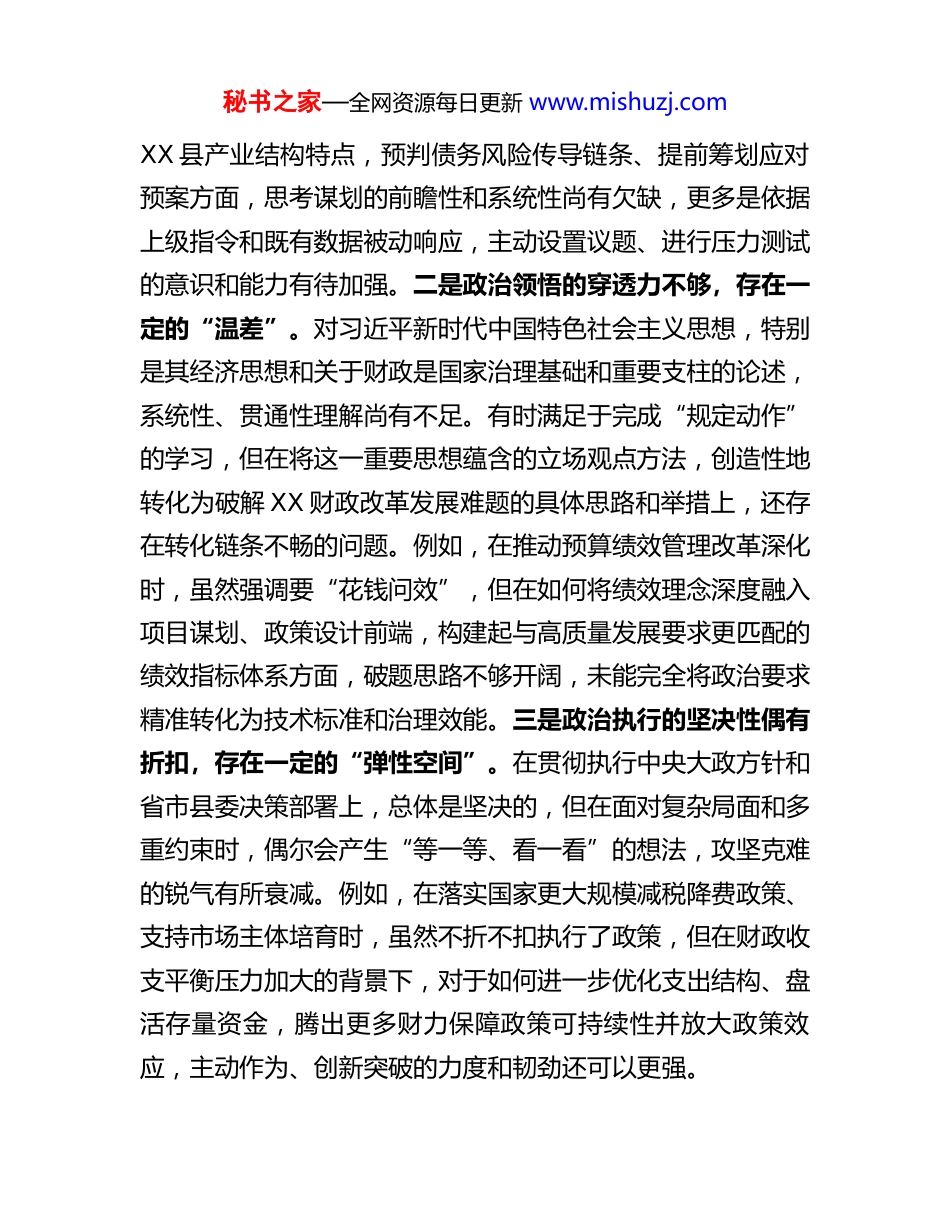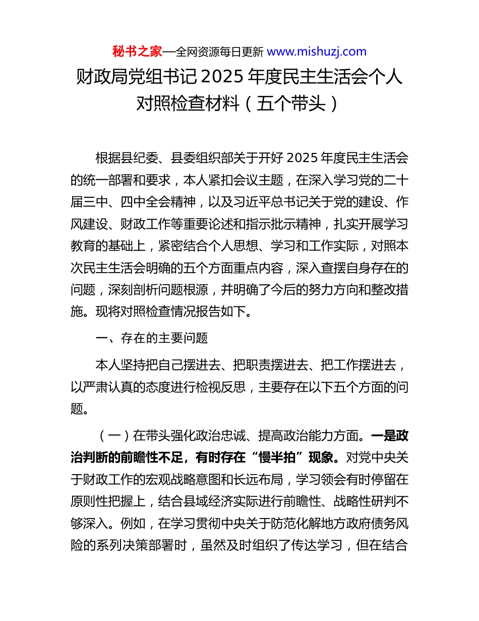 秘书之家—全网资源每日更新 www.mishuzj.com财政局党组书记 2025 年度民主生活会个人对照检查材料(五个带头)根据县纪委、县委组织部关于开好 2025 年度民主生活会的统一部署和要求,本人紧扣会议主题,在深入学习党的二十届三中、四中全会精神,以及习近平总书记关于党的建设、作风建设、财政工作等重要论述和指示批示精神,扎实开展学习教育的基础上,紧密结合个人思想、学习和工作实际,对照本次民主生活会明确的五个方面重点内容,深入查摆自身存在的问题,深刻剖析问题根源,并明确了今后的努力方向和整改措施。现将对照检查情况报告如下。一、存在的主要问题本人坚持把自己摆进去、把职责摆进去、把工作摆进去,以严肃认真的态度进行检视反思,主要存在以下五个方面的问题。(一)在带头强化政治忠诚、提高政治能力方面。一是政治判断的前瞻性不足,有时存在“慢半拍”现象。对党中央关于财政工作的宏观战略意图和长远布局,学习领会有时停留在原则性把握上,结合县域经济实际进行前瞻性、战略性研判不够深入。例如,在学习贯彻中央关于防范化解地方政府债务风险的系列决策部署时,虽然及时组织了传达学习,但在结合秘书之家—全网资源每日更新 www.mishuzj.comXX 县产业结构特点,预判债务风险传导链条、提前筹划应对预案方面,思考谋划的前瞻性和系统性尚有欠缺,更多是依据上级指令和既有数据被动响应,主动设置议题、进行压力测试的意识和能力有待加强。二是政治领悟的穿透力不够,存在一定的“温差”。对习近平新时代中国特色社会主义思想,特别是其经济思想和关于财政是国家治理基础和重要支柱的论述,系统性、贯通性理解尚有不足。有时满足于完成“规定动作”的学习,但在将这一重要思想蕴含的立场观点方法,创造性地转化为破解 XX 财政改革发展难题的具体思路和举措上,还存在转化链条不畅的问题。例如,在推动预算绩效管理改革深化时,虽然强调要“花钱问效”,但在如何将绩效理念深度融入项目谋划、政策设计前端,构建起与高质量发展要求更匹配的绩效指标体系方面,破题思路不够开阔,未能完全将政治要求精准转化为技术标准和治理效能。三是政治执行的坚决性偶有折扣,存在一定的“弹性空间”。在贯彻执行中央大政方针和省市县委决策部署上,总体是坚决的,但在面对复杂局面和多重约束时,偶尔会产生“等一等、看一看”的想法,攻坚克难的锐气有所衰减。例如,在落实国家更大规模减税降费政策、支持市场主体培育时,虽然不折不扣执行了政策,但在财政收支平衡压力加大的背景下,对于如何进一步优化支出结构、盘活存量资金,腾出更多财力保障政策可持续性并放大政策效应,主动作为、创新突破的力度和韧劲还可以更强。秘书之家—全网资源每日更新 www.mishuzj.com(二)在带头固本培元、增强党性方面。一是理论武装的“深耕细作”不够,学用结合存在“两张皮”。虽然能够坚持参加中心组学习和个人自学,但在读原著、学原文、悟原理上下的功夫还不够深,对党的创新理论的发展脉络、核心要义、实践要求的整体性把握有待提升。有时存在“实用主义”倾向,与财政业务直接相关的学得多、思考得深,而对马克思主义立场观点方法等基础理论的学习相对零散,导致运用党的科学理论指导财政实践、解决深层次矛盾的能力尚有不足。例如,在运用新发展理念统筹财政资源支持县域创新驱动发展时,思路和举措的创新性、系统性不足,未能完全将理论学习的成果转化为引领财政政策创新的强大动力。二是党性锤炼的“熔炉”温度不够,自我革命精神有所弱化。对照党章党规党纪进行自我检视、自我净化、自我提高的主动性和经常性不足。在严肃的党内政治生活中,有时顾及情面,开展批评与自我批评“辣味”不足,对自身存在的一些深层次思想问题、作风问题,缺乏“刮骨疗毒”的勇气。例如,在组织生活会上,对班子成员和分管股室负责同志存在的问题,多以提醒建议为主,直指要害、触及灵魂的尖锐批评较少,一定程度上影响了党内政治生活的政治性、时代性、原则性、战斗性。三是理想信念的“压舱石”作用有待进一步夯实,奋斗精神偶有松懈。随着工作年限增长,有时不自觉地产生了“...
