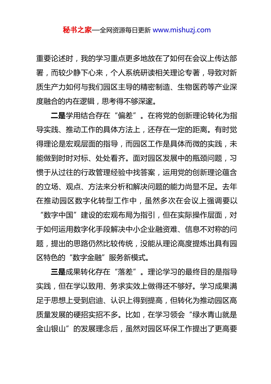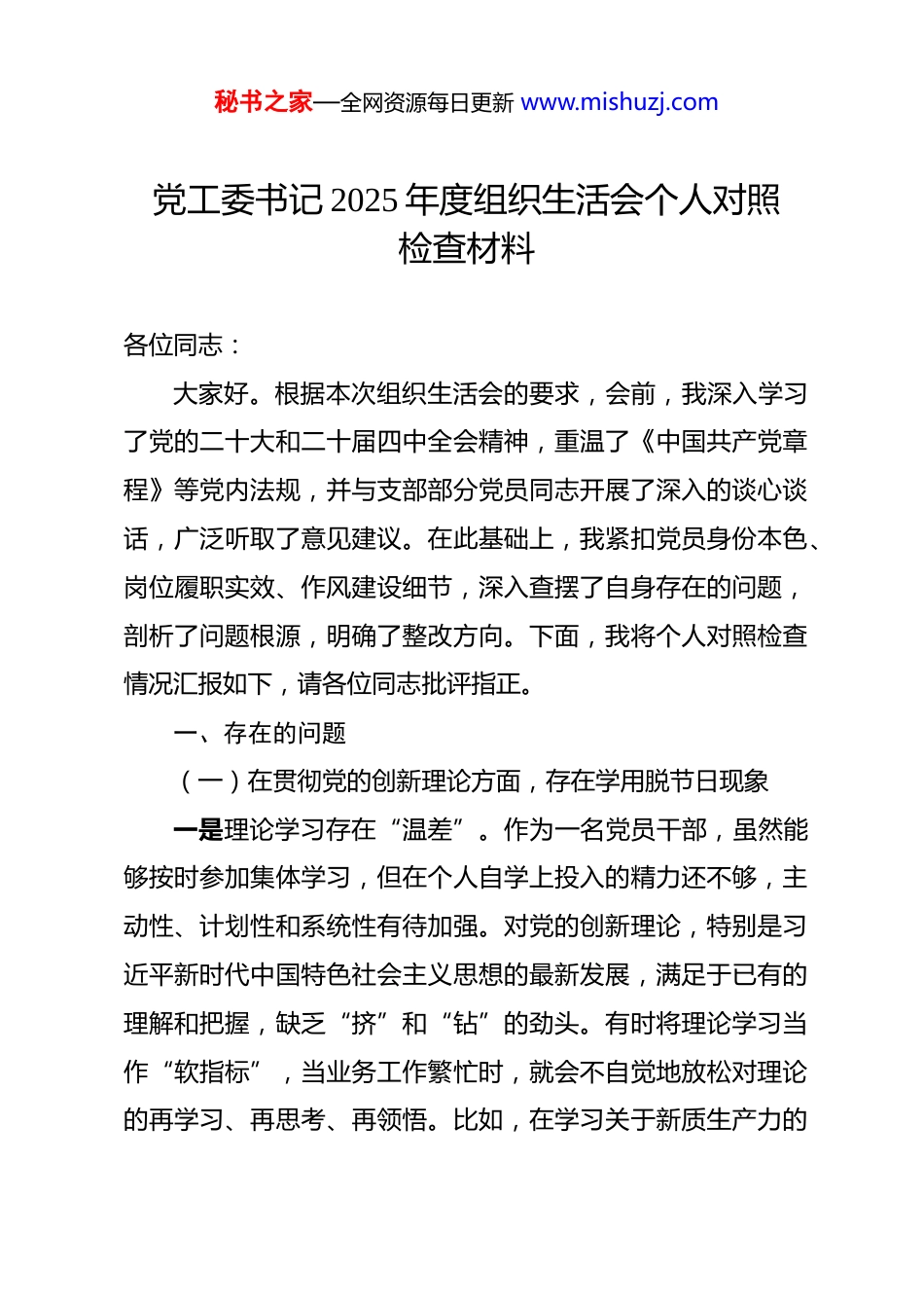 秘书之家—全网资源每日更新 www.mishuzj.com党工委书记 2025 年度组织生活会个人对照检查材料 各位同志:大家好。根据本次组织生活会的要求,会前,我深入学习了党的二十大和二十届四中全会精神,重温了《中国共产党章程》等党内法规,并与支部部分党员同志开展了深入的谈心谈话,广泛听取了意见建议。在此基础上,我紧扣党员身份本色、岗位履职实效、作风建设细节,深入查摆了自身存在的问题,剖析了问题根源,明确了整改方向。下面,我将个人对照检查情况汇报如下,请各位同志批评指正。一、存在的问题(一)在贯彻党的创新理论方面,存在学用脱节日现象一是理论学习存在“温差”。作为一名党员干部,虽然能够按时参加集体学习,但在个人自学上投入的精力还不够,主动性、计划性和系统性有待加强。对党的创新理论,特别是习近平新时代中国特色社会主义思想的最新发展,满足于已有的理解和把握,缺乏“挤”和“钻”的劲头。有时将理论学习当作“软指标”,当业务工作繁忙时,就会不自觉地放松对理论的再学习、再思考、再领悟。比如,在学习关于新质生产力的秘书之家—全网资源每日更新 www.mishuzj.com重要论述时,我的学习重点更多地放在了如何在会议上传达部署,而较少静下心来,个人系统研读相关理论专著,导致对新质生产力如何与我们园区主导的精密制造、生物医药等产业深度融合的内在逻辑,思考得不够深邃。二是学用结合存在“偏差”。在将党的创新理论转化为指导实践、推动工作的具体方法上,还存在一定的距离。有时觉得理论是宏观层面的指导,而园区工作是具体而微的实践,未能做到时时对标、处处看齐。面对园区发展中的瓶颈问题,习惯于从过往的行政管理经验中找答案,运用党的创新理论蕴含的立场、观点、方法来分析和解决问题的能力尚显不足。去年在推动园区数字化转型工作中,虽然多次在会议上强调要以“数字中国”建设的宏观布局为指引,但在实际操作层面,对于如何运用数字化手段解决中小企业融资难、信息不对称的问题,提出的思路仍然比较传统,没能从理论高度提炼出具有园区特色的“数字金融”服务新模式。三是成果转化存在“落差”。理论学习的最终目的是指导实践,但在学以致用、务求实效上做得还不够好。学习成果满足于思想上受到启迪、认识上得到提高,但转化为推动园区高质量发展的硬招实招不多。比如,在学习领会“绿水青山就是金山银山”的发展理念后,虽然对园区环保工作提出了更高要秘书之家—全网资源每日更新 www.mishuzj.com求,但在推动绿色低碳技术改造、循环经济产业链构建等具体工作上,缺乏一抓到底的韧劲。去年一家化工企业提出绿色化改造的技术方案,我只是按常规程序批转给了相关部门,而没有作为践行绿色发展理念的党员,主动去跟进协调技术专家、对接环保政策资源,导致该项目进展缓慢,理论学习的成效未能及时落地。(二)在加强党性锤炼方面,存在标准要求不严现象一是政治站位有时不高。作为一名受党教育多年的党员,自认为能够时刻保持政治上的清醒和坚定,但对照更高标准,在将业务工作完全融入党和国家事业大局中思考和谋划的自觉性上还有欠缺。有时在处理具体问题时,会不自觉地陷入“就事论事”的局限,首先考虑的是园区的经济指标、发展速度,而从政治高度审视其长远影响和潜在风险的意识不够强。去年在引进一个投资额较大的项目时,对其产业链存在的某些潜在安全环保风险,我的关注点更多地放在了如何通过技术评估和合规审查上,而未能从维护区域长治久安的政治高度,进行更为审慎的综合研判。二是斗争精神有所减弱。随着工作环境和岗位的变化,直面矛盾、较真碰硬的锐气相比以前有所消减。在工作中,有时会产生“多一事不如少一事”的想法,对于一些历史遗留的秘书之家—全网资源每日更新 www.mishuzj.com“硬骨头”问题,缺乏攻坚克难的决心和勇气。面对一些不合理的诉求或者不当的工作作风,有时碍于情面,批评不够直接,斗争不够坚决。例如,园区内有几家企业长期占用公共停车资源,影响了园区整体秩序,虽然群众有所反映,但我考虑到这些是多年的“老住户”,担心处理过激会引发矛盾,因此采取了较为温和的劝导方式,...