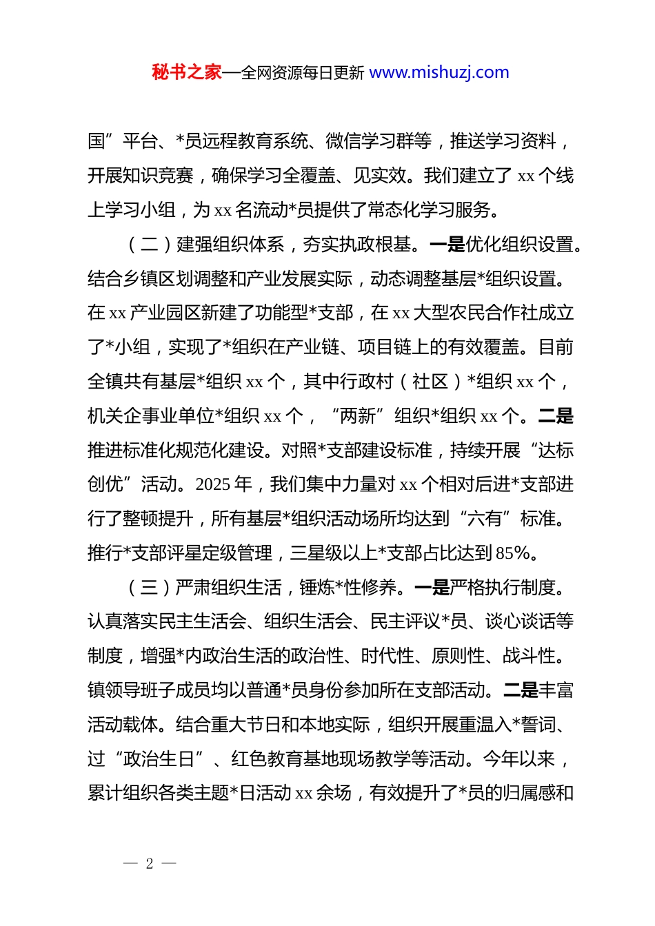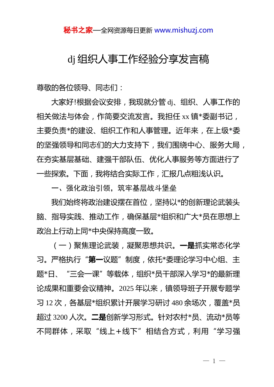 秘书之家—全网资源每日更新 www.mishuzj.comdj 组织人事工作经验分享发言稿尊敬的各位领导、同志们:大家好!根据会议安排,我现就分管 dj、组织、人事工作的相关做法与体会,作简要交流发言。我担任 xx 镇*委副书记,主要负责*的建设、组织工作和人事管理。近年来,在上级*委的坚强领导和同志们的大力支持下,我们围绕中心、服务大局,在夯实基层基础、建强干部队伍、优化人事服务等方面进行了一些探索。下面,我将结合实际工作,汇报几点粗浅认识。一、强化政治引领,筑牢基层战斗堡垒我们始终将政治建设摆在首位,坚持以*的创新理论武装头脑、指导实践、推动工作,确保基层*组织和广大*员在思想上政治上行动上同*中央保持高度一致。(一)聚焦理论武装,凝聚思想共识。一是抓实常态化学习。严格执行“第一议题”制度,依托*委理论学习中心组、主题*日、“三会一课”等载体,组织*员干部深入学习*的最新理论成果和重要会议精神。2025 年以来,镇领导班子开展专题学习 12 次,各基层*组织累计开展学习研讨 480 余场次,覆盖*员超过 3200 人次。二是创新学习形式。针对农村*员、流动*员等不同群体,采取“线上+线下”相结合方式,利用“学习强— 1 —秘书之家—全网资源每日更新 www.mishuzj.com国”平台、*员远程教育系统、微信学习群等,推送学习资料,开展知识竞赛,确保学习全覆盖、见实效。我们建立了 xx 个线上学习小组,为 xx 名流动*员提供了常态化学习服务。(二)建强组织体系,夯实执政根基。一是优化组织设置。结合乡镇区划调整和产业发展实际,动态调整基层*组织设置。在 xx 产业园区新建了功能型*支部,在 xx 大型农民合作社成立了*小组,实现了*组织在产业链、项目链上的有效覆盖。目前全镇共有基层*组织 xx 个,其中行政村(社区)*组织 xx 个,机关企事业单位*组织 xx 个,“两新”组织*组织 xx 个。二是推进标准化规范化建设。对照*支部建设标准,持续开展“达标创优”活动。2025 年,我们集中力量对 xx 个相对后进*支部进行了整顿提升,所有基层*组织活动场所均达到“六有”标准。推行*支部评星定级管理,三星级以上*支部占比达到 85%。(三)严肃组织生活,锤炼*性修养。一是严格执行制度。认真落实民主生活会、组织生活会、民主评议*员、谈心谈话等制度,增强*内政治生活的政治性、时代性、原则性、战斗性。镇领导班子成员均以普通*员身份参加所在支部活动。二是丰富活动载体。结合重大节日和本地实际,组织开展重温入*誓词、过“政治生日”、红色教育基地现场教学等活动。今年以来,累计组织各类主题*日活动 xx 余场,有效提升了*员的归属感和— 2 —秘书之家—全网资源每日更新 www.mishuzj.com使命感。二、抓实组织工作,锻造过硬骨干队伍我们坚持*管干部原则,树立鲜明用人导向,着力建设一支忠诚干净担当的高素质专业化干部队伍,为乡镇发展提供坚强组织保证。(一)树立正确导向,精准选人用人。一是突出政治标准。在干部选拔任用中,始终把政治标准放在第一位,深入考察干部的政治忠诚、政治定力、政治担当、政治能力、政治自律。2025 年,在村(社区)“两委”换届和镇中层干部调整中,我们对所有考察对象均进行了政治素质专项测评。二是注重实干实绩。建立一线考察识别干部机制,围绕乡村振兴、项目建设、基层治理、应急处突等重点工作,跟踪了解干部的现实表现。今年以来,从急难险重任务一线提拔或进一步使用干部 xx 名,树立了“有为者有位”的鲜明导向。三是优化班子结构。综合考虑年龄、学历、专业、经历等因素,不断优化领导班子和干部队伍结构。目前,镇机关“85 后”年轻干部占比达到 35%,村(社区)*组织书记中致富带头人、返乡创业人员比例超过60%。(二)加强培养锻炼,提升能力素质。一是实施精准培训。围绕高质量发展需要,制定年度干部教育培训计划。2025 年,— 3 —秘书之家—全网资源每日更新 www.mishuzj.com举办各类专题培训班 xx 期,培训干部 xx 人次,内容涵盖基层dj、乡村振兴、法律法规、应急处置等。与 xx*校合作,开设“周末课堂”,利用线上平台开展“云培训”...