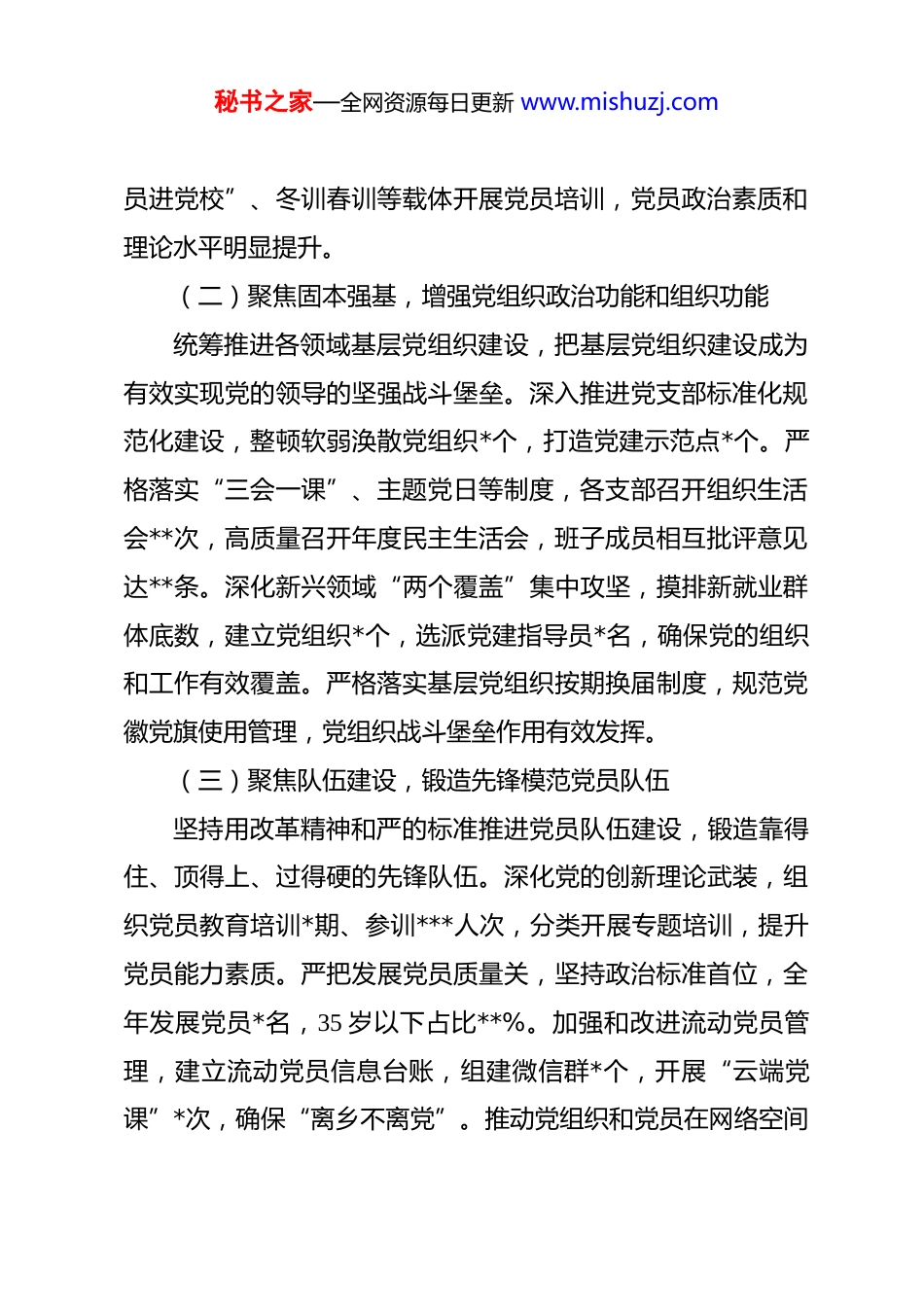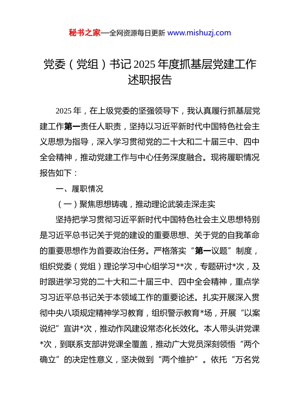 秘书之家—全网资源每日更新 www.mishuzj.com党委(党组)书记 2025 年度抓基层党建工作述职报告 2025 年,在上级党委的坚强领导下,我认真履行抓基层党建工作第一责任人职责,坚持以习近平新时代中国特色社会主义思想为指导,深入学习贯彻党的二十大和二十届三中、四中全会精神,推动党建工作与中心任务深度融合。现将履职情况报告如下:一、履职情况(一)聚焦思想铸魂,推动理论武装走深走实坚持把学习贯彻习近平新时代中国特色社会主义思想特别是习近平总书记关于党的建设的重要思想、关于党的自我革命的重要思想作为首要政治任务。严格落实“第一议题”制度,组织党委(党组)理论学习中心组学习**次,专题研讨*次,及时跟进学习党的二十大和二十届三中、四中全会精神,重点学习习近平总书记关于本领域工作的重要论述。扎实开展深入贯彻中央八项规定精神学习教育,组织警示教育*场,开展“以案说纪”宣讲*次,推动作风建设常态化长效化。本人带头讲党课*次,到联系支部讲党课全覆盖,推动广大党员深刻领悟“两个确立”的决定性意义,坚决做到“两个维护”。依托“万名党秘书之家—全网资源每日更新 www.mishuzj.com员进党校”、冬训春训等载体开展党员培训,党员政治素质和理论水平明显提升。(二)聚焦固本强基,增强党组织政治功能和组织功能统筹推进各领域基层党组织建设,把基层党组织建设成为有效实现党的领导的坚强战斗堡垒。深入推进党支部标准化规范化建设,整顿软弱涣散党组织*个,打造党建示范点*个。严格落实“三会一课”、主题党日等制度,各支部召开组织生活会**次,高质量召开年度民主生活会,班子成员相互批评意见达**条。深化新兴领域“两个覆盖”集中攻坚,摸排新就业群体底数,建立党组织*个,选派党建指导员*名,确保党的组织和工作有效覆盖。严格落实基层党组织按期换届制度,规范党徽党旗使用管理,党组织战斗堡垒作用有效发挥。(三)聚焦队伍建设,锻造先锋模范党员队伍坚持用改革精神和严的标准推进党员队伍建设,锻造靠得住、顶得上、过得硬的先锋队伍。深化党的创新理论武装,组织党员教育培训*期、参训***人次,分类开展专题培训,提升党员能力素质。严把发展党员质量关,坚持政治标准首位,全年发展党员*名,35 岁以下占比**%。加强和改进流动党员管理,建立流动党员信息台账,组建微信群*个,开展“云端党课”*次,确保“离乡不离党”。推动党组织和党员在网络空间秘书之家—全网资源每日更新 www.mishuzj.com发挥作用,组建网络宣传志愿队伍,引导党员发挥正能量。设立党员示范岗*个、党员责任区*个,开展“党员户”挂牌亮身份行动,党员先锋模范作用充分发挥。(四)聚焦责任落实,推动全面从严治党向纵深发展切实履行第一责任人职责,以上率下、示范带动各级党组织书记种好“党建责任田”。制定年度党建工作要点和责任清单,与基层党组织书记签订责任书,形成一级抓一级、层层抓落实的工作格局。落实党风廉政建设责任制,开展廉政谈话**人次,运用“第一种形态”处理*人次,加强对党员干部特别是关键岗位人员的监督管理。落实意识形态工作责任制,召开专题分析研判会议*次,开展阵地检查*次,牢牢掌握意识形态工作领导权。全年主持召开党委(党组)会议研究党建工作**次,开展党建专项督查*次,建立问题台账并督促整改落实。二、存在的主要问题对照上级要求和述职重点内容,认真检视反思,工作中还存在以下突出问题:(一)理论学习与推动实践结合不够紧密一是学习深度不够。对习近平总书记关于党的建设的重要思想、关于党的自我革命的重要思想学习还停留在一般了解层面,没有真正做到学深悟透、融会贯通。二是学习覆盖不全。秘书之家—全网资源每日更新 www.mishuzj.com深入贯彻中央八项规定精神学习教育向基层延伸不够,部分党员参学率不高,对作风建设常态化长效化要求理解不够深入。三是学用转化不足。理论学习对指导工作实践的作用发挥不够充分,存在学用“两张皮”现象。(二)各领域党组织建设发展不够均衡一是基层党组织建设质量参差不齐。个别党支部政治功能和组织功能发挥不够充分,“三会一课”等组织生活质量不高,存在...