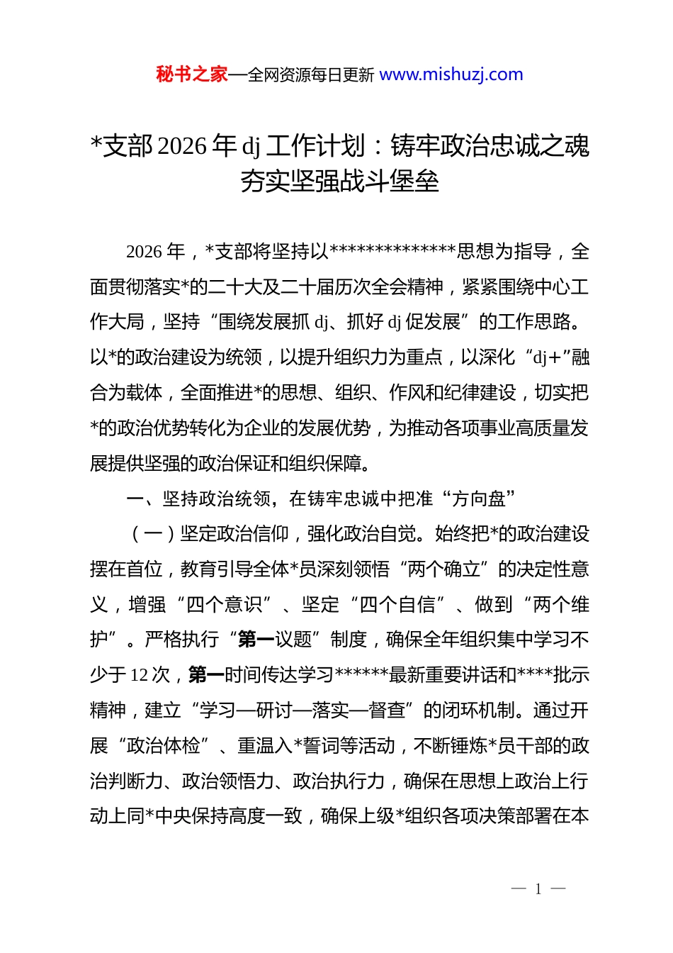 秘书之家—全网资源每日更新 www.mishuzj.com*支部 2026 年 dj 工作计划:铸牢政治忠诚之魂夯实坚强战斗堡垒2026 年,*支部将坚持以**************思想为指导,全面贯彻落实*的二十大及二十届历次全会精神,紧紧围绕中心工作大局,坚持“围绕发展抓 dj、抓好 dj 促发展”的工作思路。以*的政治建设为统领,以提升组织力为重点,以深化“dj+”融合为载体,全面推进*的思想、组织、作风和纪律建设,切实把*的政治优势转化为企业的发展优势,为推动各项事业高质量发展提供坚强的政治保证和组织保障。一、坚持政治统领,在铸牢忠诚中把准“方向盘”(一)坚定政治信仰,强化政治自觉。始终把*的政治建设摆在首位,教育引导全体*员深刻领悟“两个确立”的决定性意义,增强“四个意识”、坚定“四个自信”、做到“两个维护”。严格执行“第一议题”制度,确保全年组织集中学习不少于 12 次,第一时间传达学习******最新重要讲话和****批示精神,建立“学习—研讨—落实—督查”的闭环机制。通过开展“政治体检”、重温入*誓词等活动,不断锤炼*员干部的政治判断力、政治领悟力、政治执行力,确保在思想上政治上行动上同*中央保持高度一致,确保上级*组织各项决策部署在本— 1 —秘书之家—全网资源每日更新 www.mishuzj.com支部不折不扣落地生根。(二)严肃*内生活,净化政治生态。严格执行《关于新形势下*内政治生活的若干准则》,认真落实民主集中制,凡属重大问题、重要事项一律经支委会集体研究决定,提高决策的科学化、民主化水平。高质量召开组织生活会,用好批评与自我批评这一锐利武器,确保“辣味”十足、见筋见骨,杜绝以工作建议代替批评意见。严格落实谈心谈话制度,支部书记与班子成员、班子成员与*员、*员与*员之间每年谈心谈话不少于 2次,及时了解思想动态,疏导情绪、化解矛盾。建立*员思想动态分析研判机制,每季度开展一次专题分析,把苗头性倾向性问题消灭在萌芽状态,营造风清气正的政治环境。(三)压实主体责任,强化政治担当。细化制定《2026 年*支部全面从严治*主体责任清单》,明确支部书记“第一责任人”责任和班子成员“一岗双责”,形成一级抓一级、层层抓落实的责任链条。推行“清单式”管理和“项目化”推进,将全年 dj 工作细化为 4 大类 25 项具体任务,明确责任人、完成时限和验收标准,实行挂图作战、销号管理。建立季度督查通报机制,对落实不力、进展缓慢的责任人进行约谈提醒。把抓 dj工作情况作为年度绩效考核的重要内容,加大考核权重,真正把“软指标”变为“硬约束”,推动管*治*责任全面覆盖、层— 2 —秘书之家—全网资源每日更新 www.mishuzj.com层传导。二、深化理论武装,在凝心铸魂中点亮“长明灯”(一)完善学习体系,筑牢思想根基。深入实施“铸魂工程”,制定年度系统学习计划,采取“集中学+自主学”“线上学+线下学”相结合的方式,推动理论武装走深走实。依托“三会一课”、主题*日等载体,深入研读《***谈治国理政》等权威读本,原原本本学、逐字逐句悟。充分利用“学习强国”、干部网络学院等数字化平台,打造“指尖课堂”,确保*员参学率达到 100%。全年举办不少于 4 期“读书班”或专题研讨会,组织*员围绕新质生产力、深化改革等主题开展交流研讨,切实把学习成果转化为指导实践、推动工作的强大动力。(二)丰富教育载体,提升宣教实效。改变过去“一人讲、大家听”的灌输式教育模式,推行“微*课”“情景*课”“实境课堂”等创新形式。全年组织*员赴红色教育基地开展现场教学不少于 2 次,通过追寻红色足迹、聆听革命故事,接受精神洗礼。开展“*员讲坛”活动,鼓励普通*员走上讲台,结合自身岗位实际谈体会、讲经验、话担当,变“被动接受”为“主动输出”。组建“理论宣讲轻骑兵”,深入车间班组、项目一线开展分众化、互动式宣讲,用通俗易懂的语言把*的创新理论讲深讲透,让*的声音“飞入寻常百姓家”,增强理论教育的吸— 3 —秘书之家—全网资源每日更新 www.mishuzj.com引力和感染力。(三)注重学用结合,推动成果转化。坚持学思用贯通、知信行统一,坚决防止“两张皮”现象...
