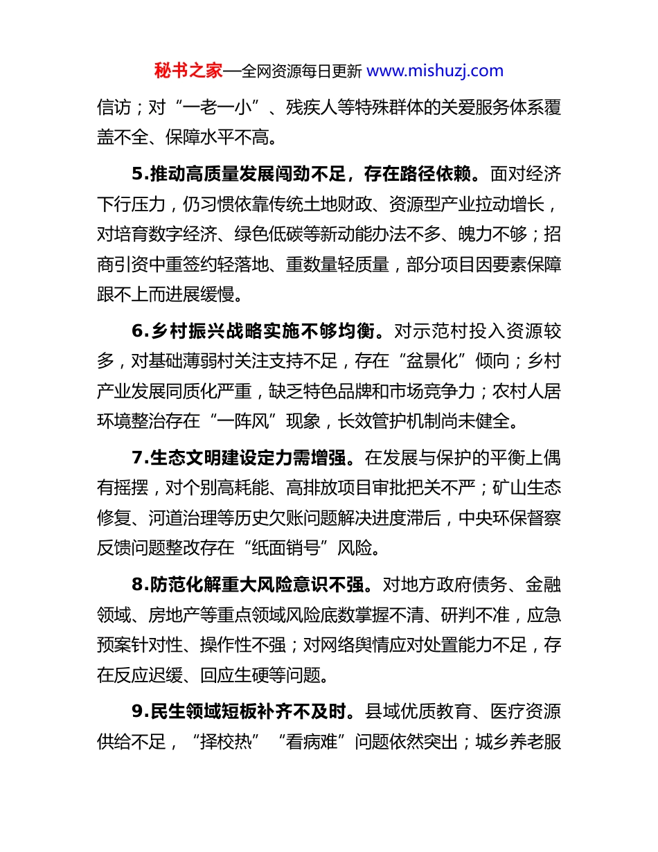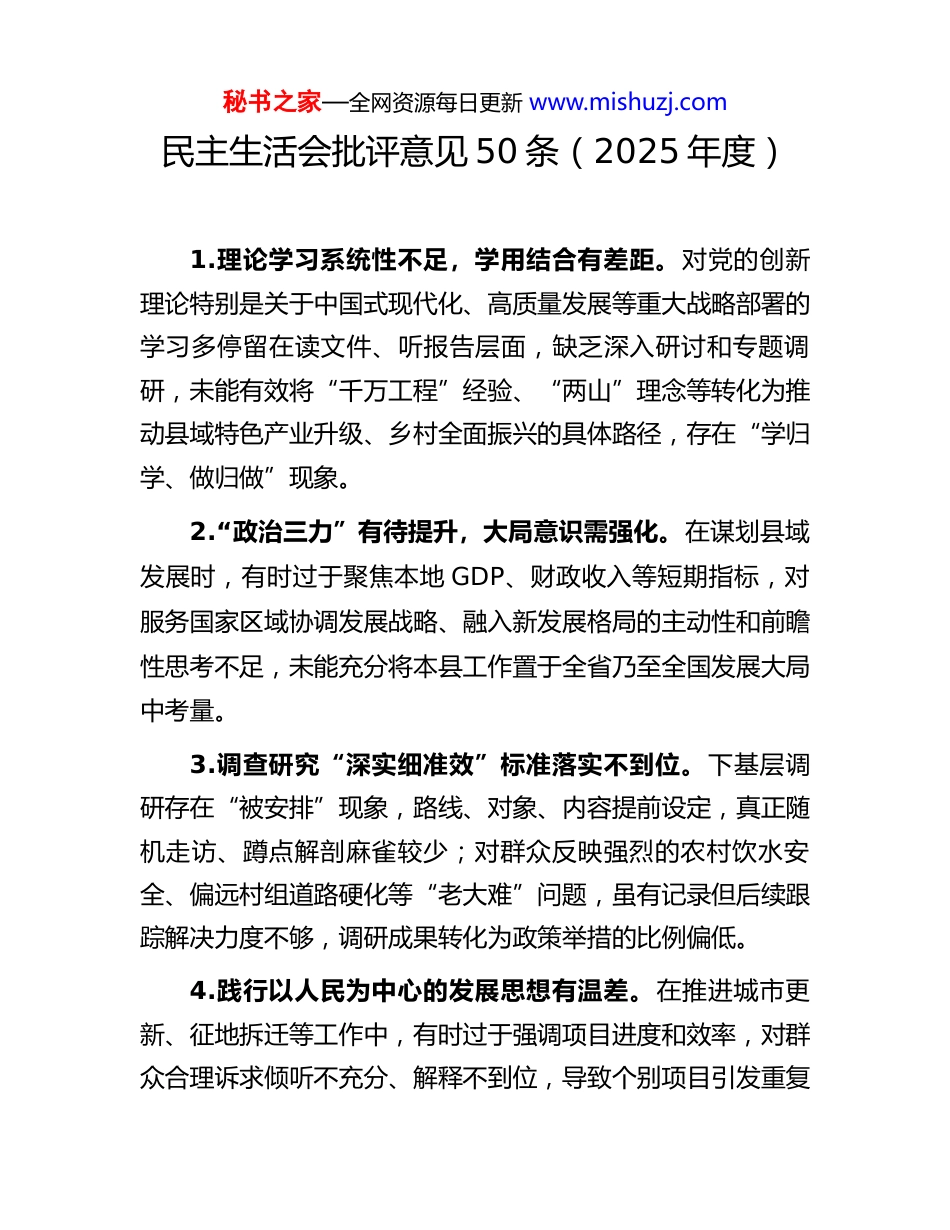 秘书之家—全网资源每日更新 www.mishuzj.com民主生活会批评意见 50 条(2025 年度)1.理论学习系统性不足,学用结合有差距。对党的创新理论特别是关于中国式现代化、高质量发展等重大战略部署的学习多停留在读文件、听报告层面,缺乏深入研讨和专题调研,未能有效将“千万工程”经验、“两山”理念等转化为推动县域特色产业升级、乡村全面振兴的具体路径,存在“学归学、做归做”现象。2.“政治三力”有待提升,大局意识需强化。在谋划县域发展时,有时过于聚焦本地 GDP、财政收入等短期指标,对服务国家区域协调发展战略、融入新发展格局的主动性和前瞻性思考不足,未能充分将本县工作置于全省乃至全国发展大局中考量。3.调查研究“深实细准效”标准落实不到位。下基层调研存在“被安排”现象,路线、对象、内容提前设定,真正随机走访、蹲点解剖麻雀较少;对群众反映强烈的农村饮水安全、偏远村组道路硬化等“老大难”问题,虽有记录但后续跟踪解决力度不够,调研成果转化为政策举措的比例偏低。4.践行以人民为中心的发展思想有温差。在推进城市更新、征地拆迁等工作中,有时过于强调项目进度和效率,对群众合理诉求倾听不充分、解释不到位,导致个别项目引发重复秘书之家—全网资源每日更新 www.mishuzj.com信访;对“一老一小”、残疾人等特殊群体的关爱服务体系覆盖不全、保障水平不高。5.推动高质量发展闯劲不足,存在路径依赖。面对经济下行压力,仍习惯依靠传统土地财政、资源型产业拉动增长,对培育数字经济、绿色低碳等新动能办法不多、魄力不够;招商引资中重签约轻落地、重数量轻质量,部分项目因要素保障跟不上而进展缓慢。6.乡村振兴战略实施不够均衡。对示范村投入资源较多,对基础薄弱村关注支持不足,存在“盆景化”倾向;乡村产业发展同质化严重,缺乏特色品牌和市场竞争力;农村人居环境整治存在“一阵风”现象,长效管护机制尚未健全。7.生态文明建设定力需增强。在发展与保护的平衡上偶有摇摆,对个别高耗能、高排放项目审批把关不严;矿山生态修复、河道治理等历史欠账问题解决进度滞后,中央环保督察反馈问题整改存在“纸面销号”风险。8.防范化解重大风险意识不强。对地方政府债务、金融领域、房地产等重点领域风险底数掌握不清、研判不准,应急预案针对性、操作性不强;对网络舆情应对处置能力不足,存在反应迟缓、回应生硬等问题。9.民生领域短板补齐不及时。县域优质教育、医疗资源供给不足,“择校热”“看病难”问题依然突出;城乡养老服秘书之家—全网资源每日更新 www.mishuzj.com务设施布局不合理,农村互助幸福院运营难以为继;就业结构性矛盾凸显,高校毕业生、农民工等群体就业帮扶措施精准度不够。10.作风建设韧劲不足,形式主义隐形变异。会议、文件数量虽有控制,但“以会议落实会议”现象仍存;督查检查考核过多过频,基层疲于应付台账报表;部分干部存在“躺平”心态,面对复杂矛盾绕道走、推拖躲。11.担当作为精神有所弱化。在啃“硬骨头”、接“烫手山芋”时存在畏难情绪,如对历史遗留的烂尾楼处置、集体资产权属纠纷等难题,缺乏攻坚克难的硬招实招;面对急难险重任务时,个别班子成员存在“等靠要”思想。12.民主集中制执行不够严格。在“三重一大”事项决策中,有时会前酝酿沟通不充分,会上讨论不深入,存在“一把手”定调过早或班子成员随声附和现象;对专业性较强的议题,未能充分听取专家、群众代表意见。13.选人用人导向需进一步鲜明。干部选拔中有时过于看重资历、平衡关系,对敢闯敢试、实绩突出的年轻干部压担子、给平台不够;干部日常考核评价体系科学性不足,未能有效激励干部担当作为。14.基层党建存在薄弱环节。对农村、非公企业等基层党组织指导帮扶不够,部分村党组织带头人能力不强、后备力量秘书之家—全网资源每日更新 www.mishuzj.com不足;党建与业务“两张皮”问题仍未根本解决,党组织战斗堡垒作用发挥不充分。15.意识形态工作责任制落实有盲区。对新媒体阵地管理重视不够,对网络谣言、错误思潮的监测预警和引导处置能力不足;新时代文明实践中心(所、站)作用发挥不充分,群众参与度不高。16.全面...