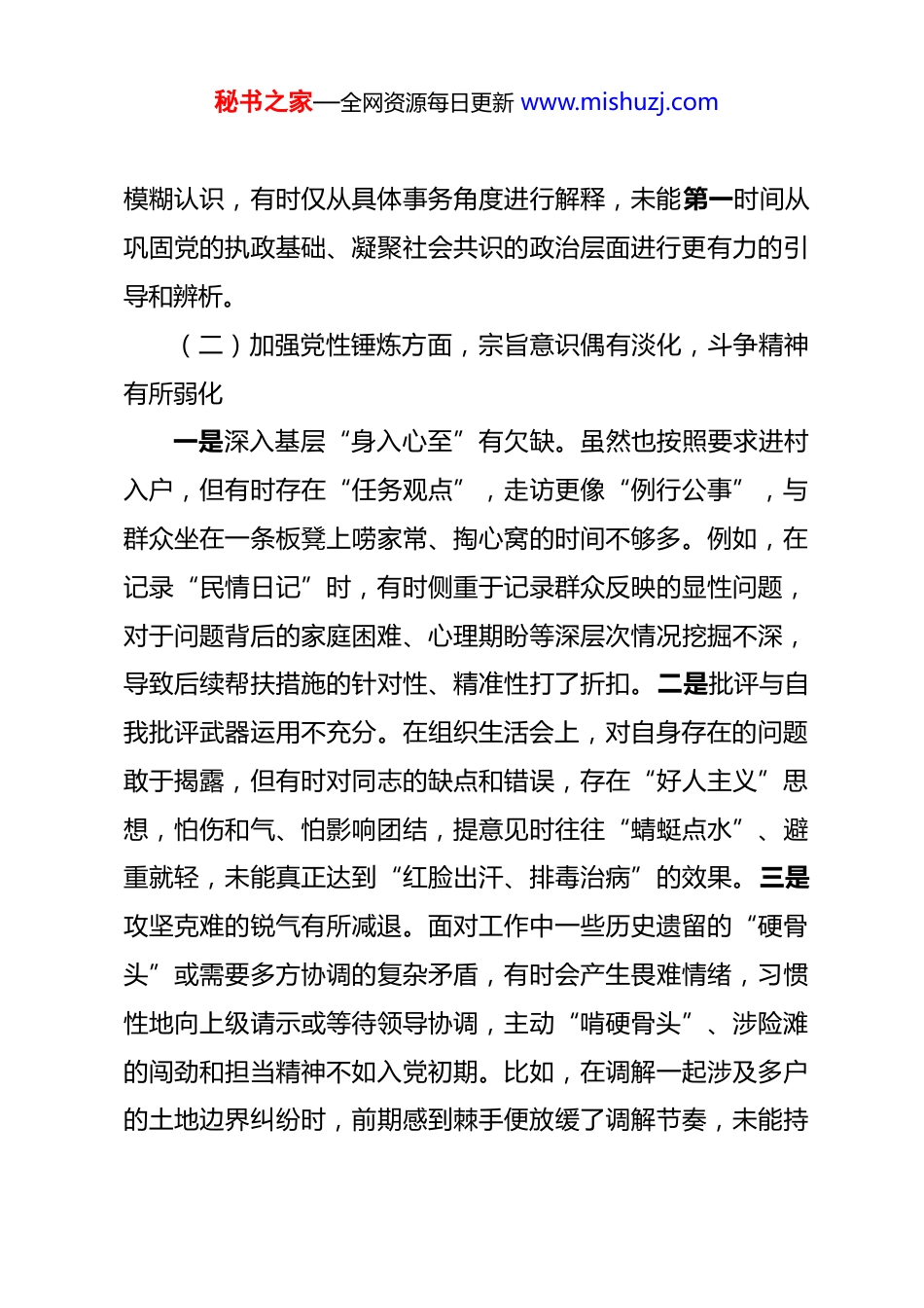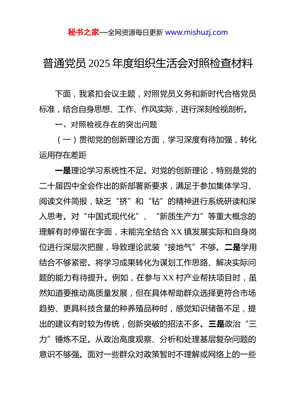 秘书之家—全网资源每日更新 www.mishuzj.com普通党员 2025 年度组织生活会对照检查材料 下面,我紧扣会议主题,对照党员义务和新时代合格党员标准,结合自身思想、工作、作风实际,进行深刻检视剖析。一、对照检视存在的突出问题(一)贯彻党的创新理论方面,学习深度有待加强,转化运用存在差距一是理论学习系统性不足。对党的创新理论,特别是党的二十届四中全会作出的新部署新要求,满足于参加集体学习、阅读文件简报,缺乏“挤”和“钻”的精神进行系统研读和深入思考。对“中国式现代化”、“新质生产力”等重大概念的理解有时停留在字面,未能完全结合 XX 镇发展实际和自身岗位进行深层次把握,导致理论武装“接地气”不够。二是学用结合不够紧密。将学习成果转化为谋划工作思路、解决实际问题的能力有待提升。例如,在参与 XX 村产业帮扶项目时,虽然知道要推动高质量发展,但在具体帮助群众选择更符合市场趋势、更具科技含量的种养殖品种时,感觉知识储备不足,提出的建议有时较为传统,创新突破的招法不多。三是政治“三力”锤炼不足。从政治高度观察、分析和处理基层复杂问题的意识不够强。面对一些群众对政策暂时不理解或网络上的一些秘书之家—全网资源每日更新 www.mishuzj.com模糊认识,有时仅从具体事务角度进行解释,未能第一时间从巩固党的执政基础、凝聚社会共识的政治层面进行更有力的引导和辨析。(二)加强党性锤炼方面,宗旨意识偶有淡化,斗争精神有所弱化一是深入基层“身入心至”有欠缺。虽然也按照要求进村入户,但有时存在“任务观点”,走访更像“例行公事”,与群众坐在一条板凳上唠家常、掏心窝的时间不够多。例如,在记录“民情日记”时,有时侧重于记录群众反映的显性问题,对于问题背后的家庭困难、心理期盼等深层次情况挖掘不深,导致后续帮扶措施的针对性、精准性打了折扣。二是批评与自我批评武器运用不充分。在组织生活会上,对自身存在的问题敢于揭露,但有时对同志的缺点和错误,存在“好人主义”思想,怕伤和气、怕影响团结,提意见时往往“蜻蜓点水”、避重就轻,未能真正达到“红脸出汗、排毒治病”的效果。三是攻坚克难的锐气有所减退。面对工作中一些历史遗留的“硬骨头”或需要多方协调的复杂矛盾,有时会产生畏难情绪,习惯性地向上级请示或等待领导协调,主动“啃硬骨头”、涉险滩的闯劲和担当精神不如入党初期。比如,在调解一起涉及多户的土地边界纠纷时,前期感到棘手便放缓了调解节奏,未能持秘书之家—全网资源每日更新 www.mishuzj.com续紧盯、多方斡旋直至彻底解决。(三)联系服务群众方面,情感纽带不够牢固,服务效能有待提升一是主动服务意识不强。坐等群众上门多,主动发现群众需求少。对于职责范围内的事务能够及时办理,但对于群众可能面临但未明确提出的潜在困难,缺乏前瞻性的关切和行动。比如,在负责 XX 片区民政信息核查时,主要是核对上报材料,较少主动走访摸排是否存在符合政策但未申报的“沉默的少数”。二是解决诉求能力有短板。对于群众反映的一些涉及政策边缘或需要跨部门协调的复杂诉求,有时解释政策多,帮助寻找具体解决路径少,存在“本领恐慌”。曾有一位群众咨询关于小额创业贷款与产业扶持政策叠加的具体操作流程,我未能当场给出清晰指引,事后多方咨询才予以回复,效率不高。三是群众工作方法简单。与群众沟通时,有时过于依赖讲政策、讲道理,未能充分运用群众喜闻乐见的语言和易于接受的方式。在宣传秸秆禁烧等政策时,一度主要依靠张贴公告和广播通知,后来看到其他同事通过院坝会、方言顺口溜等方式效果更好,才意识到自身方法的不足。(四)发挥先锋模范作用方面,标杆作用不突出,日常表率有落差秘书之家—全网资源每日更新 www.mishuzj.com一是岗位履职“精细化”不够。满足于完成领导交办的任务和常规工作,但在工作的“精、细、实”上标准不高。例如,在整理报送各类报表数据时,有时仅确保数据准确,但对数据背后反映的深层次问题分析不够,未能提出有价值的建议,将岗位作为发挥作用“主阵地”的意识有待强化。二是急难险重冲在前不够。在参与镇里组织的防汛应急演练...
