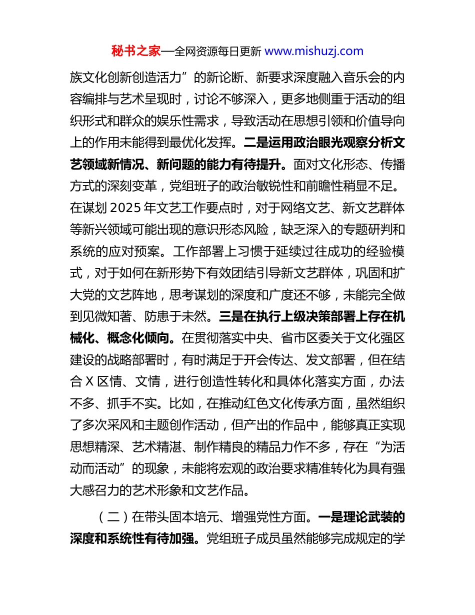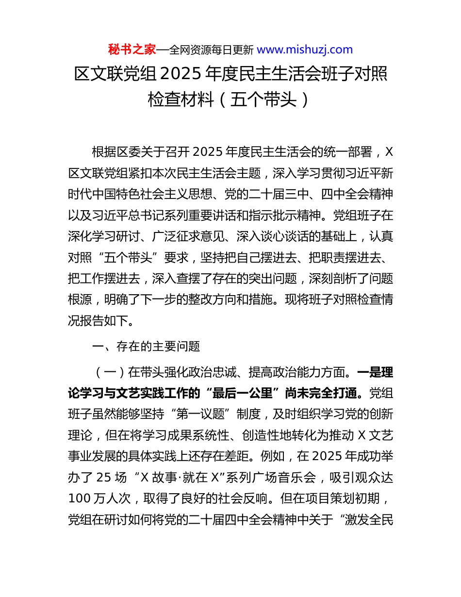 秘书之家—全网资源每日更新 www.mishuzj.com区文联党组 2025 年度民主生活会班子对照检查材料(五个带头)根据区委关于召开 2025 年度民主生活会的统一部署,X区文联党组紧扣本次民主生活会主题,深入学习贯彻习近平新时代中国特色社会主义思想、党的二十届三中、四中全会精神以及习近平总书记系列重要讲话和指示批示精神。党组班子在深化学习研讨、广泛征求意见、深入谈心谈话的基础上,认真对照“五个带头”要求,坚持把自己摆进去、把职责摆进去、把工作摆进去,深入查摆了存在的突出问题,深刻剖析了问题根源,明确了下一步的整改方向和措施。现将班子对照检查情况报告如下。一、存在的主要问题(一)在带头强化政治忠诚、提高政治能力方面。一是理论学习与文艺实践工作的“最后一公里”尚未完全打通。党组班子虽然能够坚持“第一议题”制度,及时组织学习党的创新理论,但在将学习成果系统性、创造性地转化为推动 X 文艺事业发展的具体实践上还存在差距。例如,在 2025 年成功举办了 25 场“X 故事·就在 X”系列广场音乐会,吸引观众达100 万人次,取得了良好的社会反响。但在项目策划初期,党组在研讨如何将党的二十届四中全会精神中关于“激发全民秘书之家—全网资源每日更新 www.mishuzj.com族文化创新创造活力”的新论断、新要求深度融入音乐会的内容编排与艺术呈现时,讨论不够深入,更多地侧重于活动的组织形式和群众的娱乐性需求,导致活动在思想引领和价值导向上的作用未能得到最优化发挥。二是运用政治眼光观察分析文艺领域新情况、新问题的能力有待提升。面对文化形态、传播方式的深刻变革,党组班子的政治敏锐性和前瞻性稍显不足。在谋划 2025 年文艺工作要点时,对于网络文艺、新文艺群体等新兴领域可能出现的意识形态风险,缺乏深入的专题研判和系统的应对预案。工作部署上习惯于延续过往成功的经验模式,对于如何在新形势下有效团结引导新文艺群体,巩固和扩大党的文艺阵地,思考谋划的深度和广度还不够,未能完全做到见微知著、防患于未然。三是在执行上级决策部署上存在机械化、概念化倾向。在贯彻落实中央、省市区委关于文化强区建设的战略部署时,有时满足于开会传达、发文部署,但在结合 X 区情、文情,进行创造性转化和具体化落实方面,办法不多、抓手不实。比如,在推动红色文化传承方面,虽然组织了多次采风和主题创作活动,但产出的作品中,能够真正实现思想精深、艺术精湛、制作精良的精品力作不多,存在“为活动而活动”的现象,未能将宏观的政治要求精准转化为具有强大感召力的艺术形象和文艺作品。(二)在带头固本培元、增强党性方面。一是理论武装的深度和系统性有待加强。党组班子成员虽然能够完成规定的学秘书之家—全网资源每日更新 www.mishuzj.com习任务,但在“深学”和“细悟”上下的功夫还不够。理论学习有时停留在读原著、学原文的层面,围绕“如何解决好世界观、人生观、价值观这个总开关问题”等根本性问题开展的触及灵魂的研讨交流不多。比如,在筹备成立区作家协会、朗诵学会等新协会的过程中,党组层面的讨论更多聚焦于组织架构、人事安排等事务性工作,而对于如何通过新协会的成立,加强对广大会员的党性教育和思想淬炼,坚守共产党人精神追求,引导他们树立正确的文艺观,思考和谋划相对欠缺。二是运用批评和自我批评武器锤炼党性的自觉性不高。在党内政治生活中,有时存在“好人主义”思想,批评上级怕越位,批评同级怕伤和气,批评下级怕丢选票,自我批评则怕丢面子。在一些工作复盘总结会上,往往谈成绩多、摆问题少,讲客观原因多、剖析主观因素少,导致一些长期存在的作风问题、工作短板未能得到及时有力地纠正,党内政治生活的“炉火”烧得还不够旺。三是理想信念教育的融入和渗透方式较为单一。在加强文艺队伍思想建设的过程中主要依赖于会议、培训等传统方式,教育方式不够鲜活生动,吸引力和感染力不强。未能充分利用 X 丰富的红色文化资源和文艺工作的特殊性,将理想信念教育、党性修养要求有机融入文艺创作、展演交流的全过程,未能真正实现“春风化雨、润物无声”的引领效果。(三)在带头...