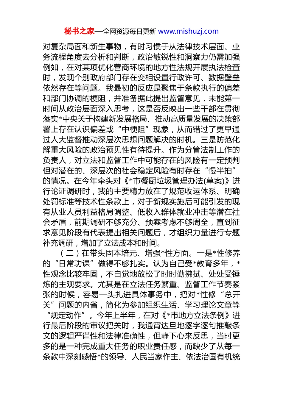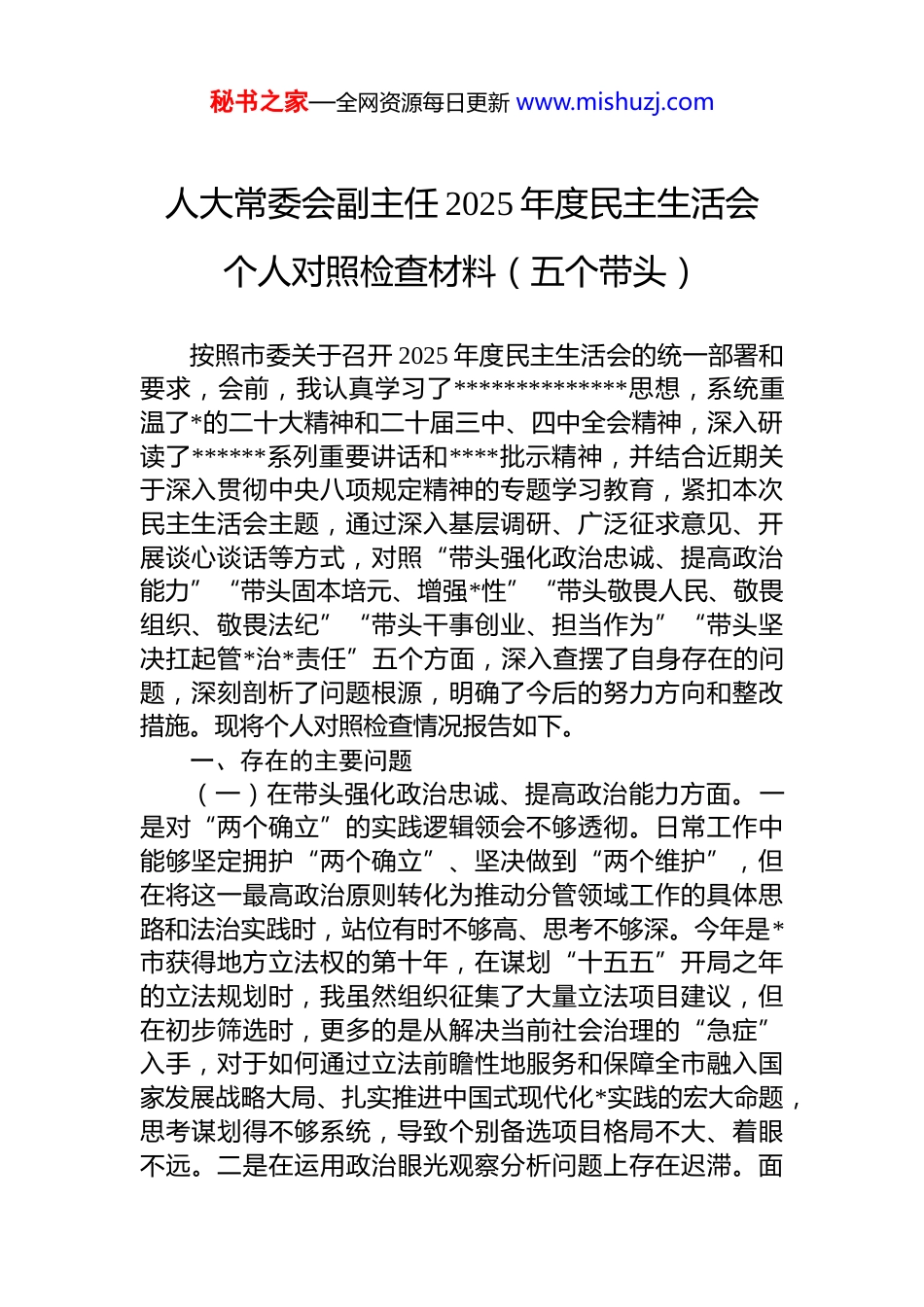 秘书之家—全网资源每日更新 www.mishuzj.com人大常委会副主任 2025 年度民主生活会个人对照检查材料(五个带头)按照市委关于召开 2025 年度民主生活会的统一部署和要求,会前,我认真学习了**************思想,系统重温了*的二十大精神和二十届三中、四中全会精神,深入研读了******系列重要讲话和****批示精神,并结合近期关于深入贯彻中央八项规定精神的专题学习教育,紧扣本次民主生活会主题,通过深入基层调研、广泛征求意见、开展谈心谈话等方式,对照“带头强化政治忠诚、提高政治能力”“带头固本培元、增强*性”“带头敬畏人民、敬畏组织、敬畏法纪”“带头干事创业、担当作为”“带头坚决扛起管*治*责任”五个方面,深入查摆了自身存在的问题,深刻剖析了问题根源,明确了今后的努力方向和整改措施。现将个人对照检查情况报告如下。一、存在的主要问题(一)在带头强化政治忠诚、提高政治能力方面。一是对“两个确立”的实践逻辑领会不够透彻。日常工作中能够坚定拥护“两个确立”、坚决做到“两个维护”,但在将这一最高政治原则转化为推动分管领域工作的具体思路和法治实践时,站位有时不够高、思考不够深。今年是*市获得地方立法权的第十年,在谋划“十五五”开局之年的立法规划时,我虽然组织征集了大量立法项目建议,但在初步筛选时,更多的是从解决当前社会治理的“急症”入手,对于如何通过立法前瞻性地服务和保障全市融入国家发展战略大局、扎实推进中国式现代化*实践的宏大命题,思考谋划得不够系统,导致个别备选项目格局不大、着眼不远。二是在运用政治眼光观察分析问题上存在迟滞。面秘书之家—全网资源每日更新 www.mishuzj.com对复杂局面和新生事物,有时习惯于从法律技术层面、业务流程角度去分析和判断,政治敏锐性和洞察力仍需加强例如,在对某项优化营商环境的地方性法规开展执法检查时,发现个别政府部门存在变相设置行政许可、数据壁垒依然存在等问题。我最初的反应是聚焦于条款执行的偏差和部门协调的梗阻,并准备据此提出监督意见,未能第一时间从政治层面深入思考,这是否反映出一些干部在贯彻落实*中央关于构建新发展格局、推动高质量发展的决策部署上存在认识偏差或“中梗阻”现象,从而错过了更早通过人大监督推动深层次思想问题解决的时机。三是防范化解重大风险的政治预见性有待提升。作为分管法制工作的负责人,对立法和监督工作中可能存在的风险有一定预判但对潜在的、深层次的社会稳定风险有时存在“慢半拍”的情况。在今年牵头对《*市餐厨垃圾管理办法(草案)》进行论证调研时,我的主要精力放在了规范收运体系、明确处罚标准等技术性条款上,对于新规实施后可能引发的现有从业人员利益格局调整、低收入群体就业冲击等潜在社会矛盾,前期调研不够充分、预案考虑不够周全,直到征求意见阶段有代表提出相关问题后,才组织力量进行专题补充调研,增加了立法成本和时间。(二)在带头固本培元、增强*性方面。一是*性修养的“日常功课”做得不够扎实。认为自己受*教育多年,*性观念比较牢固,不自觉地放松了时时勤拂拭、处处受锤炼的主观要求。尤其是在立法任务繁重、监督工作节奏紧张的时候,容易一头扎进具体事务中,把对*性修“总开关”问题的内省,简化为参加组织生活、学习理论文章等“规定动作”。今年上半年,在对《*市地方立法条例》进行最后阶段的审议把关时,我通宵达旦地逐字逐句推敲条文的逻辑严谨性和法律准确性,但静下心来反思,当时更多的是一种完成重大任务的职业责任感,而缺少了从每一条款中深刻感悟*的领导、人民当家作主、依法治国有机统秘书之家—全网资源每日更新 www.mishuzj.com一的*性自觉。二是在严肃*内政治生活上存在“好人主义”倾向。在参加常委会*组的民主生活会或分管委室的组织生活会时,开展批评与自我批评有时还不够“辣味”十足。自我批评时,谈工作问题多、谈思想根源少;相互批评时,出于维护班子团结和同志情谊的考虑,有时会选择比较委婉的语言,点到为止,对一些同志在作风方面存在的苗头性、倾向性问题,没有“一针见血”地指出来,担心话说重了影响同志间的工作关系,这种“与人为善”...