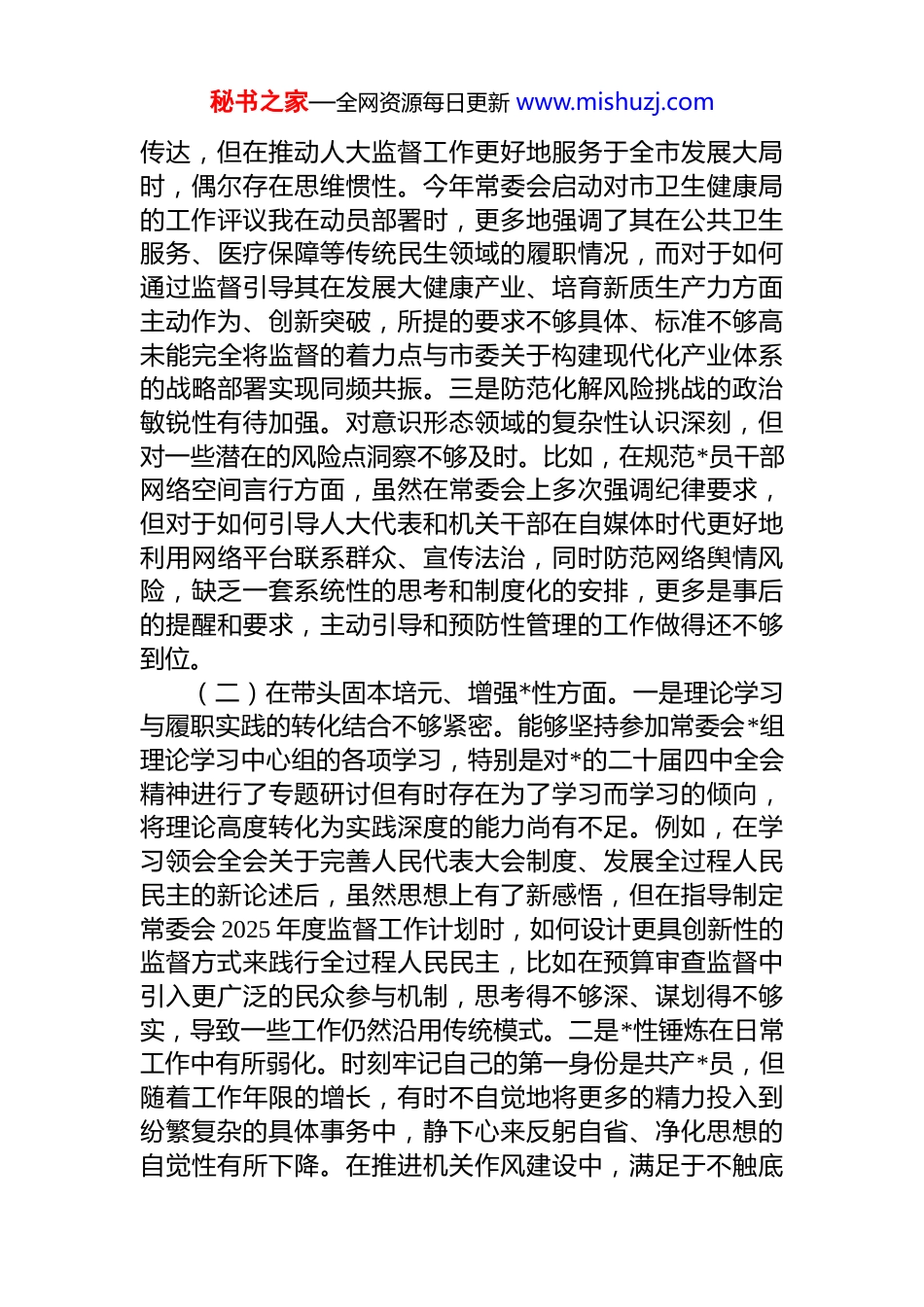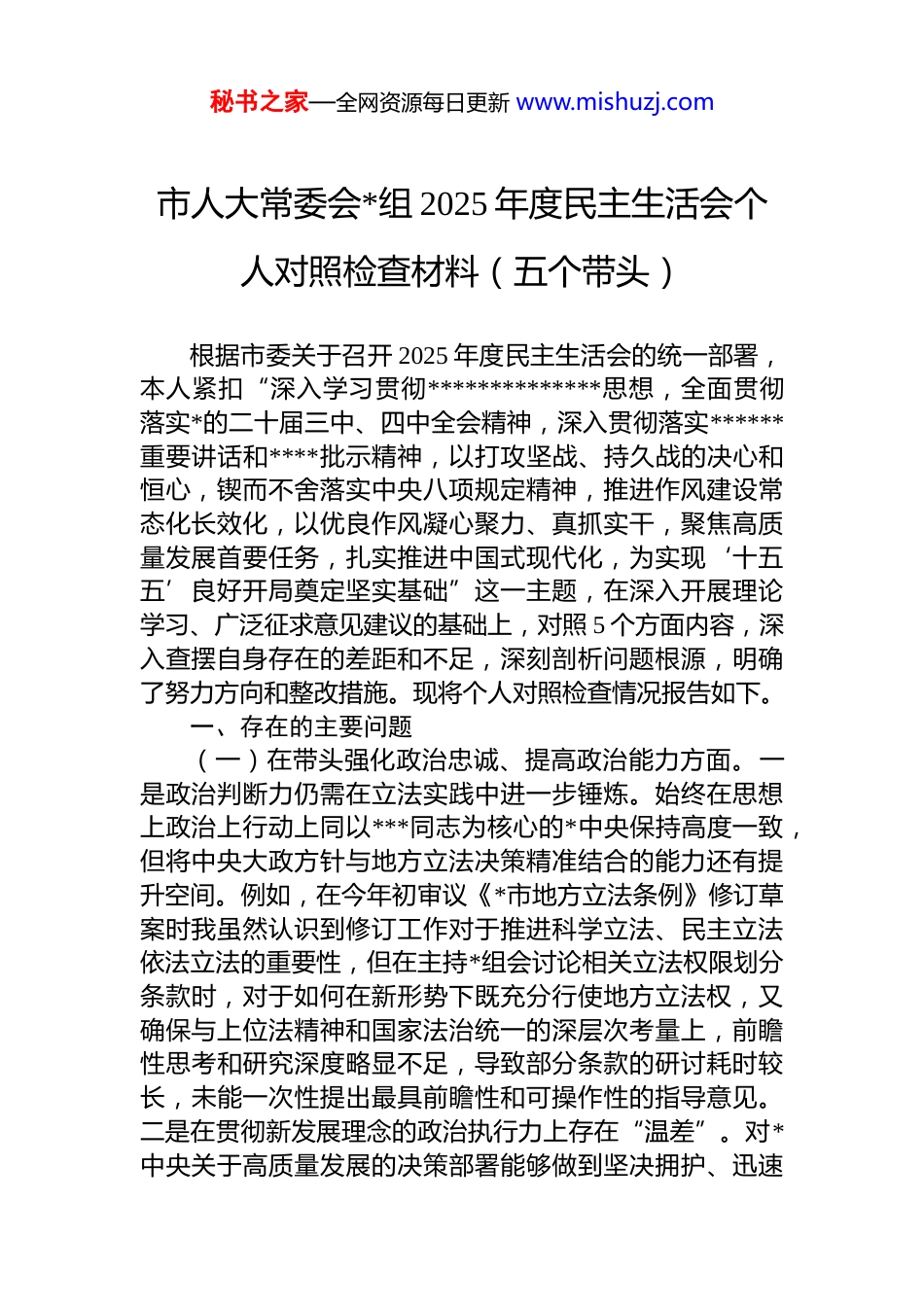 秘书之家—全网资源每日更新 www.mishuzj.com市人大常委会*组 2025 年度民主生活会个人对照检查材料(五个带头)根据市委关于召开 2025 年度民主生活会的统一部署,本人紧扣“深入学习贯彻**************思想,全面贯彻落实*的二十届三中、四中全会精神,深入贯彻落实******重要讲话和****批示精神,以打攻坚战、持久战的决心和恒心,锲而不舍落实中央八项规定精神,推进作风建设常态化长效化,以优良作风凝心聚力、真抓实干,聚焦高质量发展首要任务,扎实推进中国式现代化,为实现‘十五五’良好开局奠定坚实基础”这一主题,在深入开展理论学习、广泛征求意见建议的基础上,对照 5 个方面内容,深入查摆自身存在的差距和不足,深刻剖析问题根源,明确了努力方向和整改措施。现将个人对照检查情况报告如下。一、存在的主要问题(一)在带头强化政治忠诚、提高政治能力方面。一是政治判断力仍需在立法实践中进一步锤炼。始终在思想上政治上行动上同以***同志为核心的*中央保持高度一致,但将中央大政方针与地方立法决策精准结合的能力还有提升空间。例如,在今年初审议《*市地方立法条例》修订草案时我虽然认识到修订工作对于推进科学立法、民主立法依法立法的重要性,但在主持*组会讨论相关立法权限划分条款时,对于如何在新形势下既充分行使地方立法权,又确保与上位法精神和国家法治统一的深层次考量上,前瞻性思考和研究深度略显不足,导致部分条款的研讨耗时较长,未能一次性提出最具前瞻性和可操作性的指导意见。二是在贯彻新发展理念的政治执行力上存在“温差”。对*中央关于高质量发展的决策部署能够做到坚决拥护、迅速秘书之家—全网资源每日更新 www.mishuzj.com传达,但在推动人大监督工作更好地服务于全市发展大局时,偶尔存在思维惯性。今年常委会启动对市卫生健康局的工作评议我在动员部署时,更多地强调了其在公共卫生服务、医疗保障等传统民生领域的履职情况,而对于如何通过监督引导其在发展大健康产业、培育新质生产力方面主动作为、创新突破,所提的要求不够具体、标准不够高未能完全将监督的着力点与市委关于构建现代化产业体系的战略部署实现同频共振。三是防范化解风险挑战的政治敏锐性有待加强。对意识形态领域的复杂性认识深刻,但对一些潜在的风险点洞察不够及时。比如,在规范*员干部网络空间言行方面,虽然在常委会上多次强调纪律要求,但对于如何引导人大代表和机关干部在自媒体时代更好地利用网络平台联系群众、宣传法治,同时防范网络舆情风险,缺乏一套系统性的思考和制度化的安排,更多是事后的提醒和要求,主动引导和预防性管理的工作做得还不够到位。(二)在带头固本培元、增强*性方面。一是理论学习与履职实践的转化结合不够紧密。能够坚持参加常委会*组理论学习中心组的各项学习,特别是对*的二十届四中全会精神进行了专题研讨但有时存在为了学习而学习的倾向,将理论高度转化为实践深度的能力尚有不足。例如,在学习领会全会关于完善人民代表大会制度、发展全过程人民民主的新论述后,虽然思想上有了新感悟,但在指导制定常委会 2025 年度监督工作计划时,如何设计更具创新性的监督方式来践行全过程人民民主,比如在预算审查监督中引入更广泛的民众参与机制,思考得不够深、谋划得不够实,导致一些工作仍然沿用传统模式。二是*性锤炼在日常工作中有所弱化。时刻牢记自己的第一身份是共产*员,但随着工作年限的增长,有时不自觉地将更多的精力投入到纷繁复杂的具体事务中,静下心来反躬自省、净化思想的自觉性有所下降。在推进机关作风建设中,满足于不触底秘书之家—全网资源每日更新 www.mishuzj.com线、不碰红线,但在用更高标准、更严要求来砥砺初心、淬炼*性方面,自我加压不够。有时参加机关*支部组织生活,更多是以领导身份作指导、提要求,而以普通*员身份谈体会、作批评和自我批评的时候较少,未能很好地起到表率作用。三是为民情怀的践行深度有待拓展。始终坚持以人民为中心的发展思想,但在具体工作中,有时更多地关注普惠性、宏观性的民生问题,对一些特定群体、特殊困难的急难愁盼问题,发现和推动解决的力度还不够...