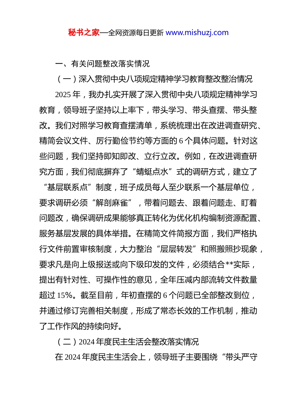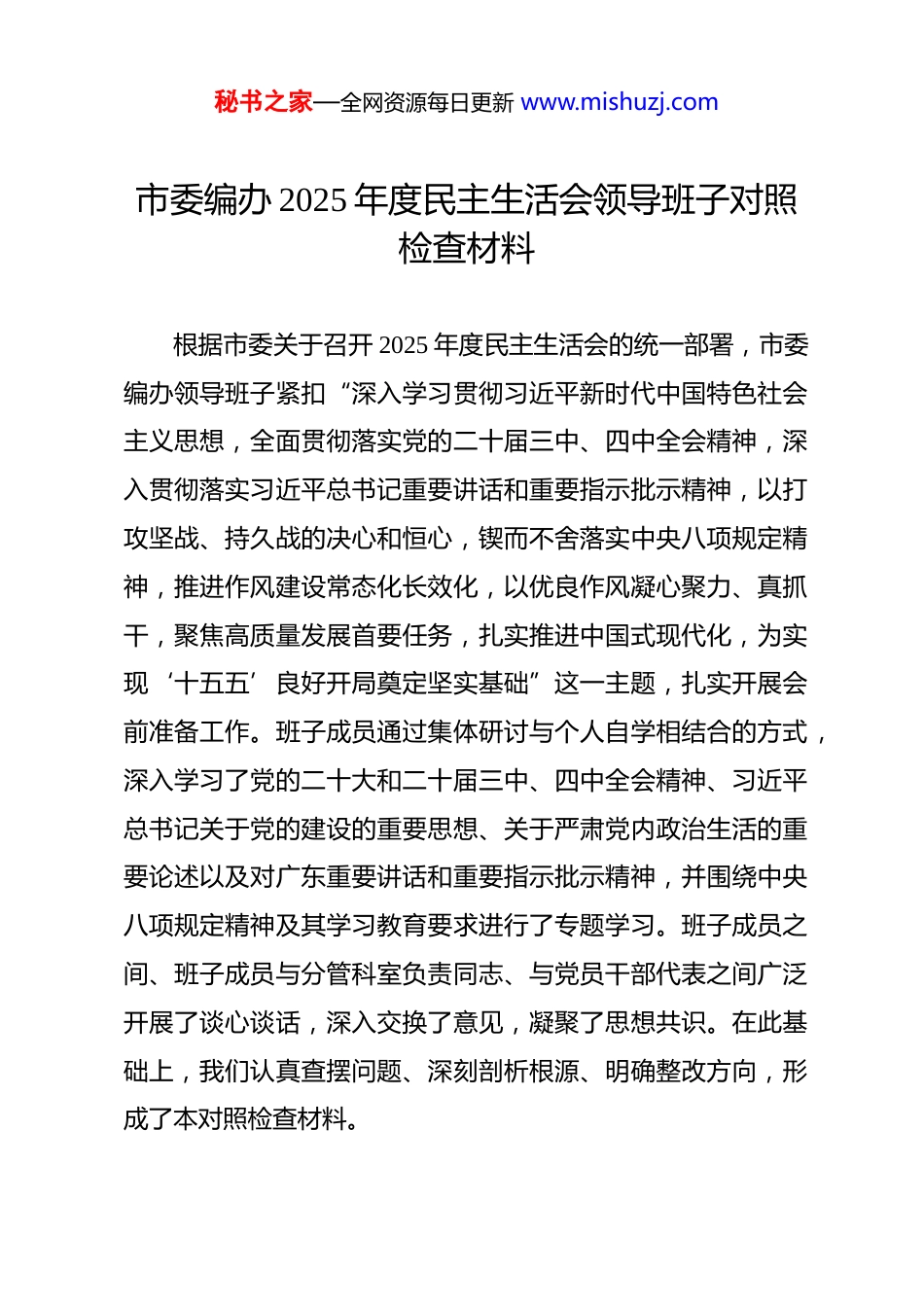 秘书之家—全网资源每日更新 www.mishuzj.com市委编办 2025 年度民主生活会领导班子对照检查材料 根据市委关于召开 2025 年度民主生活会的统一部署,市委编办领导班子紧扣“深入学习贯彻习近平新时代中国特色社会主义思想,全面贯彻落实党的二十届三中、四中全会精神,深入贯彻落实习近平总书记重要讲话和重要指示批示精神,以打攻坚战、持久战的决心和恒心,锲而不舍落实中央八项规定精神,推进作风建设常态化长效化,以优良作风凝心聚力、真抓干,聚焦高质量发展首要任务,扎实推进中国式现代化,为实现‘十五五’良好开局奠定坚实基础”这一主题,扎实开展会前准备工作。班子成员通过集体研讨与个人自学相结合的方式,深入学习了党的二十大和二十届三中、四中全会精神、习近平总书记关于党的建设的重要思想、关于严肃党内政治生活的重要论述以及对广东重要讲话和重要指示批示精神,并围绕中央八项规定精神及其学习教育要求进行了专题学习。班子成员之间、班子成员与分管科室负责同志、与党员干部代表之间广泛开展了谈心谈话,深入交换了意见,凝聚了思想共识。在此基础上,我们认真查摆问题、深刻剖析根源、明确整改方向,形成了本对照检查材料。秘书之家—全网资源每日更新 www.mishuzj.com一、有关问题整改落实情况(一)深入贯彻中央八项规定精神学习教育整改整治情况2025 年,我办扎实开展了深入贯彻中央八项规定精神学习教育,领导班子坚持以上率下,带头学习、带头查摆、带头整改。我们对照学习教育查摆清单,系统梳理出在改进调查研究、精简会议文件、厉行勤俭节约等方面的 6 个具体问题。针对这些问题,我们坚持即知即改、立行立改。例如,在改进调查研究方面,我们彻底摒弃了“蜻蜓点水”式的调研方式,建立了“基层联系点”制度,班子成员每人至少联系一个基层单位,要求调研必须“解剖麻雀”,带着问题去、跟着问题走、盯着问题改,确保调研成果能够真正转化为优化机构编制资源配置、服务基层发展的具体举措。在精简文件简报方面,我们严格执行文件前置审核制度,大力整治“层层转发”和照搬照抄现象,要求凡是向上级报送或向下级印发的文件,必须结合**实际,提出有针对性、可操作性的意见,全年压减内部流转文件数量超过 15%。截至目前,年初查摆的 6 个问题已全部整改到位,并通过修订完善相关制度,形成了常态长效的工作机制,推动了工作作风的持续向好。(二)2024 年度民主生活会整改落实情况在 2024 年度民主生活会上,领导班子主要围绕“带头严守秘书之家—全网资源每日更新 www.mishuzj.com政治纪律和政治规矩、带头增强党性砥砺作风、带头在遵规守纪前提下勇于担责、带头履行全面从严治党政治责任”等 4 个方面,查摆出问题 8 个。会后,我们逐一制定了整改措施,明确了责任领导和完成时限,实行台账式管理、销号式落实。一年来,班子全体成员以高度的政治自觉,扎实推进整改。在带头增强党性方面,我们严格落实“第一议题”制度,确保党的创新理论学习入脑入心;在带头担当作为方面,我们聚焦全市中心工作,攻坚克难,推动完成了多项重大改革任务的机构编制保障工作。截至目前,上年度查摆的 8 个问题已全部整改完毕,相关成效在机构编制管理效能提升、干部队伍精神面貌改善等方面得到了充分体现,为做好全年工作提供了坚强的政治和作风保障。二、对照查摆的突出问题紧扣本次民主生活会主题,对照 5 个方面重点内容,班子深刻检视,查摆出以下突出问题。(一)在带头强化政治忠诚、提高政治能力方面一是将顶层设计转化为地方实践的前瞻性略显不足。在贯彻落实中央和省委关于深化机构改革、优化资源配置的重大决策部署时,有时存在“等靠要”思想,对标对表多、主动谋划少。例如,在研究如何通过优化编制资源服务我市“十五五”秘书之家—全网资源每日更新 www.mishuzj.com规划中确立的新兴产业集群发展时,我们虽然迅速响应了上级号召,但在制定具体编制保障方案时,对未来产业发展可能遇到的新情况、新问题预判不够充分,导致初步方案更多是基于现有模式的延伸,对如何通过体制机制创新来激发人才活力、服务产业跃升的深度思...