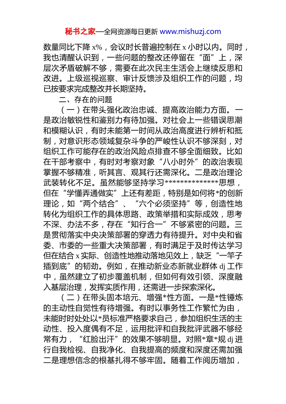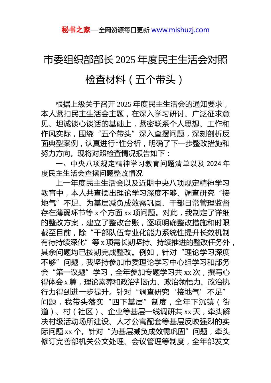 秘书之家—全网资源每日更新 www.mishuzj.com市委组织部部长 2025 年度民主生活会对照检查材料(五个带头)根据上级关于召开 2025 年度民主生活会的通知要求,本人紧扣民主生活会主题,在深入学习研讨、广泛征求意见、坦诚谈心谈话的基础上,紧密联系个人思想、工作和作风实际,围绕“五个带头”深入查摆问题,深刻剖析反面典型案例,认真进行*性分析,明确了下一步整改措施和努力方向。现将对照检查情况报告如下:一、中央八项规定精神学习教育问题清单以及 2024 年度民主生活会查摆问题整改情况上一年度民主生活会以及近期中央八项规定精神学习教育中,本人共查摆出理论学习深度不够、调查研究“接地气”不足、为基层减负成效需巩固、干部日常管理监督存在薄弱环节等 x 个方面 xx 项问题。对此,我制定了详细的整改方案,建立了整改台账,逐项明确整改措施和时限截至目前,除“干部队伍专业化能力系统性提升长效机制有待持续深化”等 x 项需长期坚持、持续推进的整改任务外,其余问题均已按期完成整改。例如,针对“理论学习深度不够”问题,我坚持参加市委理论学习中心组学习和部务会“第一议题”学习,全年参加专题学习共 xx 次,撰写心得体会 x 篇,理论素养和政治判断力、政治领悟力、政治执行力得到进一步提升。针对“调查研究‘接地气’不足”问题,我带头落实“四下基层”制度,全年下沉镇(街道)、村(社区)、企业等基层一线调研共 xx 天,牵头解决村级活动场所建设、人才公寓配套等基层反映强烈的实际问题 xx 个。针对“为基层减负成效需巩固”问题,牵头修订完善部机关公文处理、会议管理等制度,全年部发文秘书之家—全网资源每日更新 www.mishuzj.com数量同比下降 x%,会议时长普遍控制在 x 小时以内。同时,我也清醒认识到,一些问题的整改还停留在“面”上,深层次矛盾破解不够,需要在此次民主生活会上继续反思和改进。上级巡视巡察、审计反馈涉及组织工作的问题,均已按要求完成整改并长期坚持。二、存在的问题(一)在带头强化政治忠诚、提高政治能力方面。一是政治敏锐性和鉴别力有待加强。对社会上一些错误思潮和模糊认识,有时未能第一时间从政治高度进行辨析和抵制,对意识形态领域复杂斗争的严峻性认识不够深刻,对组织工作可能存在的政治风险点排查不够全面细致。比如在干部考察中,有时对考察对象“八小时外”的政治表现掌握不够精准,听其言、观其行还需深化。二是政治理论武装转化不足。虽然能够坚持学习**************思想,但在“学懂弄通做实”上还有差距,特别是如何将*的创新理论,如“两个结合”、“六个必须坚持”等,创造性地转化为组织工作的具体思路、政策举措和实际成效,思考不深、办法不多,存在“知行合一”不够紧密的问题。三是贯彻落实中央决策部署的穿透力有待提升。对中央和省委、市委的一些重大决策部署,有时满足于及时传达学习但在结合 x 实际、创造性地推动落地见效上,缺乏“一竿子插到底”的韧劲。例如,在推动新业态新就业群体 dj 工作中,虽然建立了初步覆盖机制,但如何有效引领、深度融入基层治理,发挥实质作用,还需进一步探索深化。(二)在带头固本培元、增强*性方面。一是*性锤炼的主动性自觉性有待增强。有时以事务性工作繁忙为由,未能时时处处以*员标准严格要求自己,参加组织生活的主动性、投入度偶有不足,运用批评和自我批评武器不够经常有力,“红脸出汗”的效果不够明显。对照*章*规 dj 进行自我检视、自我净化、自我提高的频度和深度还需加强二是理想信念的根基扎得不够牢固。随着工作阅历增加,秘书之家—全网资源每日更新 www.mishuzj.com有时会产生“歇歇脚”的念头,攻坚克难、锐意进取的劲头有所减退,当初入*时的激情和誓言在平淡工作中有所磨蚀。面对组织工作中的难点堵点问题,有时存在畏难情绪缺乏“闯”的精神和“创”的勇气。三是宗旨意识树得不够坚实。虽然主观上想为群众办实事,但有时深入基层倾听群众心声不够主动、不够深入,坐在办公室听汇报、看材料多,真正沉到一线与普通*员群众面对面交流、心贴心沟通少。对干部队伍中存在的一些脱离群众的现象,...