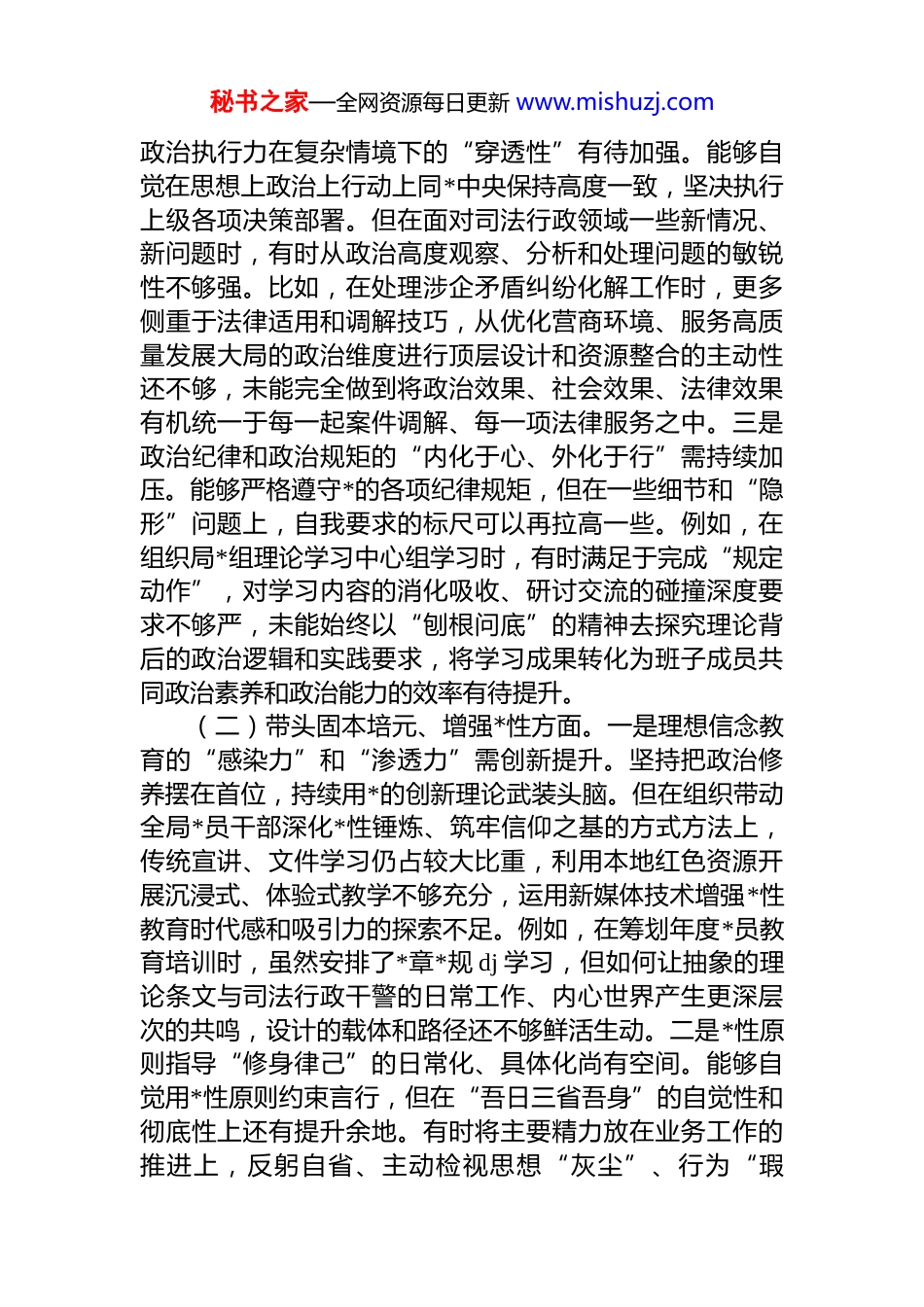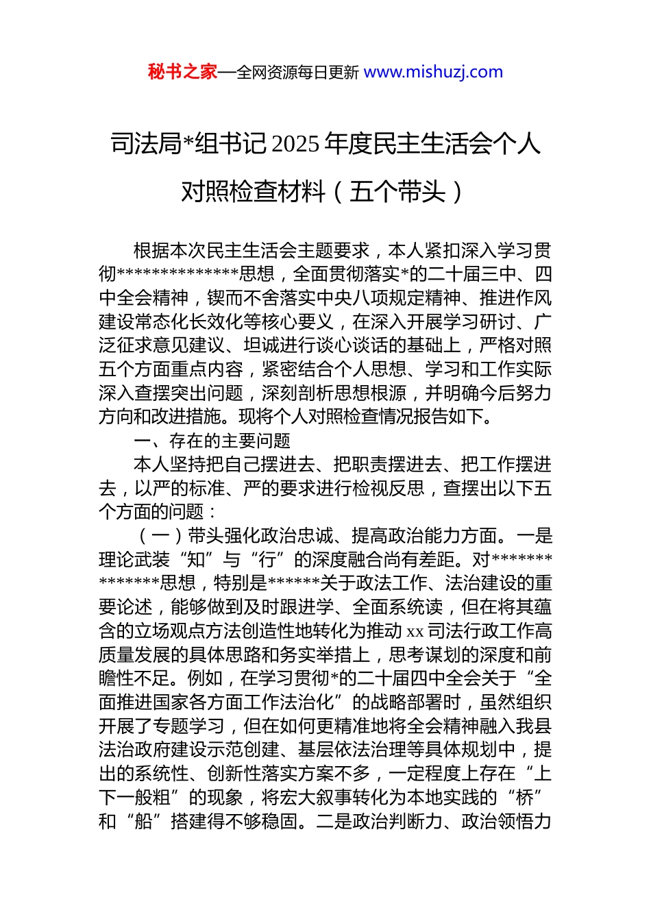 秘书之家—全网资源每日更新 www.mishuzj.com司法局*组书记 2025 年度民主生活会个人对照检查材料(五个带头)根据本次民主生活会主题要求,本人紧扣深入学习贯彻**************思想,全面贯彻落实*的二十届三中、四中全会精神,锲而不舍落实中央八项规定精神、推进作风建设常态化长效化等核心要义,在深入开展学习研讨、广泛征求意见建议、坦诚进行谈心谈话的基础上,严格对照五个方面重点内容,紧密结合个人思想、学习和工作实际深入查摆突出问题,深刻剖析思想根源,并明确今后努力方向和改进措施。现将个人对照检查情况报告如下。一、存在的主要问题本人坚持把自己摆进去、把职责摆进去、把工作摆进去,以严的标准、严的要求进行检视反思,查摆出以下五个方面的问题:(一)带头强化政治忠诚、提高政治能力方面。一是理论武装“知”与“行”的深度融合尚有差距。对**************思想,特别是******关于政法工作、法治建设的重要论述,能够做到及时跟进学、全面系统读,但在将其蕴含的立场观点方法创造性地转化为推动 xx 司法行政工作高质量发展的具体思路和务实举措上,思考谋划的深度和前瞻性不足。例如,在学习贯彻*的二十届四中全会关于“全面推进国家各方面工作法治化”的战略部署时,虽然组织开展了专题学习,但在如何更精准地将全会精神融入我县法治政府建设示范创建、基层依法治理等具体规划中,提出的系统性、创新性落实方案不多,一定程度上存在“上下一般粗”的现象,将宏大叙事转化为本地实践的“桥”和“船”搭建得不够稳固。二是政治判断力、政治领悟力秘书之家—全网资源每日更新 www.mishuzj.com政治执行力在复杂情境下的“穿透性”有待加强。能够自觉在思想上政治上行动上同*中央保持高度一致,坚决执行上级各项决策部署。但在面对司法行政领域一些新情况、新问题时,有时从政治高度观察、分析和处理问题的敏锐性不够强。比如,在处理涉企矛盾纠纷化解工作时,更多侧重于法律适用和调解技巧,从优化营商环境、服务高质量发展大局的政治维度进行顶层设计和资源整合的主动性还不够,未能完全做到将政治效果、社会效果、法律效果有机统一于每一起案件调解、每一项法律服务之中。三是政治纪律和政治规矩的“内化于心、外化于行”需持续加压。能够严格遵守*的各项纪律规矩,但在一些细节和“隐形”问题上,自我要求的标尺可以再拉高一些。例如,在组织局*组理论学习中心组学习时,有时满足于完成“规定动作”,对学习内容的消化吸收、研讨交流的碰撞深度要求不够严,未能始终以“刨根问底”的精神去探究理论背后的政治逻辑和实践要求,将学习成果转化为班子成员共同政治素养和政治能力的效率有待提升。(二)带头固本培元、增强*性方面。一是理想信念教育的“感染力”和“渗透力”需创新提升。坚持把政治修养摆在首位,持续用*的创新理论武装头脑。但在组织带动全局*员干部深化*性锤炼、筑牢信仰之基的方式方法上,传统宣讲、文件学习仍占较大比重,利用本地红色资源开展沉浸式、体验式教学不够充分,运用新媒体技术增强*性教育时代感和吸引力的探索不足。例如,在筹划年度*员教育培训时,虽然安排了*章*规 dj 学习,但如何让抽象的理论条文与司法行政干警的日常工作、内心世界产生更深层次的共鸣,设计的载体和路径还不够鲜活生动。二是*性原则指导“修身律己”的日常化、具体化尚有空间。能够自觉用*性原则约束言行,但在“吾日三省吾身”的自觉性和彻底性上还有提升余地。有时将主要精力放在业务工作的推进上,反躬自省、主动检视思想“灰尘”、行为“瑕秘书之家—全网资源每日更新 www.mishuzj.com疵”的频次和深度不够。比如,在听取分管领域工作汇报时,有时更关注任务进度和结果,对工作过程中干部思想动态、作风表现的细微变化捕捉不够及时,运用谈心谈话等方式进行*性“体检”和“保健”的主动性有待加强。三是“精神追求”与“岗位奉献”的融合转化链条需进一步拧紧。深知共产*人的精神追求最终要落脚于为民奉献、干事创业。但在将崇高的精神追求转化为日常工作中“时时放心不下”的责任感和“功成不必在我”的境界上,仍有努力空间。面对司法...