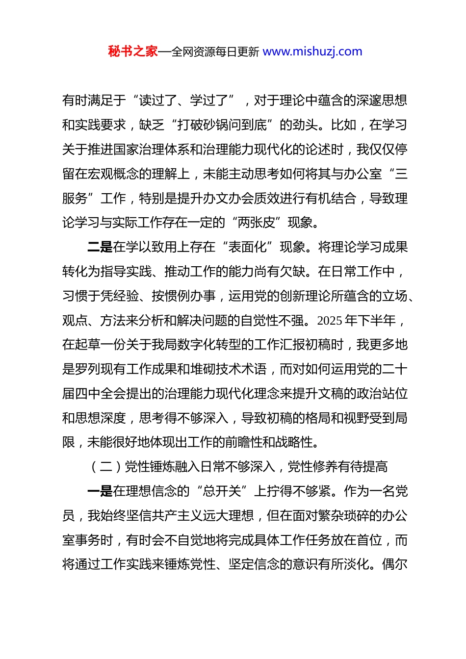 秘书之家—全网资源每日更新 www.mishuzj.com县局办公室党员 2025 年度组织生活会对照检查材料 尊敬的党组织、各位同志:大家好。根据县局党组关于召开 2025 年度组织生活会的统一部署和要求,我作为办公室的一员,在会前深入学习了党的二十届四中全会精神、新修订的《中国共产党章程》以及深入贯彻中央八项规定精神学习教育的相关文件。今天,我怀着对党忠诚、对事业负责的态度,本着实事求是、开诚布公的原则,紧扣“党员本位、具体务实、个人层面、落地可行、朴实直白”的对照检查要求,重点围绕“贯彻党的创新理论、加强党性锤炼、联系服务群众、发挥先锋模范作用、改作风树新风”等五个方面,深刻查摆自身存在的问题,剖析问题产生的根源,并制定切实可行的整改措施。现将我的对照检查情况汇报如下,恳请各位同志给予批评指正。一、存在的主要问题(一)理论武装学用结合不够紧密,政治领悟力有待增强一是在学习深度上存在“表层化”倾向。对于党的二十届四中全会精神等最新理论成果,我能够按时参加集体学习,完成规定篇目的阅读,但在深钻细研、融会贯通上下的功夫不足。秘书之家—全网资源每日更新 www.mishuzj.com有时满足于“读过了、学过了”,对于理论中蕴含的深邃思想和实践要求,缺乏“打破砂锅问到底”的劲头。比如,在学习关于推进国家治理体系和治理能力现代化的论述时,我仅仅停留在宏观概念的理解上,未能主动思考如何将其与办公室“三服务”工作,特别是提升办文办会质效进行有机结合,导致理论学习与实际工作存在一定的“两张皮”现象。二是在学以致用上存在“表面化”现象。将理论学习成果转化为指导实践、推动工作的能力尚有欠缺。在日常工作中,习惯于凭经验、按惯例办事,运用党的创新理论所蕴含的立场、观点、方法来分析和解决问题的自觉性不强。2025 年下半年,在起草一份关于我局数字化转型的工作汇报初稿时,我更多地是罗列现有工作成果和堆砌技术术语,而对如何运用党的二十届四中全会提出的治理能力现代化理念来提升文稿的政治站位和思想深度,思考得不够深入,导致初稿的格局和视野受到局限,未能很好地体现出工作的前瞻性和战略性。(二)党性锤炼融入日常不够深入,党性修养有待提高一是在理想信念的“总开关”上拧得不够紧。作为一名党员,我始终坚信共产主义远大理想,但在面对繁杂琐碎的办公室事务时,有时会不自觉地将完成具体工作任务放在首位,而将通过工作实践来锤炼党性、坚定信念的意识有所淡化。偶尔秘书之家—全网资源每日更新 www.mishuzj.com会产生“工作干好就是硬道理”的片面认识,在处理一项紧急任务时,可能会因为时间紧迫而忽略了对工作程序、政策依据的再思考、再对标,未能时刻将每一次任务都作为检验自身党性觉悟和政治忠诚的“试金石”。二是在参与组织生活上存在“被动化”心态。能够严格遵守“三会一课”等制度,但主动思考、积极建言的意识不强。在参加支部主题党日活动时,多数时候是认真听、认真记,但在交流研讨环节,考虑到自己是普通干部,往往抱着“多听少说”的心态,担心自己的发言不够深刻、不够成熟,因而很少主动分享个人学习体会或对单位党建工作提出建设性意见。这种“怕说错”的顾虑,实质上是党内政治生活主人翁意识不强的表现,未能充分发挥党员在组织生活中的应有作用。(三)服务群众深入基层不够主动,宗旨意识有待强化一是深入基层调查研究存在“蜻蜓点水”现象。作为县局办公室的一员,虽然工作性质决定了大部分时间在机关,但联系基层、服务群众的职责要求并未因此减弱。回顾 2025 年,我参与下基层调研的次数有限,且多是陪同领导或根据既定安排进行,主动带着问题、带着感情深入一线的次数屈指可数。去年在一次涉及基层站所标准化建设的材料准备过程中,我主要依赖于各单位报送的书面材料和数据,而没有亲自到几个有代秘书之家—全网资源每日更新 www.mishuzj.com表性的站所去实地查看、与一线工作人员深入交流,导致形成的材料虽然数据详实,但对基层存在的实际困难和鲜活经验反映不够充分、不够接地气。二是服务群众解决难题存在“隔层纱”问题。在日常工作中,偶尔会接到基层...