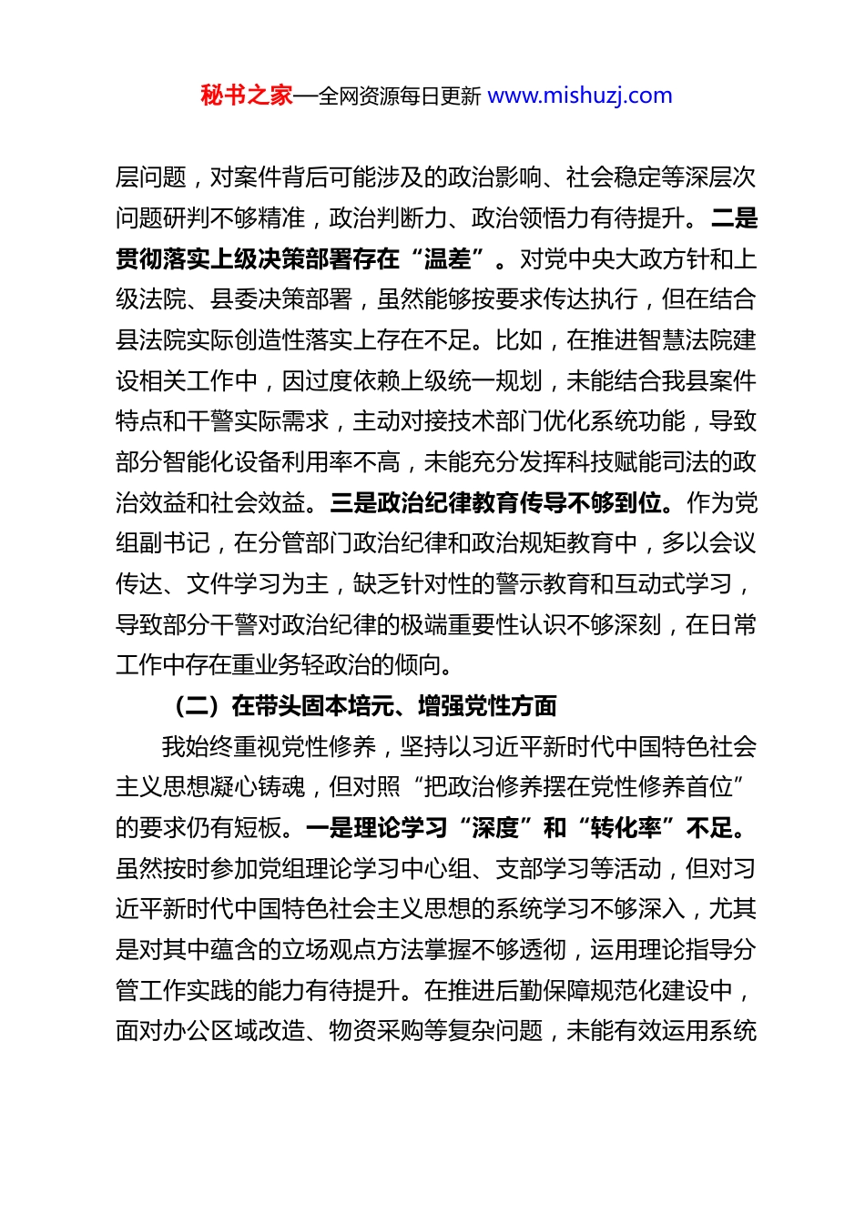 秘书之家—全网资源每日更新 www.mishuzj.comXX 县人民法院党组副书记 2025 年度民主生活会对照检查材料根据本次民主生活会要求,我紧扣会议主题,在深入学习习近平新时代中国特色社会主义思想、党的二十届四中全会精神及深入贯彻中央八项规定精神学习教育内容的基础上,结合自身分管办公室、审管办、后勤等工作实际,通过自我反思、群众提、同事帮等方式,全面查摆问题、深刻剖析根源,明确了今后努力方向和整改措施。现将对照检查情况报告如下:一、存在的主要问题对照本次民主生活会的要求,结合分管工作实际,从五个方面深入查摆,主要存在以下问题:(一)在带头强化政治忠诚、提高政治能力方面我始终坚持党对司法工作的绝对领导,深刻领悟“两个确立”的决定性意义,努力增强“四个意识”、坚定“四个自信”、做到“两个维护”,但对照更高标准仍有差距。一是政治站位与履职要求契合不够紧密。在分管办公室、审管办工作中,有时更多关注文稿起草、会议组织、案件质效统计等具体业务,未能始终从保障法院工作正确政治方向的高度统筹谋划,将党的二十届四中全会关于“社会主义法治国家建设达到更高水平”的部署要求融入分管工作的思考不深、举措不实。例如,在审管办案件质量监管中,侧重法律程序、裁判文书规范等表秘书之家—全网资源每日更新 www.mishuzj.com层问题,对案件背后可能涉及的政治影响、社会稳定等深层次问题研判不够精准,政治判断力、政治领悟力有待提升。二是贯彻落实上级决策部署存在“温差”。对党中央大政方针和上级法院、县委决策部署,虽然能够按要求传达执行,但在结合县法院实际创造性落实上存在不足。比如,在推进智慧法院建设相关工作中,因过度依赖上级统一规划,未能结合我县案件特点和干警实际需求,主动对接技术部门优化系统功能,导致部分智能化设备利用率不高,未能充分发挥科技赋能司法的政治效益和社会效益。三是政治纪律教育传导不够到位。作为党组副书记,在分管部门政治纪律和政治规矩教育中,多以会议传达、文件学习为主,缺乏针对性的警示教育和互动式学习,导致部分干警对政治纪律的极端重要性认识不够深刻,在日常工作中存在重业务轻政治的倾向。(二)在带头固本培元、增强党性方面我始终重视党性修养,坚持以习近平新时代中国特色社会主义思想凝心铸魂,但对照“把政治修养摆在党性修养首位”的要求仍有短板。一是理论学习“深度”和“转化率”不足。虽然按时参加党组理论学习中心组、支部学习等活动,但对习近平新时代中国特色社会主义思想的系统学习不够深入,尤其是对其中蕴含的立场观点方法掌握不够透彻,运用理论指导分管工作实践的能力有待提升。在推进后勤保障规范化建设中,面对办公区域改造、物资采购等复杂问题,未能有效运用系统秘书之家—全网资源每日更新 www.mishuzj.com观念统筹协调,导致部分工作推进缓慢。二是党性锻炼常态化不够。以普通党员身份参加所在支部组织生活时,有时因分管工作繁忙提前离场,开展批评与自我批评时存在“老好人”思想,自我批评避重就轻,相互批评缺乏“辣味”,未能真正达到锤炼党性、改进工作的目的。在年底工作繁忙时,甚至出现将支部组织生活简化为工作部署会的情况,忽视了党性教育的本质要求。三是精神追求的坚守不够坚定。面对司法改革深化带来的工作压力和复杂环境,有时存在急躁情绪,攻坚克难的锐气有所减退,对“坚守共产党人精神追求”的认识更多停留在思想层面,未能完全转化为持之以恒、迎难而上的行动自觉,在解决分管部门历史遗留的后勤保障难题时,缺乏“一抓到底”的韧劲。(三)在带头敬畏人民、敬畏组织、敬畏法纪方面我始终牢记党的宗旨,严守组织纪律和法律底线,但在践行“三个敬畏”的细节上仍有不足。一是践行群众路线不够扎实。落实“四下基层”制度存在形式化倾向,深入乡镇、社区开展司法调研、听取群众意见时,有时存在“走马观花”现象,听取基层干部汇报多,与群众、一线干警面对面交流少。例如,在了解群众对诉讼服务的需求时,主要通过诉讼服务中心数据统计分析,未能深入偏远乡村走访群众,导致对部分群众“立案难”“送达难”等急难愁盼问题...
