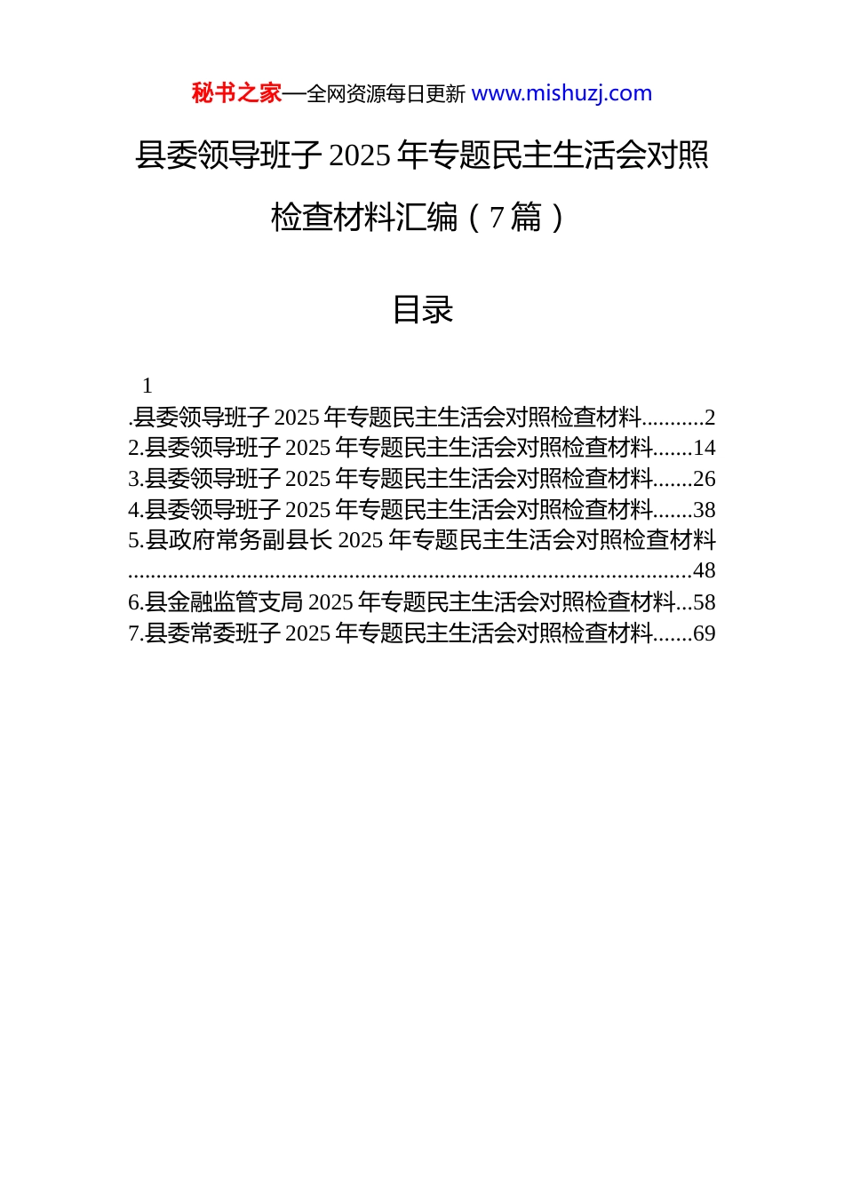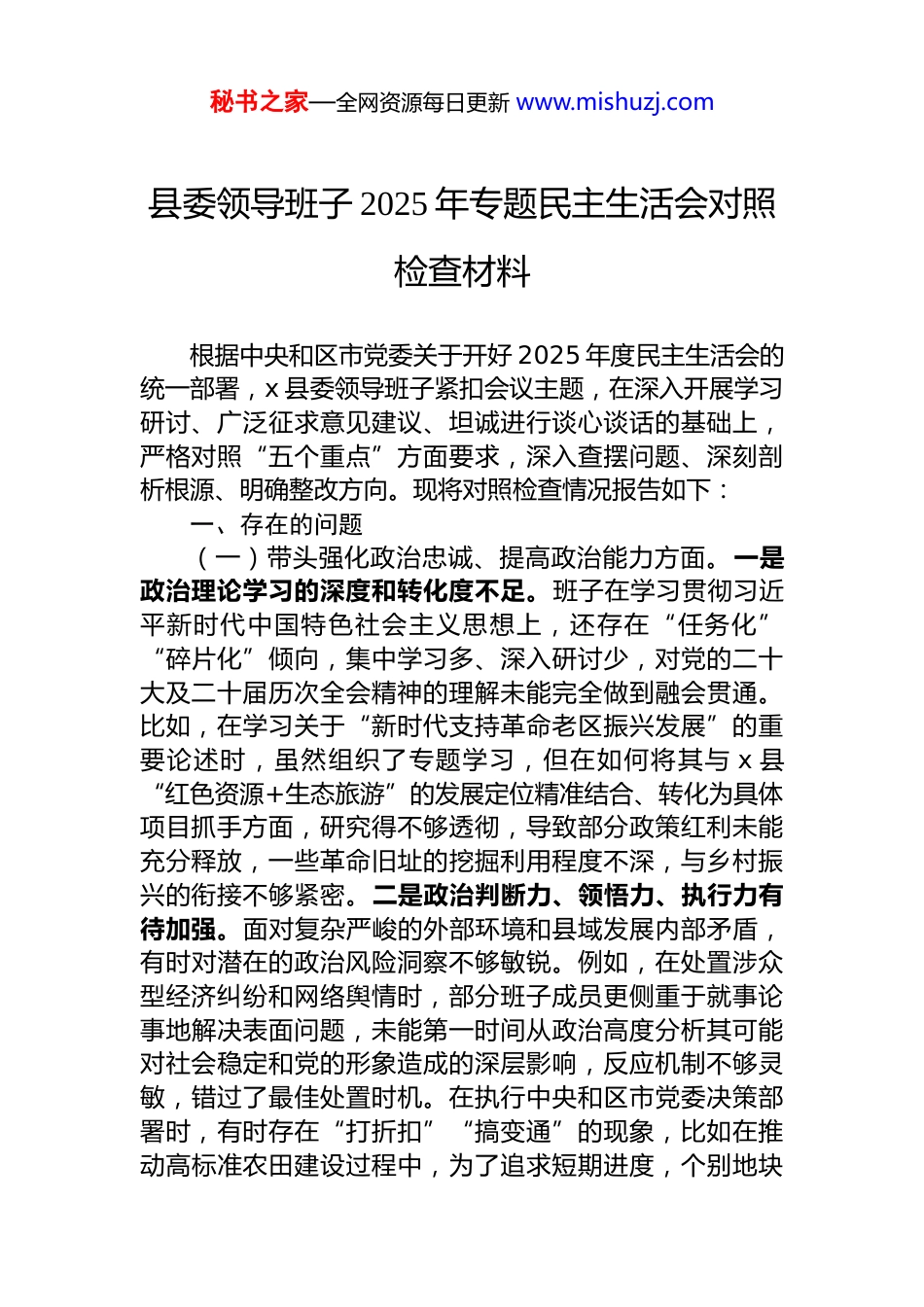 秘书之家—全网资源每日更新 www.mishuzj.com县委领导班子 2025 年专题民主生活会对照检查材料汇编(7 篇)目录1.县委领导班子 2025 年专题民主生活会对照检查材料...........22.县委领导班子 2025 年专题民主生活会对照检查材料.......143.县委领导班子 2025 年专题民主生活会对照检查材料.......264.县委领导班子 2025 年专题民主生活会对照检查材料.......385.县政府常务副县长 2025 年专题民主生活会对照检查材料...................................................................................................486.县金融监管支局 2025 年专题民主生活会对照检查材料...587.县委常委班子 2025 年专题民主生活会对照检查材料.......69秘书之家—全网资源每日更新 www.mishuzj.com县委领导班子 2025 年专题民主生活会对照检查材料根据中央和区市党委关于开好 2025 年度民主生活会的统一部署,x 县委领导班子紧扣会议主题,在深入开展学习研讨、广泛征求意见建议、坦诚进行谈心谈话的基础上,严格对照“五个重点”方面要求,深入查摆问题、深刻剖析根源、明确整改方向。现将对照检查情况报告如下:一、存在的问题(一)带头强化政治忠诚、提高政治能力方面。一是政治理论学习的深度和转化度不足。班子在学习贯彻习近平新时代中国特色社会主义思想上,还存在“任务化”“碎片化”倾向,集中学习多、深入研讨少,对党的二十大及二十届历次全会精神的理解未能完全做到融会贯通。比如,在学习关于“新时代支持革命老区振兴发展”的重要论述时,虽然组织了专题学习,但在如何将其与 x 县“红色资源+生态旅游”的发展定位精准结合、转化为具体项目抓手方面,研究得不够透彻,导致部分政策红利未能充分释放,一些革命旧址的挖掘利用程度不深,与乡村振兴的衔接不够紧密。二是政治判断力、领悟力、执行力有待加强。面对复杂严峻的外部环境和县域发展内部矛盾,有时对潜在的政治风险洞察不够敏锐。例如,在处置涉众型经济纠纷和网络舆情时,部分班子成员更侧重于就事论事地解决表面问题,未能第一时间从政治高度分析其可能对社会稳定和党的形象造成的深层影响,反应机制不够灵敏,错过了最佳处置时机。在执行中央和区市党委决策部署时,有时存在“打折扣”“搞变通”的现象,比如在推动高标准农田建设过程中,为了追求短期进度,个别地块秘书之家—全网资源每日更新 www.mishuzj.com的建设标准未能严格达到上级要求,体现了执行上的偏差。三是“两个维护”的实践性有待提升。班子成员虽然能在思想上认同、政治上拥护,但在具体工作中将其转化为高度自觉的行动自觉还有差距。有时将“两个维护”简单等同于传达学习上级文件,未能将其精神实质完全融入县域发展规划、政策制定和日常工作的方方面面,在创造性地贯彻落实上思考不深、办法不多。(二)带头固本培元、增强党性方面。一是理想信念根基不够牢固。部分班子成员在长期繁重的基层工作中,逐渐放松了对主观世界的持续改造,理想信念的“压舱石”作用有所减弱。例如,在面对 x 发展不平衡不充分的老大难问题时,如部分偏远乡镇的民生保障短板,有时会产生畏难情绪和“等靠要”思想,缺乏“革命理想高于天”的豪情和攻坚克难的锐气,与革命先辈在六盘山地区艰苦奋斗的优良传统相比,存在明显差距。二是党性锤炼的主动性和自觉性不足。落实党内政治生活准则有时不够严格,批评与自我批评“辣味”不足,存在“你好我好大家好”的老好人思想。在民主生活会上,对他人批评往往点到为止,对自己问题则避重就轻,未能真正达到“红脸出汗、排毒治病”的效果。双重组织生活制度执行不到位,有的班子成员因工作忙等原因,参加所在支部组织生活次数偏少,与普通党员交流互动不深。三是宗旨意识树立得不够扎实。虽然经常强调“以人民为中心”,但在实际工作中,“官本位”思想仍有残留,未能始终将群众满意度作为衡量工作的最高标准。比如,在推进城市更新项目中,对拆迁户的实际困难和诉求调研不够细致,政策解释不够耐心,导致个别项目推进受阻,引发群众不满。深入基层调研存在“走马观花”现象,下乡镇多、...
