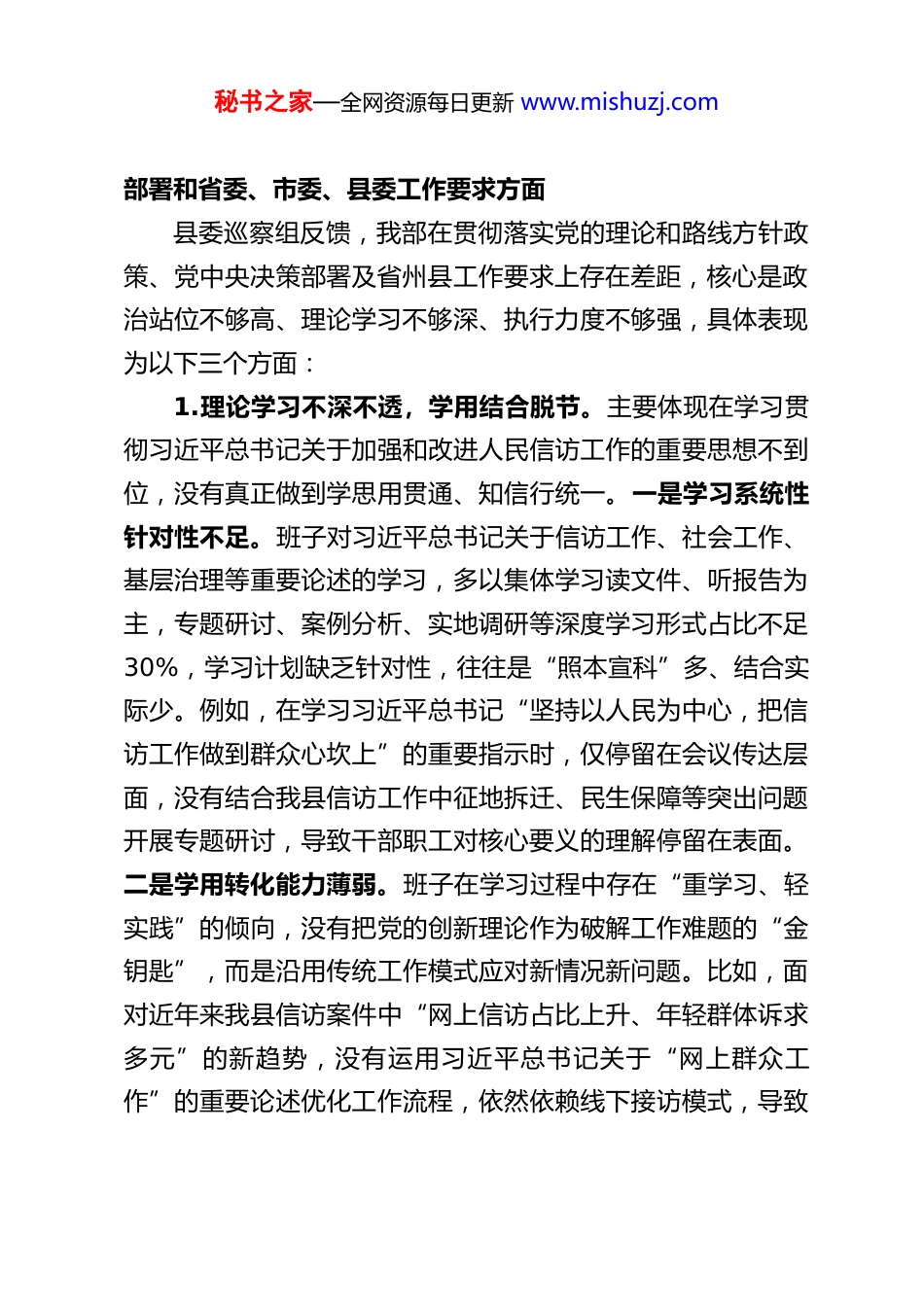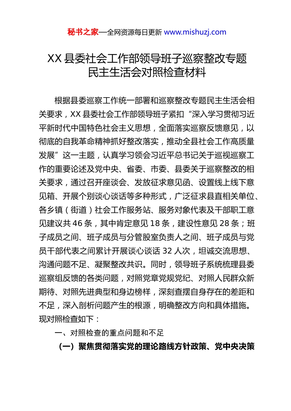 秘书之家—全网资源每日更新 www.mishuzj.comXX 县委社会工作部领导班子巡察整改专题民主生活会对照检查材料根据县委巡察工作统一部署和巡察整改专题民主生活会相关要求,XX 县委社会工作部领导班子紧扣“深入学习贯彻习近平新时代中国特色社会主义思想,全面落实巡察反馈意见,以彻底的自我革命精神抓好整改落实,推动全县社会工作高质量发展”这一主题,认真学习领会习近平总书记关于巡视巡察工作的重要论述及党中央、省委、市委、县委关于巡察整改的相关要求,通过召开座谈会、发放征求意见函、设置线上线下意见箱、开展个别谈心谈话等多种形式,广泛征求县直相关单位、各乡镇(街道)社会工作服务站、服务对象代表及干部职工意见建议共 46 条,其中肯定意见 18 条,建设性意见 28 条;班子成员之间、班子成员与分管股室负责人之间、班子成员与党员干部代表之间累计开展谈心谈话 32 人次,坦诚交流思想、沟通问题不足、凝聚整改共识。同时,领导班子系统梳理县委巡察组反馈的各类问题,对照党章党规党纪、对照人民群众新期待、对照先进典型和身边榜样,深刻查摆自身存在的差距和不足,深入剖析问题产生的根源,明确整改方向和具体措施。现对照检查如下:一、对照检查的重点问题和不足(一)聚焦贯彻落实党的理论路线方针政策、党中央决策秘书之家—全网资源每日更新 www.mishuzj.com部署和省委、市委、县委工作要求方面县委巡察组反馈,我部在贯彻落实党的理论和路线方针政策、党中央决策部署及省州县工作要求上存在差距,核心是政治站位不够高、理论学习不够深、执行力度不够强,具体表现为以下三个方面:1.理论学习不深不透,学用结合脱节。主要体现在学习贯彻习近平总书记关于加强和改进人民信访工作的重要思想不到位,没有真正做到学思用贯通、知信行统一。一是学习系统性针对性不足。班子对习近平总书记关于信访工作、社会工作、基层治理等重要论述的学习,多以集体学习读文件、听报告为主,专题研讨、案例分析、实地调研等深度学习形式占比不足30%,学习计划缺乏针对性,往往是“照本宣科”多、结合实际少。例如,在学习习近平总书记“坚持以人民为中心,把信访工作做到群众心坎上”的重要指示时,仅停留在会议传达层面,没有结合我县信访工作中征地拆迁、民生保障等突出问题开展专题研讨,导致干部职工对核心要义的理解停留在表面。二是学用转化能力薄弱。班子在学习过程中存在“重学习、轻实践”的倾向,没有把党的创新理论作为破解工作难题的“金钥匙”,而是沿用传统工作模式应对新情况新问题。比如,面对近年来我县信访案件中“网上信访占比上升、年轻群体诉求多元”的新趋势,没有运用习近平总书记关于“网上群众工作”的重要论述优化工作流程,依然依赖线下接访模式,导致秘书之家—全网资源每日更新 www.mishuzj.com网上信访事项办理时限平均超出规定标准 1.5 个工作日,群众线上诉求响应不及时。三是学习传导层层递减。对乡镇(街道)社会工作服务站、村(社区)相关工作人员的理论学习指导严重不足,没有建立常态化学习传导机制,每年仅开展 1 次全县性业务培训且未将信访工作重要思想纳入必学内容,导致基层工作人员对政策要求掌握不精准。如某乡镇社会工作服务站工作人员在处理一起物业纠纷信访件时,因不熟悉相关政策依据,未能及时有效化解矛盾,导致群众重复上访。2.履职尽责存在短板,核心职能发挥不充分。班子在统筹推进各项工作中,存在统筹协调不力、推进力度不足、工作落实不扎实等问题,与县委赋予的职能职责要求存在明显差距。一是新兴领域党建工作推进滞后。随着我县互联网企业、社会组织、快递物流等新兴领域快速发展,党建工作覆盖不足、引领不够的问题日益突出。班子对新兴领域党建工作的重要性认识不足,缺乏系统谋划,未结合新兴领域特点制定差异化党建工作方案,仅采取“一刀切”的传统模式推进。目前,我县 12家规模以上互联网企业中仅建立党组织 3 家,组建率仅 25%;已建立的党组织中,有 2 家未开展过常态化组织生活,党建工作与业务工作“两张皮”问题突出,党组织在凝聚职工、引领发展中的作用未能有效发挥。...