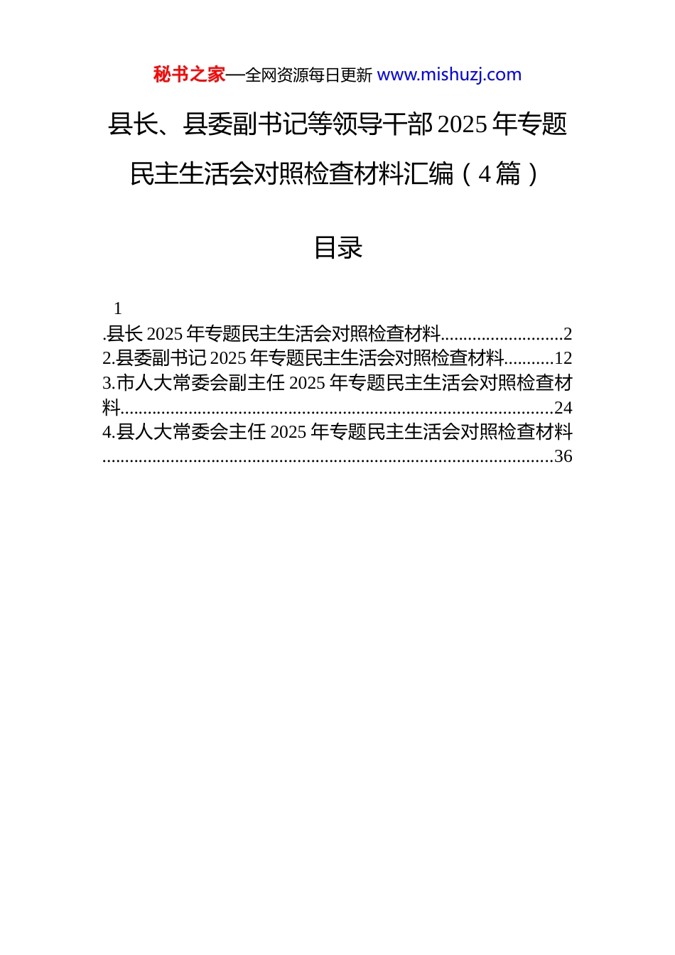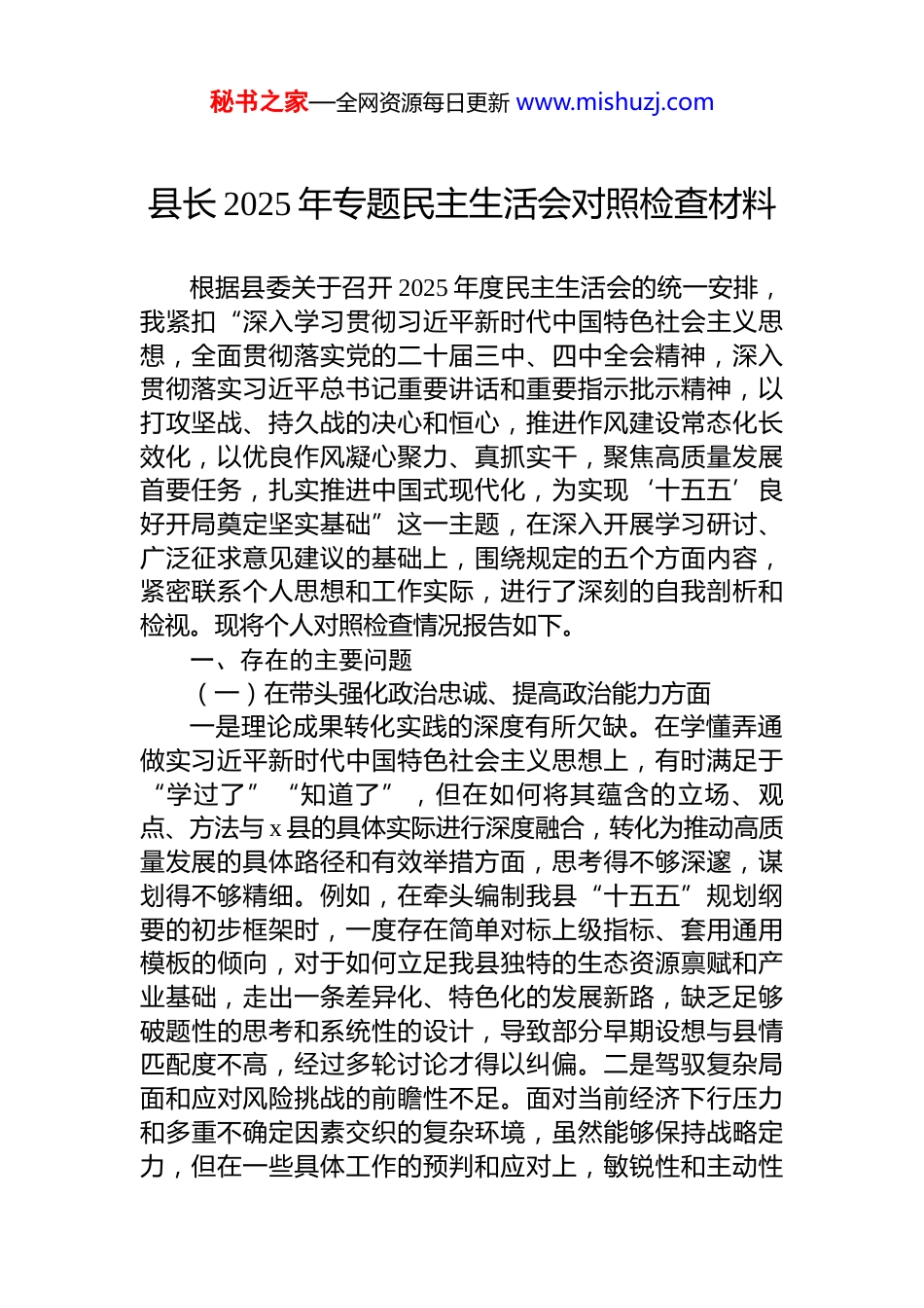 秘书之家—全网资源每日更新 www.mishuzj.com县长、县委副书记等领导干部 2025 年专题民主生活会对照检查材料汇编(4 篇)目录1.县长 2025 年专题民主生活会对照检查材料...........................22.县委副书记 2025 年专题民主生活会对照检查材料...........123.市人大常委会副主任 2025 年专题民主生活会对照检查材料...............................................................................................244.县人大常委会主任 2025 年专题民主生活会对照检查材料...................................................................................................36秘书之家—全网资源每日更新 www.mishuzj.com县长 2025 年专题民主生活会对照检查材料根据县委关于召开 2025 年度民主生活会的统一安排,我紧扣“深入学习贯彻习近平新时代中国特色社会主义思想,全面贯彻落实党的二十届三中、四中全会精神,深入贯彻落实习近平总书记重要讲话和重要指示批示精神,以打攻坚战、持久战的决心和恒心,推进作风建设常态化长效化,以优良作风凝心聚力、真抓实干,聚焦高质量发展首要任务,扎实推进中国式现代化,为实现‘十五五’良好开局奠定坚实基础”这一主题,在深入开展学习研讨、广泛征求意见建议的基础上,围绕规定的五个方面内容,紧密联系个人思想和工作实际,进行了深刻的自我剖析和检视。现将个人对照检查情况报告如下。一、存在的主要问题(一)在带头强化政治忠诚、提高政治能力方面一是理论成果转化实践的深度有所欠缺。在学懂弄通做实习近平新时代中国特色社会主义思想上,有时满足于“学过了”“知道了”,但在如何将其蕴含的立场、观点、方法与 x 县的具体实际进行深度融合,转化为推动高质量发展的具体路径和有效举措方面,思考得不够深邃,谋划得不够精细。例如,在牵头编制我县“十五五”规划纲要的初步框架时,一度存在简单对标上级指标、套用通用模板的倾向,对于如何立足我县独特的生态资源禀赋和产业基础,走出一条差异化、特色化的发展新路,缺乏足够破题性的思考和系统性的设计,导致部分早期设想与县情匹配度不高,经过多轮讨论才得以纠偏。二是驾驭复杂局面和应对风险挑战的前瞻性不足。面对当前经济下行压力和多重不确定因素交织的复杂环境,虽然能够保持战略定力,但在一些具体工作的预判和应对上,敏锐性和主动性秘书之家—全网资源每日更新 www.mishuzj.com仍有待加强,有时存在被动应付、跟进落实的现象。今年上半年,全县固定资产投资增速出现放缓迹象,我在县政府常务会议上多次强调要加快现有项目建设进度,但对于如何精准预判宏观政策走向,提前谋划布局一批契合新质生产力发展的战略性新兴产业项目,以增量对冲存量压力,思考谋划得不够及时和深入,使得我们在争取政策支持和抢占发展先机上慢了半拍。三是执行政治纪律和政治规矩的精度有待提升。能够时刻绷紧政治纪律这根弦,但在推动中央、自治区党委决策部署落地见效的过程中,有时过于注重任务的整体推进,对执行过程中的细节把控和精度要求不够严格,导致政策效能未能完全释放。比如,在推动黔东北(x)临空经济产业园规划建设工作中,我深刻认识到其战略意义,为抢抓进度,多次召开会议强力推动,但在初期阶段,对规划方案与国土空间、生态环保、交通路网等规划的精细衔接督促不够,导致规划编制单位与相关职能部门之间花费了较多时间进行沟通协调和方案修改,影响了项目整体推进效率,这反映出我在统筹协调、精准施策方面还有提升空间。(二)在带头固本培元、增强党性方面一是党性锤炼的主动性和自觉性有所减弱。随着工作事务日益繁忙,有时不自觉地将更多精力投入到处理具体的行政事务中,静下心来读原著、学原文、悟原理的时间被挤占,系统性的理论学习和深层次的思考有所减少。虽然能够按时参加中心组学习等集体活动,但在“八小时之外”的个人自学抓得不够紧,导致在运用马克思主义立场观点方法分析和解决实际问题时,理论底蕴的支撑略显不足,思想“总开关”拧得还不够紧。二是运用批评和自我批评武器的锐度不够。在县政府班子内部,有...