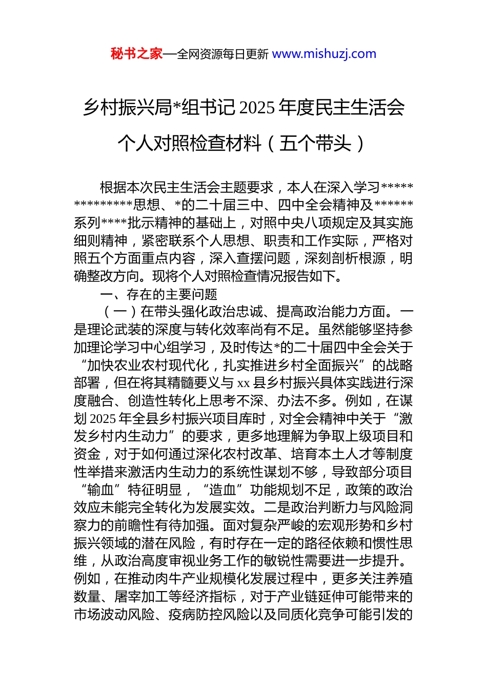 秘书之家—全网资源每日更新 www.mishuzj.com乡村振兴局*组书记 2025 年度民主生活会个人对照检查材料(五个带头)根据本次民主生活会主题要求,本人在深入学习**************思想、*的二十届三中、四中全会精神及******系列****批示精神的基础上,对照中央八项规定及其实施细则精神,紧密联系个人思想、职责和工作实际,严格对照五个方面重点内容,深入查摆问题,深刻剖析根源,明确整改方向。现将个人对照检查情况报告如下。一、存在的主要问题(一)在带头强化政治忠诚、提高政治能力方面。一是理论武装的深度与转化效率尚有不足。虽然能够坚持参加理论学习中心组学习,及时传达*的二十届四中全会关于“加快农业农村现代化,扎实推进乡村全面振兴”的战略部署,但在将其精髓要义与 xx 县乡村振兴具体实践进行深度融合、创造性转化上思考不深、办法不多。例如,在谋划 2025 年全县乡村振兴项目库时,对全会精神中关于“激发乡村内生动力”的要求,更多地理解为争取上级项目和资金,对于如何通过深化农村改革、培育本土人才等制度性举措来激活内生动力的系统性谋划不够,导致部分项目“输血”特征明显,“造血”功能规划不足,政策的政治效应未能完全转化为发展实效。二是政治判断力与风险洞察力的前瞻性有待加强。面对复杂严峻的宏观形势和乡村振兴领域的潜在风险,有时存在一定的路径依赖和惯性思维,从政治高度审视业务工作的敏锐性需要进一步提升。例如,在推动肉牛产业规模化发展过程中,更多关注养殖数量、屠宰加工等经济指标,对于产业链延伸可能带来的市场波动风险、疫病防控风险以及同质化竞争可能引发的秘书之家—全网资源每日更新 www.mishuzj.com区域性产业风险,虽然有所考虑,但将其上升到维护县域经济安全、社会稳定的政治层面来统筹部署、建立预警机制的主动性和系统性还不够强,政治能力体现在驾驭复杂局面、防范化解重大风险上尚有提升空间。三是贯彻落实*中央决策部署的“最后一公里”存在温差。能够坚决执行中央、省委、市委关于乡村振兴的大政方针,但在结合 xx县情推动落地时,有时未能完全做到因地制宜、精准施策例如,在落实中央关于学习运用“千万工程”经验的要求时,组织开展了系列调研和考察,但在将外地成功经验本土化的过程中,有时急于出亮点、见形象,对部分基础薄弱村庄的长期性、艰巨性认识不足,在资源投入上存在“锦上添花”多于“雪中送炭”的倾向,使得政策红利未能最均衡、最有效地惠及所有乡村,与“扎实推进共同富裕”的政治要求存在细微差距。(二)在带头固本培元、增强*性方面。一是理想信念的内化践行存在“知行间隙”。能够认识到**************思想是指导乡村振兴工作的根本遵循,但在将其蕴含的立场、观点、方法真正融入日常决策、转化为行动自觉方面仍有提升余地。例如,在项目资金分配决策中,虽然强调要公平公正,但潜意识里有时会倾向于选择实施难度小、见效快的“保险”项目,对于那些需要攻坚克难、但长期效益显著、更能体现新发展理念的生态修复或科技兴农项目,推动的决心和力度相对不足,这反映出在改造主观世界、锤炼坚强*性上仍需持续用力,“总开关”拧得不够紧。二是*性原则在复杂情境下的刚性约束力有待强化。能够自觉用*章*规 dj 约束言行,但在面对一些历史遗留问题或部门协调难题时,有时为了推动工作、求得“最大公约数”在原则性问题上存在一定的灵活性,斗争精神有所弱化。例如,在协调推进某个跨乡镇的流域面源污染治理项目时面对个别乡镇因局部利益提出的变通要求,虽然坚持了治理标准,但在执行时限和考核问责上有所迁就,未能完全秘书之家—全网资源每日更新 www.mishuzj.com做到“寸步不让”,*性修养在直面矛盾、敢于碰硬的具体实践中经受的考验还不够充分。三是为民情怀在躬身实践中的温度传导不够充分。深知乡村振兴为了人民、依靠人民,但在具体工作中,沉浸于事务性工作多,主动深入田间地头与群众“坐在一条板凳上”谈心交流的时间相对不足。例如,在制定农村人居环境整治提升方案时,虽然组织了调研和征求意见,但更多依赖乡镇和部门的汇报,直接听取最基层、最偏远村组群众,特别是...