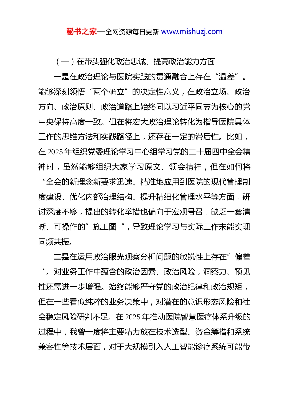 秘书之家—全网资源每日更新 www.mishuzj.com医院党委书记 2025 年度民主生活会个人对照检查材料 根据市委和市卫健委党工委关于召开 2025 年度民主生活会的统一部署,本人在会前紧紧围绕本次民主生活会主题,系统重温了习近平新时代中国特色社会主义思想的科学体系和核心要义,深入学习了党的二十届三中、四中全会精神,特别是习近平总书记关于党的建设的重要思想和关于严肃党内政治生活的重要论述。同时,我还深度研读了新修订的《中国共产党纪律处分条例。在此基础上,我与班子成员逐一开展了深入的谈心谈话,并广泛征求了分管领域、基层党支部和部分党员干部群众的意见建议。通过以上准备工作,我进一步深化了认识、统一了思想,也更加清醒地看到了自身在思想、政治、作风、能力、廉洁等方面存在的差距和不足。下面,我将本着对党忠诚、对事业负责的态度,进行深刻的自我剖析,恳请同志们批评指正。一、存在的主要问题对照本次民主生活会明确的五个方面重点内容,我坚持把自己摆进去、把职责摆进去、把工作摆进去,全面查摆了自身存在的问题。秘书之家—全网资源每日更新 www.mishuzj.com(一)在带头强化政治忠诚、提高政治能力方面一是在政治理论与医院实践的贯通融合上存在“温差”。能够深刻领悟“两个确立”的决定性意义,在政治立场、政治方向、政治原则、政治道路上始终同以习近平同志为核心的党中央保持高度一致。但在将宏大政治理论转化为指导医院具体工作的思维方法和实践路径上,还存在一定的滞后性。比如,在 2025 年组织党委理论学习中心组学习党的二十届四中全会精神时,虽然能够组织大家学习原文、领会精神,但在如何将“全会的新理念新要求迅速、精准地应用到医院的现代管理制度建设、优化内部治理结构、提升精细化管理水平等方面,研讨深度不够,提出的转化举措也偏向于宏观号召,缺乏一套清晰、可操作的”施工图“,导致理论学习与实际工作未能实现同频共振。二是在运用政治眼光观察分析问题的敏锐性上存在”偏差“。对业务工作中蕴含的政治因素、政治风险,洞察力、预见性还需进一步增强。始终能够严守党的政治纪律和政治规矩,但在一些看似纯粹的业务决策中,对潜在的意识形态风险和社会稳定风险研判不足。在 2025 年推动医院智慧医疗体系升级的过程中,我曾一度将主要精力放在技术选型、资金筹措和系统兼容性等技术层面,对于大规模引入人工智能诊疗系统可能带秘书之家—全网资源每日更新 www.mishuzj.com来的数据安全、算法公平性、医患伦理以及对传统诊疗模式的冲击等深层次问题,未能从维护群众根本利益和医疗领域意识形态安全的政治高度进行前瞻性布局和风险评估,导致后续在试点推广中出现了一些数据隐私方面的争议,虽然及时进行了补救,但反映出我在驾驭复杂局面中的政治能力尚有欠缺。三是在贯彻落实上级决策部署的创造性上存在”落差“。对中央、省委和市委的各项决策部署,能够做到闻令而动、坚决执行,但在结合医院实际、推动政策创造性落地上思考不深、办法不多。去年,市委市政府对全市公共卫生应急管理体系建设提出了新的更高要求,要求各大医院强化平急转换能力。在推进这项工作中,我更多的是按照上级文件要求,按部就班地改造硬件设施、组建应急队伍、储备防疫物资,但在如何创新应急管理机制、优化跨部门协同流程、利用信息化手段提升预警和响应效率等”自选动作“上,缺乏突破性思维,使得我院的应急体系建设虽然达到了标准,却未能形成具有自身特色的亮点和优势,未能完全将上级的”任务单“转化为推动医院高质量发展的”成绩单“。(二)在带头固本培元、增强党性方面一是在理论学习的系统性和钻研深度上有所不足。能够坚持把学习习近平新时代中国特色社会主义思想作为首要政治任秘书之家—全网资源每日更新 www.mishuzj.com务,但有时存在”任务驱动“的学习心态,满足于完成”规定动作“,静下心来读原著、学原文、悟原理的韧劲不足,导致对一些新思想、新论断的理解停留在”知其然“的层面。在学习”中国式现代化“这一重大理论创新时,虽然能够清晰阐述其五个方面的中国特色,但在如何深刻理解其对公立医院改革发展...