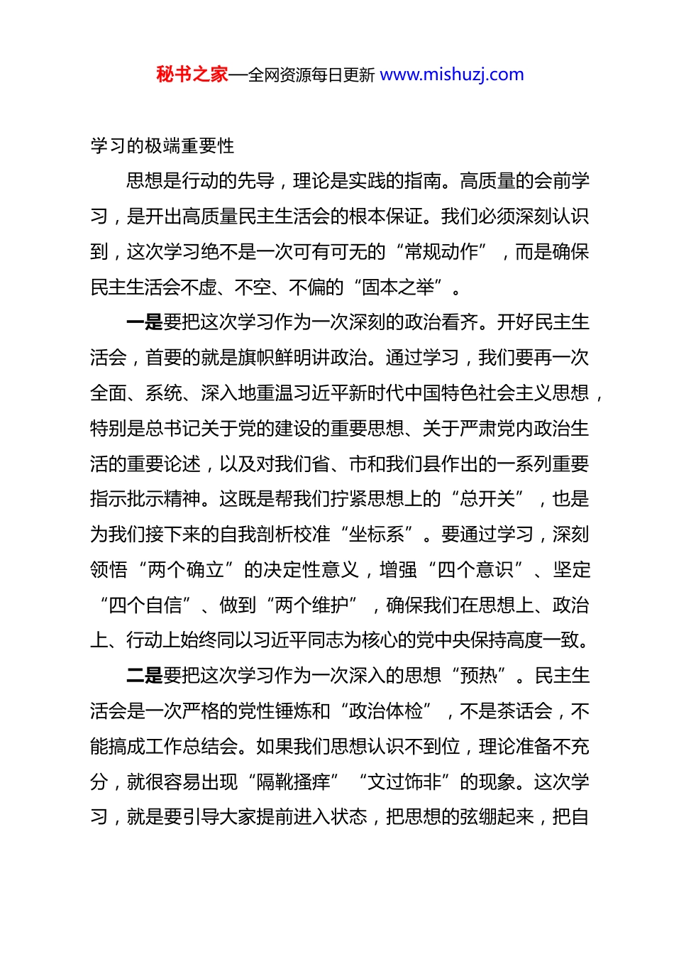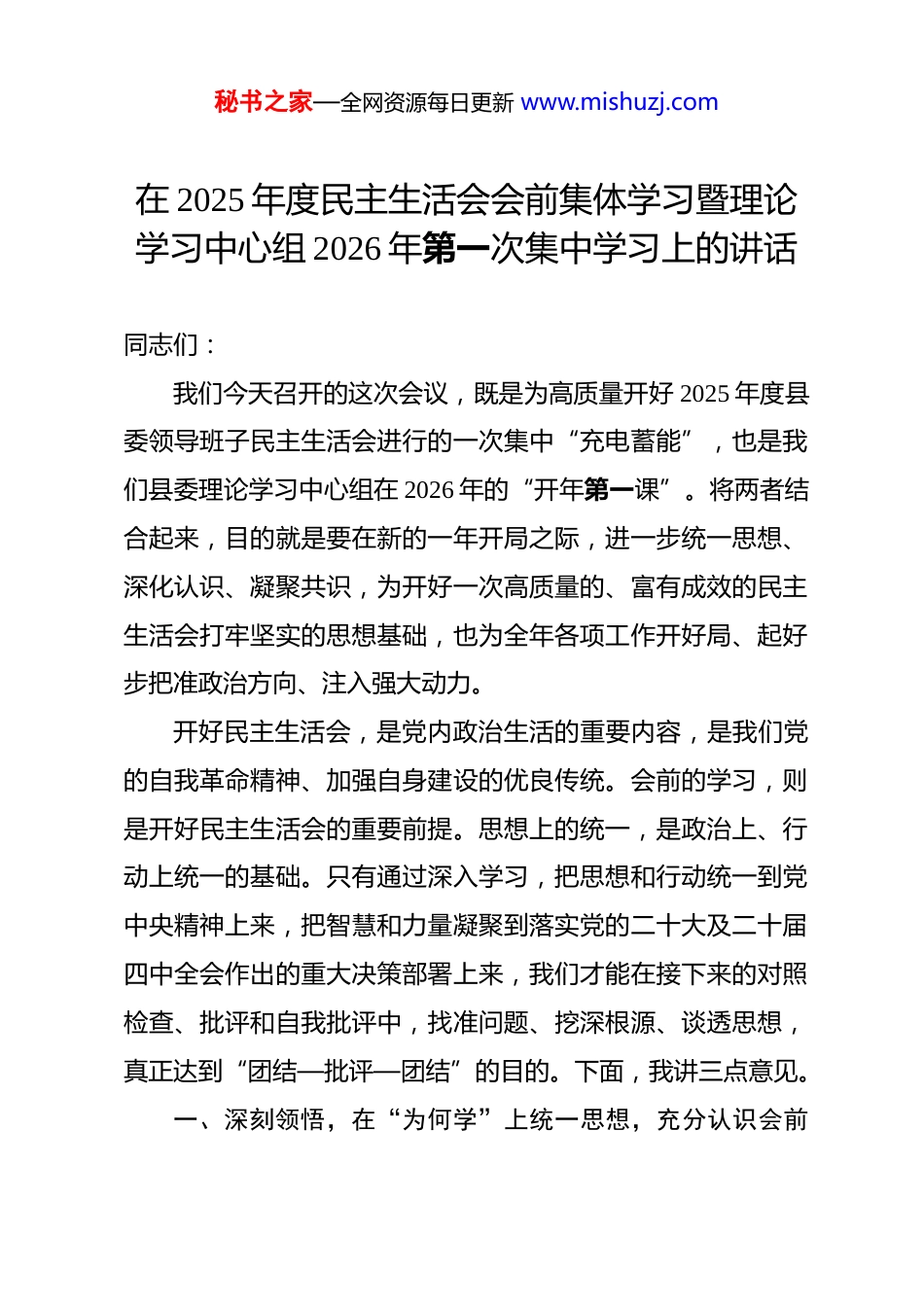 秘书之家—全网资源每日更新 www.mishuzj.com在 2025 年度民主生活会会前集体学习暨理论学习中心组 2026 年第一次集中学习上的讲话 同志们:我们今天召开的这次会议,既是为高质量开好 2025 年度县委领导班子民主生活会进行的一次集中“充电蓄能”,也是我们县委理论学习中心组在 2026 年的“开年第一课”。将两者结合起来,目的就是要在新的一年开局之际,进一步统一思想、深化认识、凝聚共识,为开好一次高质量的、富有成效的民主生活会打牢坚实的思想基础,也为全年各项工作开好局、起好步把准政治方向、注入强大动力。开好民主生活会,是党内政治生活的重要内容,是我们党的自我革命精神、加强自身建设的优良传统。会前的学习,则是开好民主生活会的重要前提。思想上的统一,是政治上、行动上统一的基础。只有通过深入学习,把思想和行动统一到党中央精神上来,把智慧和力量凝聚到落实党的二十大及二十届四中全会作出的重大决策部署上来,我们才能在接下来的对照检查、批评和自我批评中,找准问题、挖深根源、谈透思想,真正达到“团结—批评—团结”的目的。下面,我讲三点意见。一、深刻领悟,在“为何学”上统一思想,充分认识会前秘书之家—全网资源每日更新 www.mishuzj.com学习的极端重要性思想是行动的先导,理论是实践的指南。高质量的会前学习,是开出高质量民主生活会的根本保证。我们必须深刻认识到,这次学习绝不是一次可有可无的“常规动作”,而是确保民主生活会不虚、不空、不偏的“固本之举”。一是要把这次学习作为一次深刻的政治看齐。开好民主生活会,首要的就是旗帜鲜明讲政治。通过学习,我们要再一次全面、系统、深入地重温习近平新时代中国特色社会主义思想,特别是总书记关于党的建设的重要思想、关于严肃党内政治生活的重要论述,以及对我们省、市和我们县作出的一系列重要指示批示精神。这既是帮我们拧紧思想上的“总开关”,也是为我们接下来的自我剖析校准“坐标系”。要通过学习,深刻领悟“两个确立”的决定性意义,增强“四个意识”、坚定“四个自信”、做到“两个维护”,确保我们在思想上、政治上、行动上始终同以习近平同志为核心的党中央保持高度一致。二是要把这次学习作为一次深入的思想“预热”。民主生活会是一次严格的党性锤炼和“政治体检”,不是茶话会,不能搞成工作总结会。如果我们思想认识不到位,理论准备不充分,就很容易出现“隔靴搔痒”“文过饰非”的现象。这次学习,就是要引导大家提前进入状态,把思想的弦绷起来,把自秘书之家—全网资源每日更新 www.mishuzj.com我革命的勇气鼓起来。要通过学习,把自己摆进去、把职责摆进去、把工作摆进去,深入思考我们班子和个人在政治、思想、能力、作风、纪律等方面存在的差距和不足,为后续深入查摆问题、撰写对照检查材料做好充分的思想准备。三是要把这次学习作为一次精准的靶向“对焦”。民主生活会要解决问题,前提是找准问题。这次学习,就是要对照党中央提出的新思想、新论断、新要求,像照镜子一样,反思我们工作中存在的短板和弱项。比如,对照发展新质生产力的要求,我们县的产业转型升级还有哪些瓶颈?对照推进乡村全面振兴的要求,我们的特色产业发展和美乡村建设还有哪些差距?对照增进民生福祉的要求,我们在解决群众急难愁盼问题上还有哪些不足?只有通过学习,把上级的要求领会透了,把县情实际看清了,我们才能把问题找得更准、把根源挖得更深、把整改的方向定得更明。二、学深悟透,在“学什么”上聚焦重点,为开好民主生活会夯实理论根基学习不能泛泛而学,必须抓住核心、聚焦重点。我们要紧紧围绕本次民主生活会的主题,带着问题学、联系实际学,切实做到学有所思、学有所悟、学有所得。一是要在强化政治忠诚上学深悟透。要重点学习领会总书秘书之家—全网资源每日更新 www.mishuzj.com记关于加强党的政治建设,坚决做到“两个维护”等重要论述。深刻理解政治忠诚不是抽象的,而是具体的、实践的。要深入思考,我们是否真正做到了胸怀“国之大者”,时刻关注党中央在关心什么、强调什么;我们是否不折不扣地贯彻执行了上级的各项决策部署,有没...