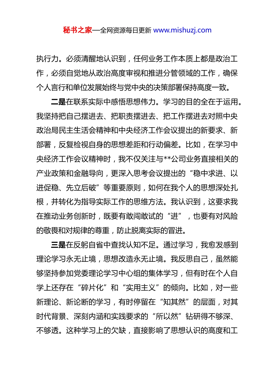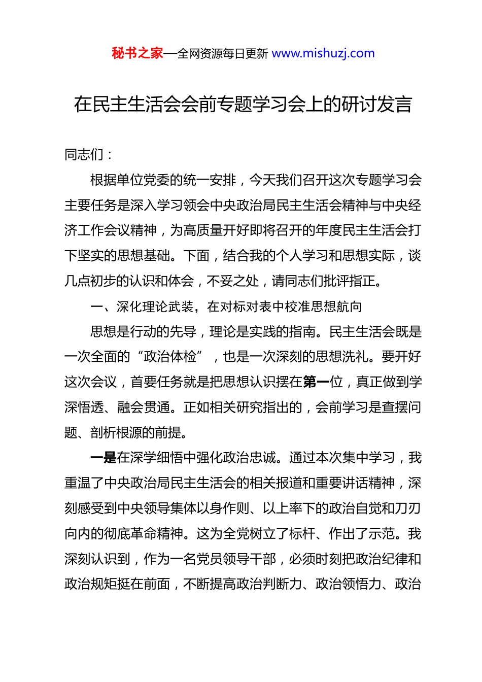 秘书之家—全网资源每日更新 www.mishuzj.com在民主生活会会前专题学习会上的研讨发言 同志们:根据单位党委的统一安排,今天我们召开这次专题学习会主要任务是深入学习领会中央政治局民主生活会精神与中央经济工作会议精神,为高质量开好即将召开的年度民主生活会打下坚实的思想基础。下面,结合我的个人学习和思想实际,谈几点初步的认识和体会,不妥之处,请同志们批评指正。一、深化理论武装,在对标对表中校准思想航向思想是行动的先导,理论是实践的指南。民主生活会既是一次全面的“政治体检”,也是一次深刻的思想洗礼。要开好这次会议,首要任务就是把思想认识摆在第一位,真正做到学深悟透、融会贯通。正如相关研究指出的,会前学习是查摆问题、剖析根源的前提。一是在深学细悟中强化政治忠诚。通过本次集中学习,我重温了中央政治局民主生活会的相关报道和重要讲话精神,深刻感受到中央领导集体以身作则、以上率下的政治自觉和刀刃向内的彻底革命精神。这为全党树立了标杆、作出了示范。我深刻认识到,作为一名党员领导干部,必须时刻把政治纪律和政治规矩挺在前面,不断提高政治判断力、政治领悟力、政治秘书之家—全网资源每日更新 www.mishuzj.com执行力。必须清醒地认识到,任何业务工作本质上都是政治工作,必须自觉地从政治高度审视和推进分管领域的工作,确保个人言行和单位发展始终与党中央的决策部署保持高度一致。二是在联系实际中感悟思想伟力。学习的目的全在于运用。我坚持把自己摆进去、把职责摆进去、把工作摆进去对照中央政治局民主生活会精神和中央经济工作会议提出的新要求、新部署,反复检视自身的思想差距和行动偏差。比如,在学习中央经济工作会议精神时,我不仅关注与**公司业务直接相关的产业政策和金融导向,更深入思考会议提出的“稳中求进、以进促稳、先立后破”等重要原则,如何在我个人的思想深处扎根,并转化为指导实际工作的思维方法。我认识到,这要求我在推动业务创新时,既要有敢闯敢试的“进”,也要有对风险的敬畏和对规律的尊重,防止脱离实际的冒进。三是在反躬自省中查找认知不足。通过学习,我愈发感到理论学习永无止境,思想改造永无止境。我反思自己,虽然能够坚持参加党委理论学习中心组的集体学习,但有时在个人自学上还存在“碎片化”和“实用主义”的倾向。比如,对一些新理论、新论断的学习,有时停留在“知其然”的层面,对其时代背景、深刻内涵和实践要求的“所以然”钻研得不够深、不够透。这种学习上的欠缺,直接影响了思想认识的高度和工秘书之家—全网资源每日更新 www.mishuzj.com作谋划的深度,这是我必须正视并加以改进的。二、坚持问题导向,以动真碰硬的态度剖析自我民主生活会的核心在于严肃开展批评和自我批评。自我批评必须要有勇气和担当,敢于揭短亮丑,触及思想和灵魂的深处。对照学习内容和党员标准,结合同志们在会前谈心谈话中对我提出的宝贵意见,我初步查摆了自身存在的一些问题和不足。一是在理想信念的锤炼上还需持续加压。我始终坚信共产主义远大理想,但在具体的实践中,有时会不自觉地把远大理想和现实工作割裂开来。面对当前错综复杂的经济金融形势和公司转型发展的艰巨任务,偶尔会产生畏难情绪和本领恐慌,攻坚克难的锐气和斗争精神有所减弱。究其根源,还是在于党性修养的“内功”练得不够扎实未能时时刻刻用最高标准来要求自己,导致在面对重大挑战时,思想深处的韧劲和定力出现松动。二是在宗旨意识的践行上还需继续深化。作为班子成员,我深知自己手中的权力来自人民,必须服务于企业发展和职工群众。在工作中,我也努力做到深入基层、了解实情。但我必须坦诚,这种“深入”的质量还有待提高。有时下去调研,听取汇报、开座谈会多,与一线员工进行“零距离”、不设防的秘书之家—全网资源每日更新 www.mishuzj.com谈心交流少;关心工作任务完成情况多,对员工思想动态、家庭困难等方面的关心关怀少。这反映出我内心深处的群众观念还不够牢固,没有真正做到从根本上解决“为了谁、依靠谁、我是谁”的问题。三是在工作作风的改进上还需更加严格。我反思,随着工作阅历的增长,有时...