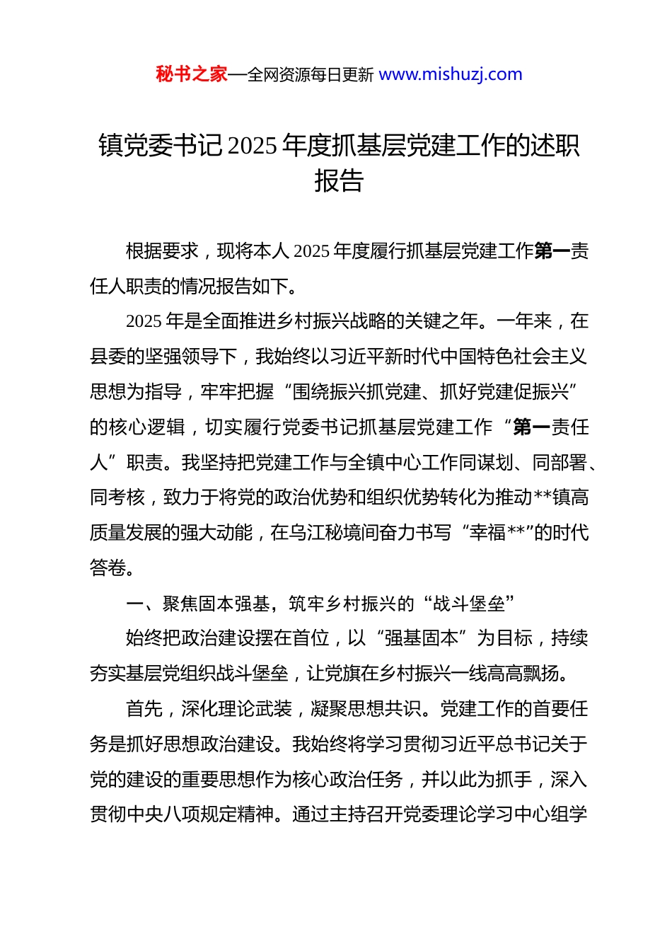 秘书之家—全网资源每日更新 www.mishuzj.com镇党委书记 2025 年度抓基层党建工作的述职报告 根据要求,现将本人 2025 年度履行抓基层党建工作第一责任人职责的情况报告如下。2025 年是全面推进乡村振兴战略的关键之年。一年来,在县委的坚强领导下,我始终以习近平新时代中国特色社会主义思想为指导,牢牢把握“围绕振兴抓党建、抓好党建促振兴”的核心逻辑,切实履行党委书记抓基层党建工作“第一责任人”职责。我坚持把党建工作与全镇中心工作同谋划、同部署、同考核,致力于将党的政治优势和组织优势转化为推动**镇高质量发展的强大动能,在乌江秘境间奋力书写“幸福**”的时代答卷。一、聚焦固本强基,筑牢乡村振兴的“战斗堡垒”始终把政治建设摆在首位,以“强基固本”为目标,持续夯实基层党组织战斗堡垒,让党旗在乡村振兴一线高高飘扬。首先,深化理论武装,凝聚思想共识。党建工作的首要任务是抓好思想政治建设。我始终将学习贯彻习近平总书记关于党的建设的重要思想作为核心政治任务,并以此为抓手,深入贯彻中央八项规定精神。通过主持召开党委理论学习中心组学秘书之家—全网资源每日更新 www.mishuzj.com习研讨,带头讲授专题党课,推动理论学习从“浅尝辄止”向“学用贯通”转变。2025 年以来,镇党委理论学习中心组围绕党的最新理论成果和乡村振兴战略开展了 11 次集中研讨,确保班子成员先学一步、深学一层。同时,指导全镇 24 个党支部完成 11 轮次集中学习,并依托“三会一课”、主题党日等载体,组织开展了超过 260 场形式多样的主题党日活动,覆盖全体 300余名党员。通过系统性、常态化的学习,引导广大党员干部从党的创新理论中汲取破解发展难题的“金钥匙”,寻找推动振兴发展的“金点子”。其次,狠抓组织建设,夯实执政根基。我严格履行全面从严治党主体责任,对标县级“排队抓尾”工作要求,针对部分党组织战斗力不强的问题,量身定制了镇级整顿方案。我明确村党组织书记为整改“第一责任人”,并亲自挂帅督导,确保责任层层压实。目前,所有被识别的软弱涣散党组织均已顺利通过上级验收,组织力得到显著提升。为构建常态化长效管理机制,我牵头建立了党建结对联系机制,由班子成员分片包保全镇 19 个村(社区)党组织。通过推行“六个一”工作法,有效推动了干部作风的持续转变,基层党组织的凝聚力和战斗力得到显著增强。再者,建强干部队伍,注入发展活力。乡村振兴,关键在秘书之家—全网资源每日更新 www.mishuzj.com人。我高度重视干部队伍和人才队伍建设。通过公开招考、“乡情引归”等方式,成功引进了 2 名急需的专业化人才,有效优化了干部队伍结构。目前,全镇村“两委”干部的平均年龄逐步下降,大专及以上学历占比已提升至 50%,队伍结构实现了“年轻化、知识化”的优化升级。为提升干部履职能力,我组织开展了 4 次“强村带弱村”结对帮扶活动和 6 场党务专题培训,覆盖干部达 80 人次。在党员发展方面,严格执行“一人一档一编码”精细化管理。2025 年新发展的 13 名党员中,35岁以下的青年党员占比高达 92.31%,同步储备了 70 名入党积极分子和 60 名后备力量,为党组织注入了源源不断的新鲜血液。同时,为强化监督执纪,镇里新增了专职纪检干部,织密了基层监督网络,常态化开展作风教育整顿,确保干部队伍纪律意识与服务意识“双提升”。二、聚焦治建并举,激活乡村治理的“动力引擎”坚持党建引领,创新治理模式,着力构建“共建共治共享”的乡村治理新格局。既运用“硬措施”筑牢安全防线,更通过“软服务”温暖群众心田,让基层治理既有力度更有温度。一是健全治理网络,凝聚多方合力。我牵头建立了“镇—村—组”三级矛盾调解网络,并积极吸纳 20 名经验丰富的退休干部、老党员及退役军人加入调解员队伍,与司法所、派出所秘书之家—全网资源每日更新 www.mishuzj.com形成“1.N”联动治理合力。这支队伍充分发挥其亲缘、地缘优势,不仅带头参与矛盾纠纷调解,还主动倡树文明新风。针对红白事简办等群众普遍关切的问题,指导各村“一村一策”制定个性化村规民约,从源头上遏制铺张浪费...