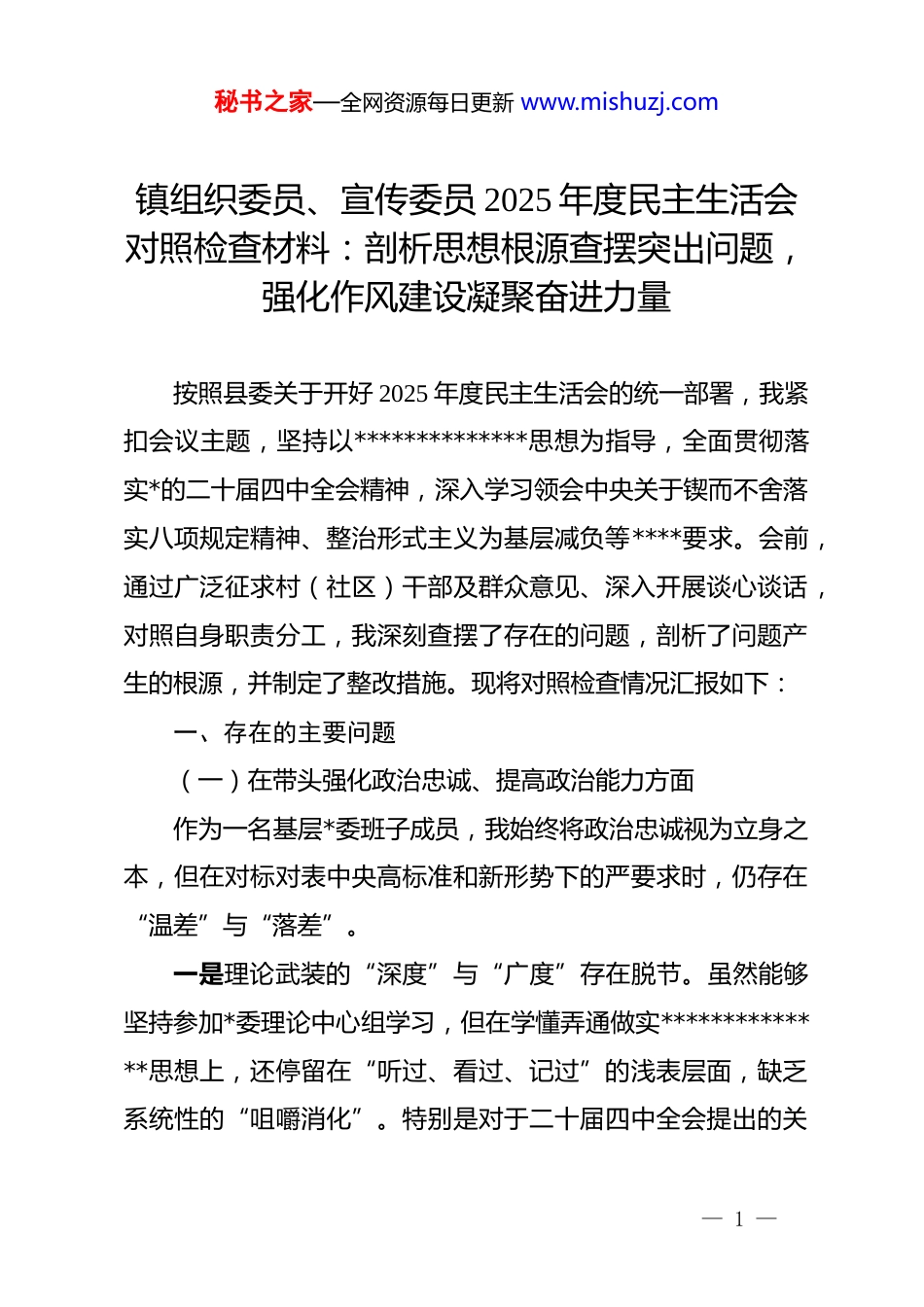 秘书之家—全网资源每日更新 www.mishuzj.com镇组织委员、宣传委员 2025 年度民主生活会对照检查材料:剖析思想根源查摆突出问题,强化作风建设凝聚奋进力量按照县委关于开好 2025 年度民主生活会的统一部署,我紧扣会议主题,坚持以**************思想为指导,全面贯彻落实*的二十届四中全会精神,深入学习领会中央关于锲而不舍落实八项规定精神、整治形式主义为基层减负等****要求。会前,通过广泛征求村(社区)干部及群众意见、深入开展谈心谈话,对照自身职责分工,我深刻查摆了存在的问题,剖析了问题产生的根源,并制定了整改措施。现将对照检查情况汇报如下:一、存在的主要问题(一)在带头强化政治忠诚、提高政治能力方面作为一名基层*委班子成员,我始终将政治忠诚视为立身之本,但在对标对表中央高标准和新形势下的严要求时,仍存在“温差”与“落差”。一是理论武装的“深度”与“广度”存在脱节。虽然能够坚持参加*委理论中心组学习,但在学懂弄通做实**************思想上,还停留在“听过、看过、记过”的浅表层面,缺乏系统性的“咀嚼消化”。特别是对于二十届四中全会提出的关— 1 —秘书之家—全网资源每日更新 www.mishuzj.com于深化*的建设制度改革、完善意识形态工作责任制等新论断,往往是机械式传达,未能结合镇情实际进行深度转化。例如,在向村级*组织宣讲政策时,习惯于“照本宣科”读文件,未能将“法言法语”转化为群众爱听的“乡音土话”,导致部分农村*员对*的创新理论理解不深、吃得不透。二是政治敏锐性的“触角”延伸不够灵敏。身兼宣传委员之职,在意识形态领域的斗争精神还不够强,对网络舆情和苗头性问题的政治鉴别力有待提高。在处理一些涉及征地拆迁、邻里纠纷引发的网络杂音时,往往将其单纯视为具体事务性问题,缺乏从政治高度审视其背后可能隐藏的风险隐患。对于个别自媒体账号为了博眼球而夸大事实、抹黑基层形象的言论,有时存在“只要不形成热点就暂缓处理”的侥幸心理,未能第一时间发声亮剑、正本清源,在抢占舆论制高点上显得较为被动。三是贯彻落实上级决策部署存在“时差”。在执行“两个维护”上,有时存在表态快、行动慢的现象,特别是面对一些长期困扰基层的“硬骨头”任务时,存在畏难情绪。比如,在推进农村*员档案规范化管理、整顿软弱涣散村*组织等工作中,虽然按要求制定了方案,但在具体推动过程中,考虑到历史遗留问题多、矛盾错综复杂,有时步子迈得不够大,工作节奏未— 2 —秘书之家—全网资源每日更新 www.mishuzj.com能完全跟上县委的要求,导致部分工作在“最后一公里”出现了中梗阻。(二)在带头固本培元、增强*性方面*性修养是*员干部的终身必修课,反躬自省,我在理想信念的坚守和*内政治生活的锤炼上,还存在松劲懈怠的倾向。一是精神之“钙”补得不够足。随着工作年限的增长,潜意识里认为自己受*教育多年,政治立场坚定,不会出大问题,因而有时把工作当成了硬指标,把*性锻炼当成了软任务。在日常工作中,更多精力集中在应对考核、完成指标等事务性工作上,静下心来读原著、学原文、悟原理的时间被挤占。在遇到挫折和困难时,偶尔会产生“歇一歇、喘口气”的念头,缺乏革命战争年代先辈们那种“越是艰险越向前”的钢铁意志,用*的科学理论武装头脑、指导实践、推动工作的自觉性有所弱化。二是组织生活的“熔炉”火候不够旺。作为组织委员,本应在*内政治生活上作表率,但有时在参加双重组织生活会时,身份意识淡化,以普通*员身份开展批评与自我批评时“辣味”不足。在指导各村(社区)*支部开展“三会一课”、主题*日活动时,有时过于注重形式上的规范,如看台账齐不齐、照片有没有,而忽视了活动的实际教育效果。导致个别村级*组织的组织生活流于形式,缺乏吸引力和感染力,未能真正起到凝聚*— 3 —秘书之家—全网资源每日更新 www.mishuzj.com员、教育群众的作用。三是*性教育的方式方法不够新。在抓*员教育管理时,惯用老办法、老套路,创新意识不强。虽然建立了流动*员微信群、开设了线上课堂,但内容更新不及时,互动性差,往往是“单向灌输”多,“双向交流”少。特别是针对农村...