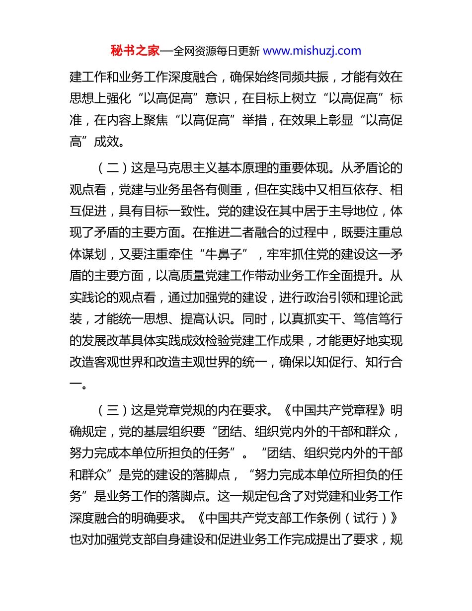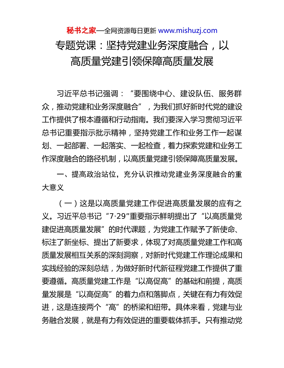 秘书之家—全网资源每日更新 www.mishuzj.com专题党课:坚持党建业务深度融合,以高质量党建引领保障高质量发展习近平总书记强调:“要围绕中心、建设队伍、服务群众,推动党建和业务深度融合”,为我们抓好新时代党的建设工作提供了根本遵循和行动指南。我们要深入学习贯彻习近平总书记重要指示批示精神,坚持党建工作和业务工作一起谋划、一起部署、一起落实、一起检查,着力探索党建和业务工作深度融合的路径机制,以高质量党建引领保障高质量发展。一、提高政治站位,充分认识推动党建业务深度融合的重大意义(一)这是以高质量党建工作促进高质量发展的应有之义。习近平总书记“7·29”重要指示鲜明提出了“以高质量党建促进高质量发展”的时代课题,为党建工作赋予了新使命、标注了新坐标、提出了新要求,体现了对高质量党建工作和高质量发展相互关系的深刻洞察,对新时代党建工作理论成果和实践经验的深刻总结,为做好新时代新征程党建工作提供了重要遵循。高质量党建工作是“以高促高”的基础和前提,高质量发展是“以高促高”的着力点和落脚点,关键在有力有效促进,这是连接两个“高”的桥梁和纽带。具体来看,党建与业务融合发展,就是有力有效促进的重要载体抓手。只有推动党秘书之家—全网资源每日更新 www.mishuzj.com建工作和业务工作深度融合,确保始终同频共振,才能有效在思想上强化“以高促高”意识,在目标上树立“以高促高”标准,在内容上聚焦“以高促高”举措,在效果上彰显“以高促高”成效。(二)这是马克思主义基本原理的重要体现。从矛盾论的观点看,党建与业务虽各有侧重,但在实践中又相互依存、相互促进,具有目标一致性。党的建设在其中居于主导地位,体现了矛盾的主要方面。在推进二者融合的过程中,既要注重总体谋划,又要注重牵住“牛鼻子”,牢牢抓住党的建设这一矛盾的主要方面,以高质量党建工作带动业务工作全面提升。从实践论的观点看,通过加强党的建设,进行政治引领和理论武装,才能统一思想、提高认识。同时,以真抓实干、笃信笃行的发展改革具体实践成效检验党建工作成果,才能更好地实现改造客观世界和改造主观世界的统一,确保以知促行、知行合一。(三)这是党章党规的内在要求。《中国共产党章程》明确规定,党的基层组织要“团结、组织党内外的干部和群众,努力完成本单位所担负的任务”。“团结、组织党内外的干部和群众”是党的建设的落脚点,“努力完成本单位所担负的任务”是业务工作的落脚点。这一规定包含了对党建和业务工作深度融合的明确要求。《中国共产党支部工作条例(试行)》也对加强党支部自身建设和促进业务工作完成提出了要求,规秘书之家—全网资源每日更新 www.mishuzj.com定“各级党和国家机关中的党支部,围绕服务中心、建设队伍开展工作,发挥对党员的教育、管理、监督作用,协助本部门行政负责人完成任务、改进工作”。总的来看,从党章到其他党内法规,既对党建和业务工作深度融合提出了明确要求,又给以高质量党建促进高质量发展指明了路径、提供了探索空间。(四)这推动务虚务实有机结合的必然途径。务虚和务实是工作中常见的两种方法,既相互区别又辩证统一。党建工作是做“人”的工作,相对容易理解成“虚”功,是潜移默化、润物无声的;业务工作是做“事”的工作,是“实”绩,看得见、摸得着、可量化。从实践来看,“人”和“事”、“实绩”和“虚功”往往是相互交织、相互融合的,不能简单地将党建和业务割裂开来,要系统谋划、统筹推进党建工作和业务工作,使二者互为补充、相得益彰。二、坚持问题导向,准确把握当前推动党建和业务工作深度融合存在的突出问题对标对表党中央和省委的要求,认真分析市直机关基层党组织建设面临的复杂形势,梳理基层党组织高质量发展过程中的突出问题,既与全国有共性的方面,也有自身特殊的情况,但最突出最现实的仍然是党建与业务相脱节的问题。(一)政治功能发挥还不够充分,在责任落实上还有差秘书之家—全网资源每日更新 www.mishuzj.com距。一些党员干部政治站位不够高,知责于心、担责于身、履责于行有欠缺,工作推一推才动一动,责任意识不够牢、...