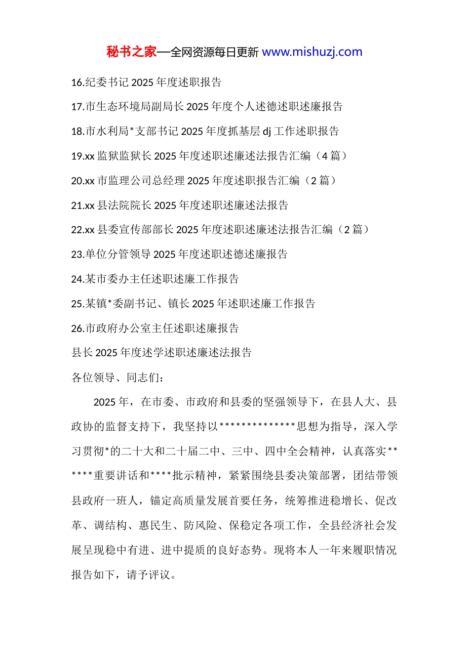 秘书之家—全网资源每日更新 www.mishuzj.com(33 篇)2025 年度述学述职述廉述法报告汇编1.县长 2025 年度述学述职述廉述法报告2.2025 年度书记个人述职述廉报告3.2025 年领导干部述职报告4.副部长 2025 年度述职述廉述学述法报告5.区交警大队纪检委员 2025 年度述职报告6.市住房和城乡建设局*组书记、局长 2025 年度述职述廉报告7.县纪委书记 2025 年度个人述学述职述廉述法报告8.县统计局局长 2025 年度述职述德述廉述法报告9.县委办公室主任 2025 年度述职述廉述 dj 报告10.镇*委书记 2025 年度述职报告11.政治处主任 2025 年度个人述职报告12.2025 年度市商务局领导班子述职述廉报告13.2025 年支行行长述职报告14.xx 县人民法院院长 2025 年述职述廉述法报告15.集团*委书记、董事长 2025 年度个人述职报告秘书之家—全网资源每日更新 www.mishuzj.com16.纪委书记 2025 年度述职报告17.市生态环境局副局长 2025 年度个人述德述职述廉报告18.市水利局*支部书记 2025 年度抓基层 dj 工作述职报告19.xx 监狱监狱长 2025 年度述职述廉述法报告汇编(4 篇)20.xx 市监理公司总经理 2025 年度述职报告汇编(2 篇)21.xx 县法院院长 2025 年度述职述廉述法报告22.xx 县委宣传部部长 2025 年度述职述廉述法报告汇编(2 篇)23.单位分管领导 2025 年度述职述德述廉报告24.某市委办主任述职述廉工作报告25.某镇*委副书记、镇长 2025 年述职述廉工作报告26.市政府办公室主任述职述廉报告县长 2025 年度述学述职述廉述法报告各位领导、同志们: 2025 年,在市委、市政府和县委的坚强领导下,在县人大、县政协的监督支持下,我坚持以**************思想为指导,深入学习贯彻*的二十大和二十届二中、三中、四中全会精神,认真落实******重要讲话和****批示精神,紧紧围绕县委决策部署,团结带领县政府一班人,锚定高质量发展首要任务,统筹推进稳增长、促改革、调结构、惠民生、防风险、保稳定各项工作,全县经济社会发展呈现稳中有进、进中提质的良好态势。现将本人一年来履职情况报告如下,请予评议。秘书之家—全网资源每日更新 www.mishuzj.com 一、述学情况 始终把加强学习作为提升素质能力的重要途径,坚持在学中干、干中学,不断增强政治判断力、政治领悟力、政治执行力。一是强化理论武装。坚持把学习**************思想作为首要政治任务,深入学习*的二十大和二十届二中、三中、四中全会精神,认真领会******关于经济工作、乡村振兴、生态文明建设等方面的重要论述,全年参加县委理论学习中心组学习 xx 次,撰写学习心得 xx 篇,切实做到学思用贯通、知信行统一。二是扎实开展深入贯彻中央八项规定精神学习教育。按照中央统一部署和省市县委工作安排,自 2025年全国两会后至 7 月,在县政府系统深入开展学习教育,组织专题读书班 2 期、集中研讨 6 次,一体推进学查改,深刻领会******关于加强*的作风建设的重要论述精神,对照中央八项规定及其实施细则要求,认真检视自身和政府系统存在的问题,推动作风建设常态化长效化。三是持续巩固 dj 学习教育成果。将《中国共产 dj 律处分条例》作为必修课,紧扣"六项纪律"逐条学习、对照检视,教育引导政府系统*员干部增强纪律意识和规矩意识,做到知敬畏、存戒惧、守底线。四是注重学用结合。坚持向书本学、向实践学、向群众学,结合县域发展实际,深入学习研究产业发展、招商引资、项目建设、城镇化建设等方面的政策和知识,全年深入基层调研 xx 次,形成调研报告 xx 篇,有效提升了驾驭复杂局面、解决实际问题的能力。秘书之家—全网资源每日更新 www.mishuzj.com 二、述职情况 紧紧围绕县委决策部署,认真履行政府工作职责,全力推动经济社会高质量发展。一是经济运行稳中向好。坚持稳字当头、稳中求进,全力以赴稳增长、促发展。预计全年地区生产总值增长 xx%,固定资产投资增长 xx%,社会消费品零售总额增长 xx%,一般公共预算收入增长 xx%,主要经济指标保持在合理区间。二是产业转型扎实推进。深入实施产业强县战略,加快培育壮大主...