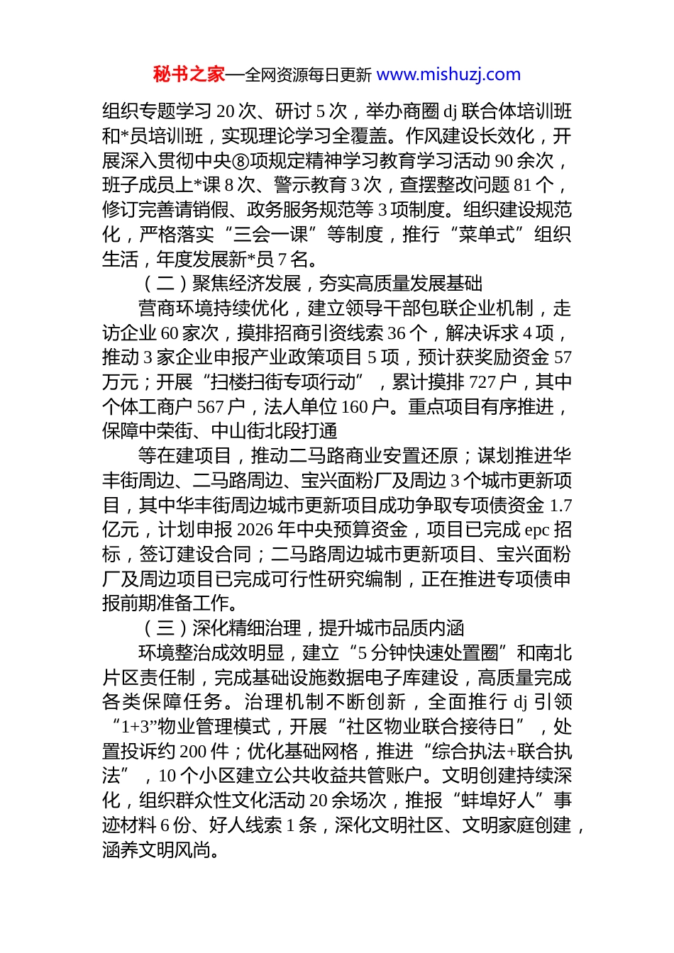 秘书之家—全网资源每日更新 www.mishuzj.comxx 街道办事处 2025 年工作总结和 2026 年工作计划2025 年以来,xx 街道在区委、区政府的坚强领导下,以**************思想为指导,全面贯彻*的二十大及二十届历次全会精神,紧扣中心工作部署,锚定高质量发展首要任务,统筹推进经济社会发展与安全稳定,各项工作取得显著成效。一、争取荣誉情况(一)省级以上层面喻义巷社区荣获安徽省“百佳”村规民约(居民公约)。(二)市级层面喻义巷社区荣获“蚌埠市先进*组织”荣誉。二、本单位亮点工作dj 引领基层治理成效显著,深化“邻里守望·共建助老”“睦邻 dj·善治先锋”等品牌建设,优化“红色物业+积分制”,构建“1+5+n”志愿服务架构,累计解决民生诉求150 余件。经济发展动能持续增强,成功谋划 3 个城市更新项目,争取专项债 xx 亿元、中央预算资金 xx 万元,其中华丰街周边城市更新项目成功争取专项债资金 xx 亿元。民生服务精准高效,构建“双轨服务+分层施策”助老体系,建立老年服务档案 344 个;矛盾纠纷调解成功率达100%,反电诈工作成效突出,案发警情低于全区平均水平,辖区和谐稳定局面持续巩固。三、整体工作(一)强化政治引领,筑牢基层 dj 根基理论武装常态化,执行*工委理论学习中心组学习制度,秘书之家—全网资源每日更新 www.mishuzj.com组织专题学习 20 次、研讨 5 次,举办商圈 dj 联合体培训班和*员培训班,实现理论学习全覆盖。作风建设长效化,开展深入贯彻中央⑧项规定精神学习教育学习活动 90 余次,班子成员上*课 8 次、警示教育 3 次,查摆整改问题 81 个,修订完善请销假、政务服务规范等 3 项制度。组织建设规范化,严格落实“三会一课”等制度,推行“菜单式”组织生活,年度发展新*员 7 名。(二)聚焦经济发展,夯实高质量发展基础营商环境持续优化,建立领导干部包联企业机制,走访企业 60 家次,摸排招商引资线索 36 个,解决诉求 4 项,推动 3 家企业申报产业政策项目 5 项,预计获奖励资金 57万元;开展“扫楼扫街专项行动”,累计摸排 727 户,其中个体工商户 567 户,法人单位 160 户。重点项目有序推进,保障中荣街、中山街北段打通等在建项目,推动二马路商业安置还原;谋划推进华丰街周边、二马路周边、宝兴面粉厂及周边 3 个城市更新项目,其中华丰街周边城市更新项目成功争取专项债资金 1.7亿元,计划申报 2026 年中央预算资金,项目已完成 epc 招标,签订建设合同;二马路周边城市更新项目、宝兴面粉厂及周边项目已完成可行性研究编制,正在推进专项债申报前期准备工作。(三)深化精细治理,提升城市品质内涵环境整治成效明显,建立“5 分钟快速处置圈”和南北片区责任制,完成基础设施数据电子库建设,高质量完成各类保障任务。治理机制不断创新,全面推行 dj 引领“1+3”物业管理模式,开展“社区物业联合接待日”,处置投诉约 200 件;优化基础网格,推进“综合执法+联合执法”,10 个小区建立公共收益共管账户。文明创建持续深化,组织群众性文化活动 20 余场次,推报“蚌埠好人”事迹材料 6 份、好人线索 1 条,深化文明社区、文明家庭创建,涵养文明风尚。秘书之家—全网资源每日更新 www.mishuzj.com(四)坚守为民初心,增进民生福祉水平社会保障精准有力,动态管理困难群体,现有低保 79户 89 人、特困 1 户 1 人, 实施救急难救助 5 人、临时救助13 人;举办线上线下招聘会 7 场,提供岗位 200 余个,优化养老服务中心功能。文化服务提质增效,提升街道综合文化站、社区文化服务中心效能,优化公共文化设施免费开放管理,围绕传统节日和重大主题开展特色活动,丰富群众精神文化生活。(五)严守安全底线,维护辖区和谐稳定安全生产责任压实,落实“*政同责、一岗双责”,排查整改安全隐患 56 处,修订应急预案,组织应急演练 6 次,严格执行 24 小时值班值守制度。风险防范化解有效,坚持新时代“枫桥经验”,调处矛盾纠纷 130 余件,调解成功率100%; 开展反电诈宣传,案发警情降至 12 件,加强特殊人群服...