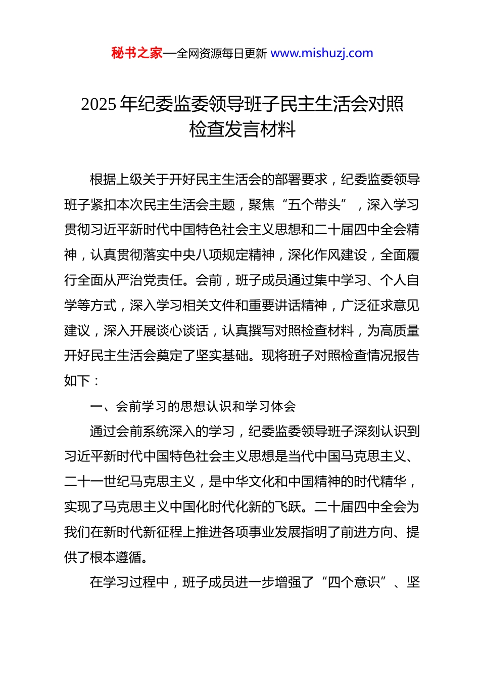 秘书之家—全网资源每日更新 www.mishuzj.com2025 年纪委监委领导班子民主生活会对照检查发言材料 根据上级关于开好民主生活会的部署要求,纪委监委领导班子紧扣本次民主生活会主题,聚焦“五个带头”,深入学习贯彻习近平新时代中国特色社会主义思想和二十届四中全会精神,认真贯彻落实中央八项规定精神,深化作风建设,全面履行全面从严治党责任。会前,班子成员通过集中学习、个人自学等方式,深入学习相关文件和重要讲话精神,广泛征求意见建议,深入开展谈心谈话,认真撰写对照检查材料,为高质量开好民主生活会奠定了坚实基础。现将班子对照检查情况报告如下:一、会前学习的思想认识和学习体会通过会前系统深入的学习,纪委监委领导班子深刻认识到习近平新时代中国特色社会主义思想是当代中国马克思主义、二十一世纪马克思主义,是中华文化和中国精神的时代精华,实现了马克思主义中国化时代化新的飞跃。二十届四中全会为我们在新时代新征程上推进各项事业发展指明了前进方向、提供了根本遵循。在学习过程中,班子成员进一步增强了“四个意识”、坚秘书之家—全网资源每日更新 www.mishuzj.com定了“四个自信”、做到了“两个维护”,深刻领会了全面从严治党的重大意义和丰富内涵。我们认识到,纪委监委作为党内监督和国家监察的专责机关,肩负着维护党的纪律、保障国家法律实施的重要使命,必须以更高的政治站位、更严的工作标准、更实的工作作风,忠诚履行党章和宪法赋予的职责,为经济社会高质量发展提供坚强保障。同时,通过学习中央八项规定精神,我们更加清醒地认识到作风建设永远在路上,必须持之以恒正风肃纪,坚决防止“四风”问题反弹回潮,营造风清气正的政治生态。二、存在问题(一)带头强化政治忠诚、提高政治能力方面一是政治理论学习深度不够:虽然班子成员能够积极参加各类政治理论学习活动,但在学习的深度和系统性上还有待加强。部分同志存在学习碎片化、表面化的问题,对习近平新时代中国特色社会主义思想和二十届四中全会精神的理解还停留在浅层次,没有真正做到学深悟透、融会贯通,在运用党的创新理论指导实践、推动工作方面还有一定差距。二是政治敏锐性和鉴别力有待提高:在面对复杂多变的形势和各种思潮的冲击时,个别班子成员政治敏锐性和鉴别力不够强,对一些错误言论和不良现象缺乏及时有效的辨别和抵制。秘书之家—全网资源每日更新 www.mishuzj.com在处理一些涉及政治原则的问题时,有时存在思想认识不够深刻、行动不够果断的情况,没有充分发挥纪委监委在维护政治安全和意识形态安全方面的重要作用。三是政治能力与新时代纪检监察工作要求还有差距:随着全面从严治党向纵深发展,纪检监察工作面临着许多新任务、新挑战,对领导班子的政治能力提出了更高要求。部分班子成员在应对复杂局面、解决复杂问题时,政治站位不够高,缺乏系统性、前瞻性的思维和谋划,在运用政治思维和政治方法开展监督执纪问责和监督调查处置工作方面还有待进一步提高。(二)带头固本培元、增强党性方面一是党性修养不够自觉:个别班子成员在日常工作和生活中,对党性修养的重要性认识不足,缺乏自我反省和自我提高的意识。在面对一些利益诱惑时,有时不能严格按照党员领导干部的标准要求自己,存在一定的私心杂念,没有始终做到大公无私、公而忘私。二是党内政治生活不够严肃:虽然班子能够按照规定定期召开民主生活会和组织生活会,但在开展批评与自我批评时,有时存在“走过场”的现象。部分同志批评他人时避重就轻、蜻蜓点水,自我批评时遮遮掩掩、避实就虚,没有真正达到红脸出汗、排毒治病的效果,影响了党内政治生活的严肃性和实秘书之家—全网资源每日更新 www.mishuzj.com效性。三是宗旨意识有所淡化:在工作中,个别班子成员对群众的利益诉求关注不够,缺乏主动深入基层、深入群众了解情况的积极性和主动性。在处理一些涉及群众利益的问题时,有时存在推诿扯皮、敷衍了事的现象,没有真正把群众的冷暖放在心上,没有做到全心全意为人民服务。(三)带头敬畏人民、敬畏组织、敬畏法纪方面一是对群众监督的重视程度不够:虽然我们建立了一系列接受群...