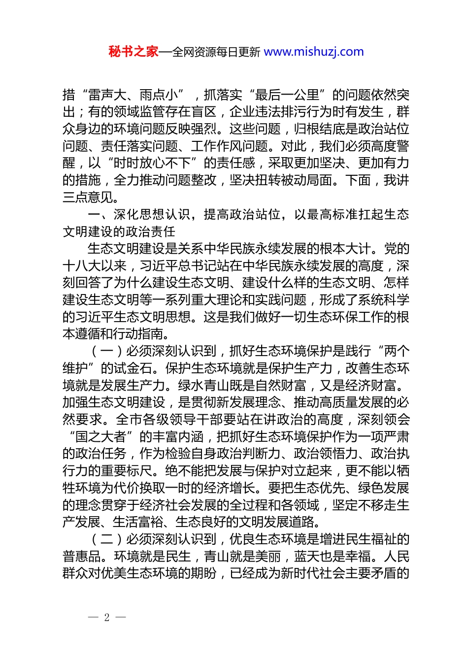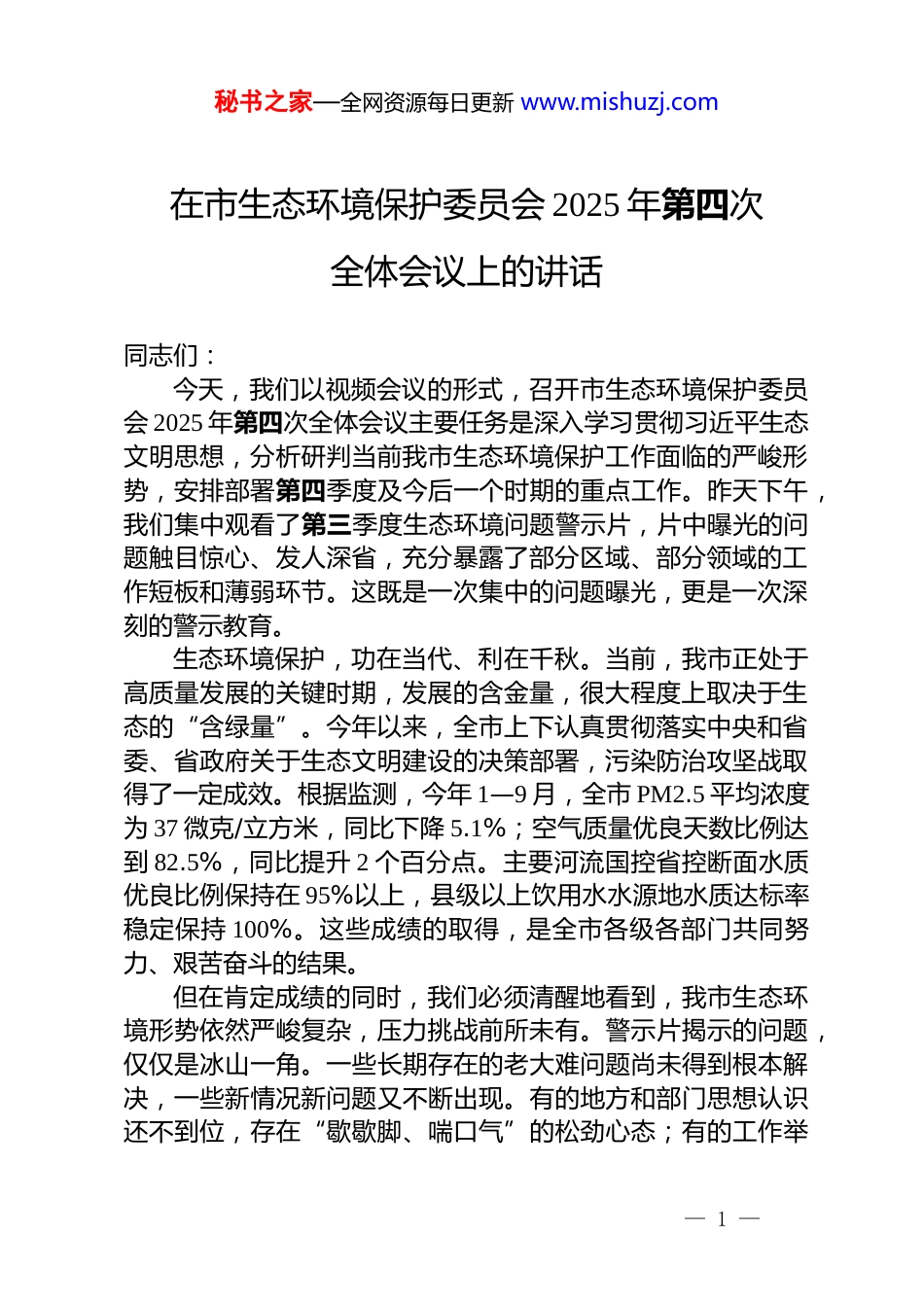 秘书之家—全网资源每日更新 www.mishuzj.com在市生态环境保护委员会 2025 年第四次全体会议上的讲话同志们:今天,我们以视频会议的形式,召开市生态环境保护委员会 2025 年第四次全体会议主要任务是深入学习贯彻习近平生态文明思想,分析研判当前我市生态环境保护工作面临的严峻形势,安排部署第四季度及今后一个时期的重点工作。昨天下午,我们集中观看了第三季度生态环境问题警示片,片中曝光的问题触目惊心、发人深省,充分暴露了部分区域、部分领域的工作短板和薄弱环节。这既是一次集中的问题曝光,更是一次深刻的警示教育。生态环境保护,功在当代、利在千秋。当前,我市正处于高质量发展的关键时期,发展的含金量,很大程度上取决于生态的“含绿量”。今年以来,全市上下认真贯彻落实中央和省委、省政府关于生态文明建设的决策部署,污染防治攻坚战取得了一定成效。根据监测,今年 1—9 月,全市 PM2.5 平均浓度为 37 微克/立方米,同比下降 5.1%;空气质量优良天数比例达到 82.5%,同比提升 2 个百分点。主要河流国控省控断面水质优良比例保持在 95%以上,县级以上饮用水水源地水质达标率稳定保持 100%。这些成绩的取得,是全市各级各部门共同努力、艰苦奋斗的结果。但在肯定成绩的同时,我们必须清醒地看到,我市生态环境形势依然严峻复杂,压力挑战前所未有。警示片揭示的问题,仅仅是冰山一角。一些长期存在的老大难问题尚未得到根本解决,一些新情况新问题又不断出现。有的地方和部门思想认识还不到位,存在“歇歇脚、喘口气”的松劲心态;有的工作举— 1 —秘书之家—全网资源每日更新 www.mishuzj.com措“雷声大、雨点小”,抓落实“最后一公里”的问题依然突出;有的领域监管存在盲区,企业违法排污行为时有发生,群众身边的环境问题反映强烈。这些问题,归根结底是政治站位问题、责任落实问题、工作作风问题。对此,我们必须高度警醒,以“时时放心不下”的责任感,采取更加坚决、更加有力的措施,全力推动问题整改,坚决扭转被动局面。下面,我讲三点意见。一、深化思想认识,提高政治站位,以最高标准扛起生态文明建设的政治责任生态文明建设是关系中华民族永续发展的根本大计。党的十八大以来,习近平总书记站在中华民族永续发展的高度,深刻回答了为什么建设生态文明、建设什么样的生态文明、怎样建设生态文明等一系列重大理论和实践问题,形成了系统科学的习近平生态文明思想。这是我们做好一切生态环保工作的根本遵循和行动指南。(一)必须深刻认识到,抓好生态环境保护是践行“两个维护”的试金石。保护生态环境就是保护生产力,改善生态环境就是发展生产力。绿水青山既是自然财富,又是经济财富。加强生态文明建设,是贯彻新发展理念、推动高质量发展的必然要求。全市各级领导干部要站在讲政治的高度,深刻领会“国之大者”的丰富内涵,把抓好生态环境保护作为一项严肃的政治任务,作为检验自身政治判断力、政治领悟力、政治执行力的重要标尺。绝不能把发展与保护对立起来,更不能以牺牲环境为代价换取一时的经济增长。要把生态优先、绿色发展的理念贯穿于经济社会发展的全过程和各领域,坚定不移走生产发展、生活富裕、生态良好的文明发展道路。(二)必须深刻认识到,优良生态环境是增进民生福祉的普惠品。环境就是民生,青山就是美丽,蓝天也是幸福。人民群众对优美生态环境的期盼,已经成为新时代社会主要矛盾的— 2 —秘书之家—全网资源每日更新 www.mishuzj.com重要方面。昨天警示片中反映的餐饮油烟、施工噪声、企业异味等问题,虽然看似“小事”,但都直接关系到群众的日常生活和切身利益。解决好这些群众“家门口”的突出环境问题,是我们义不容辞的责任。必须坚持以人民为中心的发展思想,用心用情用力解决好群众反映强烈的生态环境问题,重拳整治各类污染扰民行为,让人民群众在优美的生态环境中享受生活、感受幸福,不断提升群众的获得感、幸福感、安全感。(三)必须深刻认识到,环境风险防范是守住安全底线的硬任务。生态环境安全是国家安全体系的重要组成部分。当前,我市产业结构偏重、能源结构偏煤的状况尚未...