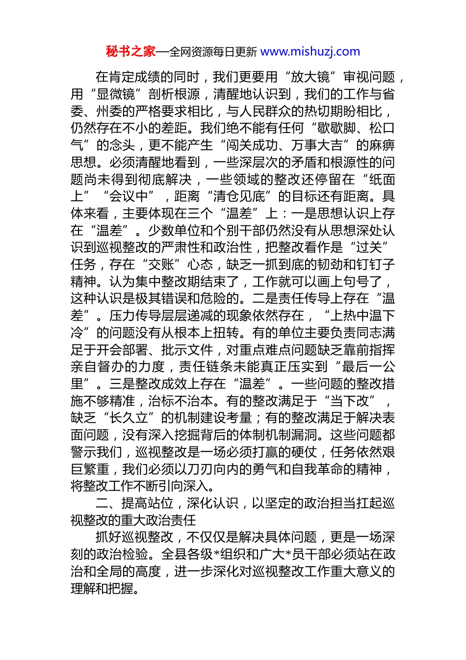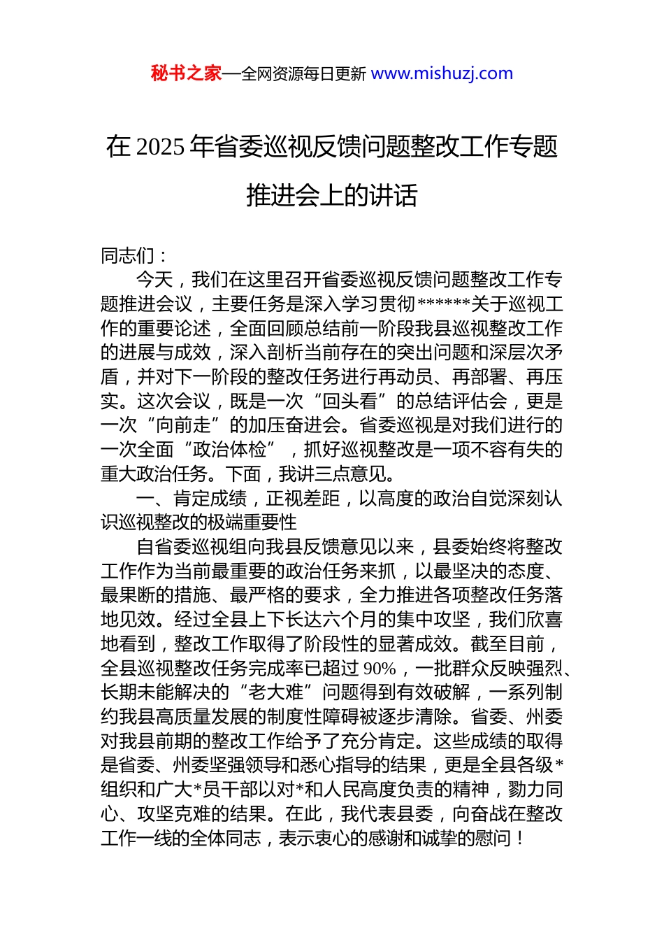 秘书之家—全网资源每日更新 www.mishuzj.com在 2025 年省委巡视反馈问题整改工作专题推进会上的讲话同志们:今天,我们在这里召开省委巡视反馈问题整改工作专题推进会议,主要任务是深入学习贯彻******关于巡视工作的重要论述,全面回顾总结前一阶段我县巡视整改工作的进展与成效,深入剖析当前存在的突出问题和深层次矛盾,并对下一阶段的整改任务进行再动员、再部署、再压实。这次会议,既是一次“回头看”的总结评估会,更是一次“向前走”的加压奋进会。省委巡视是对我们进行的一次全面“政治体检”,抓好巡视整改是一项不容有失的重大政治任务。下面,我讲三点意见。一、肯定成绩,正视差距,以高度的政治自觉深刻认识巡视整改的极端重要性自省委巡视组向我县反馈意见以来,县委始终将整改工作作为当前最重要的政治任务来抓,以最坚决的态度、最果断的措施、最严格的要求,全力推进各项整改任务落地见效。经过全县上下长达六个月的集中攻坚,我们欣喜地看到,整改工作取得了阶段性的显著成效。截至目前,全县巡视整改任务完成率已超过 90%,一批群众反映强烈、长期未能解决的“老大难”问题得到有效破解,一系列制约我县高质量发展的制度性障碍被逐步清除。省委、州委对我县前期的整改工作给予了充分肯定。这些成绩的取得是省委、州委坚强领导和悉心指导的结果,更是全县各级*组织和广大*员干部以对*和人民高度负责的精神,勠力同心、攻坚克难的结果。在此,我代表县委,向奋战在整改工作一线的全体同志,表示衷心的感谢和诚挚的慰问!秘书之家—全网资源每日更新 www.mishuzj.com在肯定成绩的同时,我们更要用“放大镜”审视问题,用“显微镜”剖析根源,清醒地认识到,我们的工作与省委、州委的严格要求相比,与人民群众的热切期盼相比,仍然存在不小的差距。我们绝不能有任何“歇歇脚、松口气”的念头,更不能产生“闯关成功、万事大吉”的麻痹思想。必须清醒地看到,一些深层次的矛盾和根源性的问题尚未得到彻底解决,一些领域的整改还停留在“纸面上”“会议中”,距离“清仓见底”的目标还有距离。具体来看,主要体现在三个“温差”上:一是思想认识上存在“温差”。少数单位和个别干部仍然没有从思想深处认识到巡视整改的严肃性和政治性,把整改看作是“过关”任务,存在“交账”心态,缺乏一抓到底的韧劲和钉钉子精神。认为集中整改期结束了,工作就可以画上句号了,这种认识是极其错误和危险的。二是责任传导上存在“温差”。压力传导层层递减的现象依然存在,“上热中温下冷”的问题没有从根本上扭转。有的单位主要负责同志满足于开会部署、批示文件,对重点难点问题缺乏靠前指挥亲自督办的力度,责任链条未能真正压实到“最后一公里”。三是整改成效上存在“温差”。一些问题的整改措施不够精准,治标不治本。有的整改满足于“当下改”,缺乏“长久立”的机制建设考量;有的整改满足于解决表面问题,没有深入挖掘背后的体制机制漏洞。这些问题都警示我们,巡视整改是一场必须打赢的硬仗,任务依然艰巨繁重,我们必须以刀刃向内的勇气和自我革命的精神,将整改工作不断引向深入。二、提高站位,深化认识,以坚定的政治担当扛起巡视整改的重大政治责任抓好巡视整改,不仅仅是解决具体问题,更是一场深刻的政治检验。全县各级*组织和广大*员干部必须站在政治和全局的高度,进一步深化对巡视整改工作重大意义的理解和把握。秘书之家—全网资源每日更新 www.mishuzj.com第一,巡视整改是对政治忠诚的“试金石”。巡视是*之利剑、国之利器。省委巡视反馈的意见,代表的是省委的意见和权威,体现的是*中央的要求。能否不折不扣地抓好整改落实,是检验我们是否同以***同志为核心的*中央保持高度一致的直接体现,是检验我们“四个意识”强不强、“四个自信”牢不牢、“两个维护”做得好不好的重要标尺。我们必须把抓好巡视整改作为一项严肃的政治纪律和政治规矩,以实际行动诠释对*绝对忠诚。任何的敷衍塞责、虚假整改,都是政治上的不成熟、不坚定。第二,巡视整改是推动高质量发展的“催化剂”。巡视反馈的问题,表面上看是工作中的具体偏差,但深层次上反映的是我...