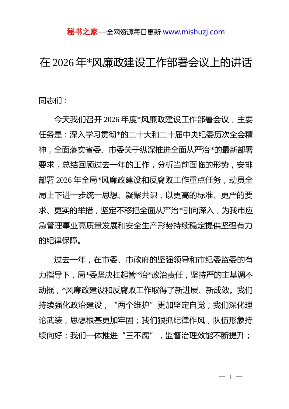 秘书之家—全网资源每日更新 www.mishuzj.com在 2026 年*风廉政建设工作部署会议上的讲话同志们:今天我们召开 2026 年度*风廉政建设工作部署会议,主要任务是:深入学习贯彻*的二十大和二十届中央纪委历次全会精神,全面落实省委、市委关于纵深推进全面从严治*的最新部署要求,总结回顾过去一年的工作,分析当前面临的形势,安排部署 2026 年全局*风廉政建设和反腐败工作重点任务,动员全局上下进一步统一思想、凝聚共识,以更高的标准、更严的要求、更实的举措,坚定不移把全面从严治*引向深入,为我市应急管理事业高质量发展和安全生产形势持续稳定提供坚强有力的纪律保障。过去一年,在市委、市政府的坚强领导和市纪委监委的有力指导下,局*委坚决扛起管*治*政治责任,坚持严的主基调不动摇,*风廉政建设和反腐败工作取得了新进展、新成效。我们持续强化政治建设,“两个维护”更加坚定自觉;我们深化理论武装,思想根基更加牢固;我们狠抓纪律作风,队伍形象持续向好;我们一体推进“三不腐”,监督治理效能不断提升;— 1 —秘书之家—全网资源每日更新 www.mishuzj.com我们压紧压实责任,全面从严治*合力持续增强。在肯定成绩的同时,我们也要清醒地认识到,对照新时代*的建设总要求,对照应急管理职责使命,对照人民群众的期盼,我们的工作还存在一些薄弱环节和不足。比如,理论学习的系统性和转化效果有待提升;纪律教育的针对性、实效性有待增强;重点领域、关键环节的廉政风险防控仍需加强;“四风”问题特别是形式主义、官僚主义仍有表现;监督执纪的精准性和穿透力有待提高等等。对此,我们必须高度重视,采取有力措施,切实加以解决。2026 年是实施“十四五”规划的关键之年,也是应急管理体系和能力现代化建设的深化之年,做好*风廉政建设工作意义重大。下面,我就做好今年工作,讲几点意见:一、突出政治引领,把稳理想信念“方向盘”,在淬炼绝对忠诚上达到新高度*的政治建设是*的根本性建设。应急管理部门首先是政治机关,必须把旗帜鲜明讲政治摆在首位,确保各项工作始终沿着正确方向前进。一是持续强化创新理论武装。要坚持把学懂弄通做实*的创— 2 —秘书之家—全网资源每日更新 www.mishuzj.com新理论作为终身课题,健全完善“第一议题”制度,及时跟进学习******最新重要讲话和****批示精神,特别是关于应急管理、安全生产、防灾减灾救灾的重要论述。要制定年度理论学习计划,通过*委理论学习中心组学习、专题研讨、辅导报告、个人自学等多种形式,引导*员干部深刻领悟“两个确立”的决定性意义,增强“四个意识”、坚定“四个自信”、做到“两个维护”,不断提高政治判断力、政治领悟力、政治执行力,自觉在思想上政治上行动上同*中央保持高度一致。二是严明*的政治纪律和政治规矩。要始终把严守政治纪律和政治规矩作为安身立命的“压舱石”。教育引导全局*员干部牢记“五个必须”,坚决防止“七个有之”。要加强对贯彻执行*中央重大决策部署和省委、市委工作要求情况的监督检查,确保令行禁止、政令畅通。要严肃*内政治生活,严格执行民主集中制、重大事项请示报告等制度,发展积极健康的*内政治文化,坚决反对搞两面派、做两面人。三是扛牢压实政治责任。局*委要切实担负起全面从严治*主体责任,*委书记要履行好第一责任人职责,班子成员要认真履行“一岗双责”。要定期研究*风廉政建设工作,分析研判形势,解决突出问题。要健全责任分解、检查监督、倒查追责的— 3 —秘书之家—全网资源每日更新 www.mishuzj.com完整链条,把责任压力传导到每个支部、每名*员,形成一级抓一级、层层抓落实的工作格局,坚决防止责任虚化空转。二、深化纪律教育,筑牢拒腐防变“防火墙”,在增强纪律自觉上取得新成效加强纪律建设是全面从严治*的治本之策。要把纪律教育摆在更加突出的位置,推动*员干部学纪、知纪、明纪、守纪。一是扎实开展 dj 学习教育。要把学习贯彻新修订的《中国共产 dj 律处分条例》作为重中之重,纳入*员干部培训必修课程。通过举办专题读书班、开展知识竞赛、组织案例剖析等方式,引导*员干部原原本本学、逐章逐条学、联系...