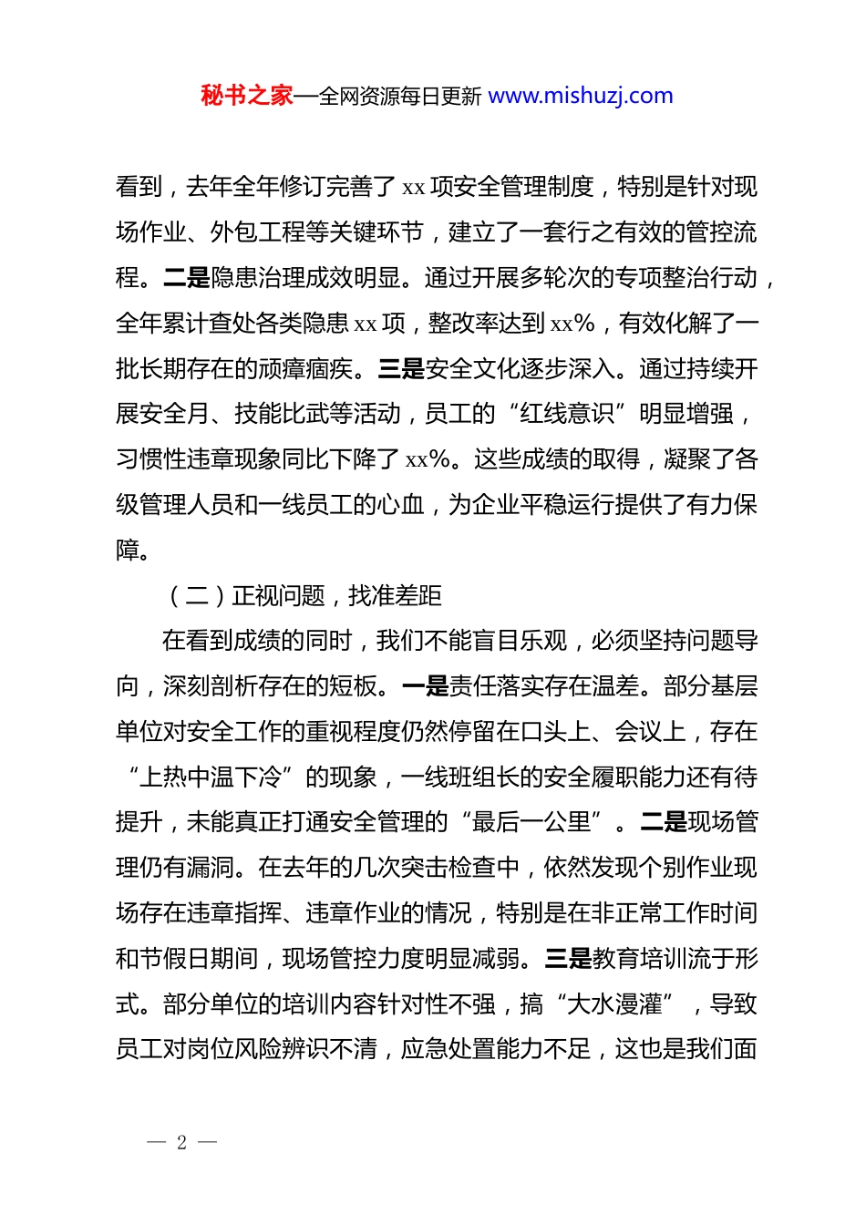 秘书之家—全网资源每日更新 www.mishuzj.com在 2026 年第一季度安委会的讲话:坚守红线底线护航开局起步同志们:今天是 2026 年的第一个工作周,我们召开这次安委会全体扩大会议,主要任务是全面回顾 2025 年安全生产工作,深入分析当前面临的严峻形势,安排部署一季度重点任务。一季度历来是事故易发多发期,也是全年工作的风向标。我们必须迅速从节日的氛围中走出来,归位收心、进入状态,以“开局就是决战、起步就是冲刺”的姿态,坚决克服麻痹思想和侥幸心理,紧紧围绕年度安全目标,层层压实责任,为全年高质量发展奠定坚实的安全基础。一、认清形势、保持清醒,切实增强抓好安全的紧迫感过去的一年,在全体员工的共同努力下,我们经受住了多重考验,安全生产形势总体平稳。但在肯定成绩的同时,我们更要清醒地看到,当前的安全基础尚不牢固,风险挑战依然严峻,必须始终保持如履薄冰的警觉。(一)肯定成绩,坚定信心2025 年,我们坚持“安全第一、预防为主”的方针,扎实推进安全生产治理体系建设。一是制度体系不断完善。我们要— 1 —秘书之家—全网资源每日更新 www.mishuzj.com看到,去年全年修订完善了 xx 项安全管理制度,特别是针对现场作业、外包工程等关键环节,建立了一套行之有效的管控流程。二是隐患治理成效明显。通过开展多轮次的专项整治行动,全年累计查处各类隐患 xx 项,整改率达到 xx%,有效化解了一批长期存在的顽瘴痼疾。三是安全文化逐步深入。通过持续开展安全月、技能比武等活动,员工的“红线意识”明显增强,习惯性违章现象同比下降了 xx%。这些成绩的取得,凝聚了各级管理人员和一线员工的心血,为企业平稳运行提供了有力保障。(二)正视问题,找准差距在看到成绩的同时,我们不能盲目乐观,必须坚持问题导向,深刻剖析存在的短板。一是责任落实存在温差。部分基层单位对安全工作的重视程度仍然停留在口头上、会议上,存在“上热中温下冷”的现象,一线班组长的安全履职能力还有待提升,未能真正打通安全管理的“最后一公里”。二是现场管理仍有漏洞。在去年的几次突击检查中,依然发现个别作业现场存在违章指挥、违章作业的情况,特别是在非正常工作时间和节假日期间,现场管控力度明显减弱。三是教育培训流于形式。部分单位的培训内容针对性不强,搞“大水漫灌”,导致员工对岗位风险辨识不清,应急处置能力不足,这也是我们面— 2 —秘书之家—全网资源每日更新 www.mishuzj.com临的一个突出隐患。(三)研判风险,把握规律一季度受低温雨雪冰冻天气影响,加之春节前后人员思想波动大,是各类安全事故的高发期。从设备设施看,经历了寒冬运行和假期停歇,各类设备进入故障高发期,重启过程中极易发生意外。从人员状态看,节后复工极易出现“假期综合征”,注意力不集中、操作不规范等人为因素风险激增。从生产组织看,为抢抓“开门红”,部分项目可能会出现抢工期、赶进度的情况,容易忽视安全条件确认。因此,我们必须准确把握一季度安全生产的规律特点,超前预判、提前介入,把困难估计得更充分一些,把措施制定得更周密一些,坚决打好防范化解重大风险的主动仗。二、聚焦重点、靶向发力,坚决打赢开局起步的攻坚战做好一季度安全工作,关键在于抓落实。各部门、各单位要紧盯重点领域和关键环节,精准施策、严防死守,确保各项安全防范措施落地见效。(一)聚焦“复工复产”,把好入场关复工复产是当前安全工作的重中之重,必须严格执行“六个一”验收标准。一要上好“开工第一课”。各单位一把手要亲自授课,组织全员观看警示教育片,讲清形势、讲透风险、— 3 —秘书之家—全网资源每日更新 www.mishuzj.com讲明要求,确保员工思想到位、状态到位。二要开展一次全面“体检”。在复工前,必须对所有生产设备、电气线路、消防设施进行一次拉网式排查,重点检查设备的安全防护装置是否完好、仪表参数是否正常,坚决做到“不安全不复工、不合格不生产”。三要严格人员准入。特别是对于新入职员工和转岗人员,必须严格执行三级安全教育培训,考核合格后方可上岗。对于特种作业人员,要逐一核查证件有效期,确保持证...