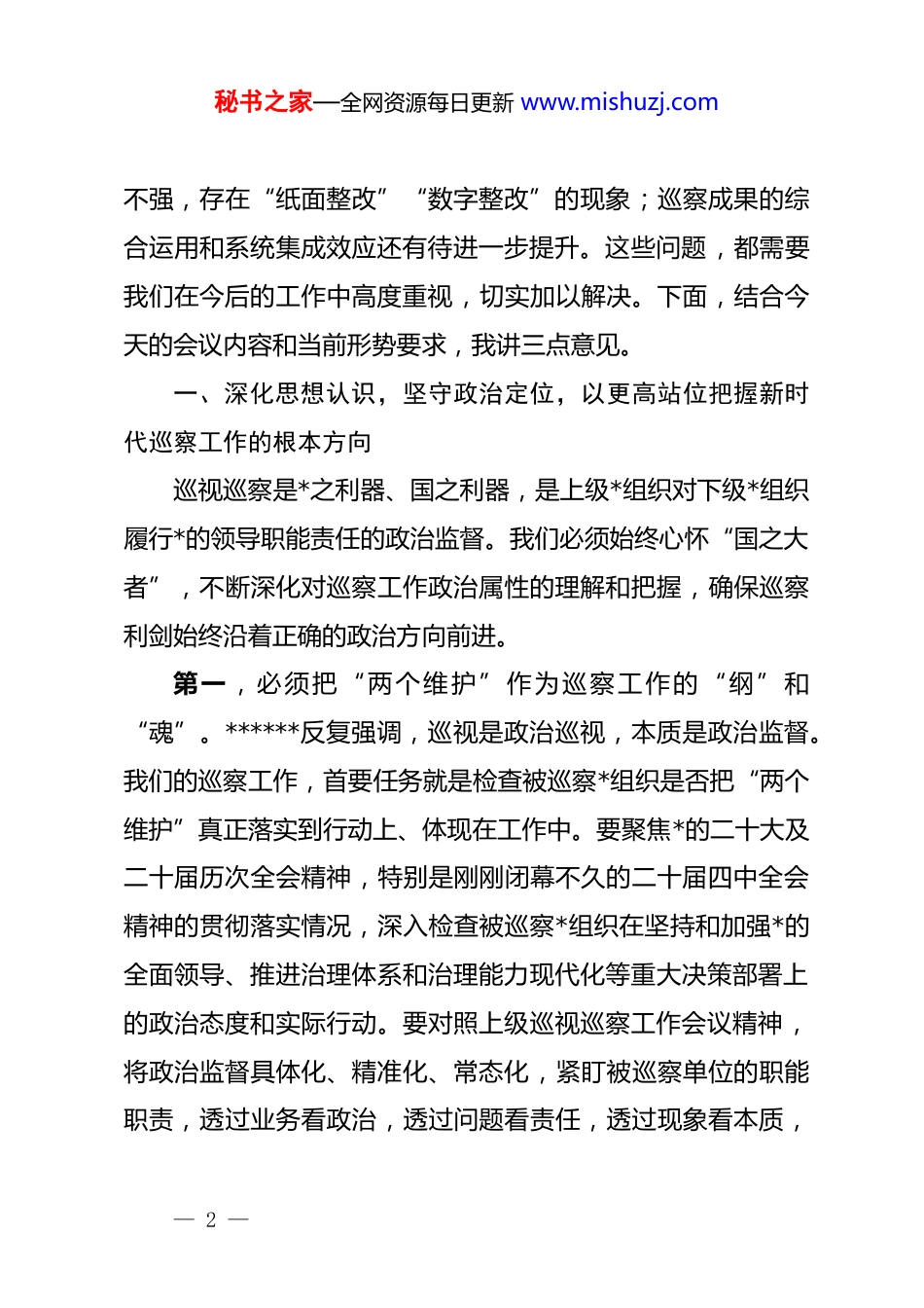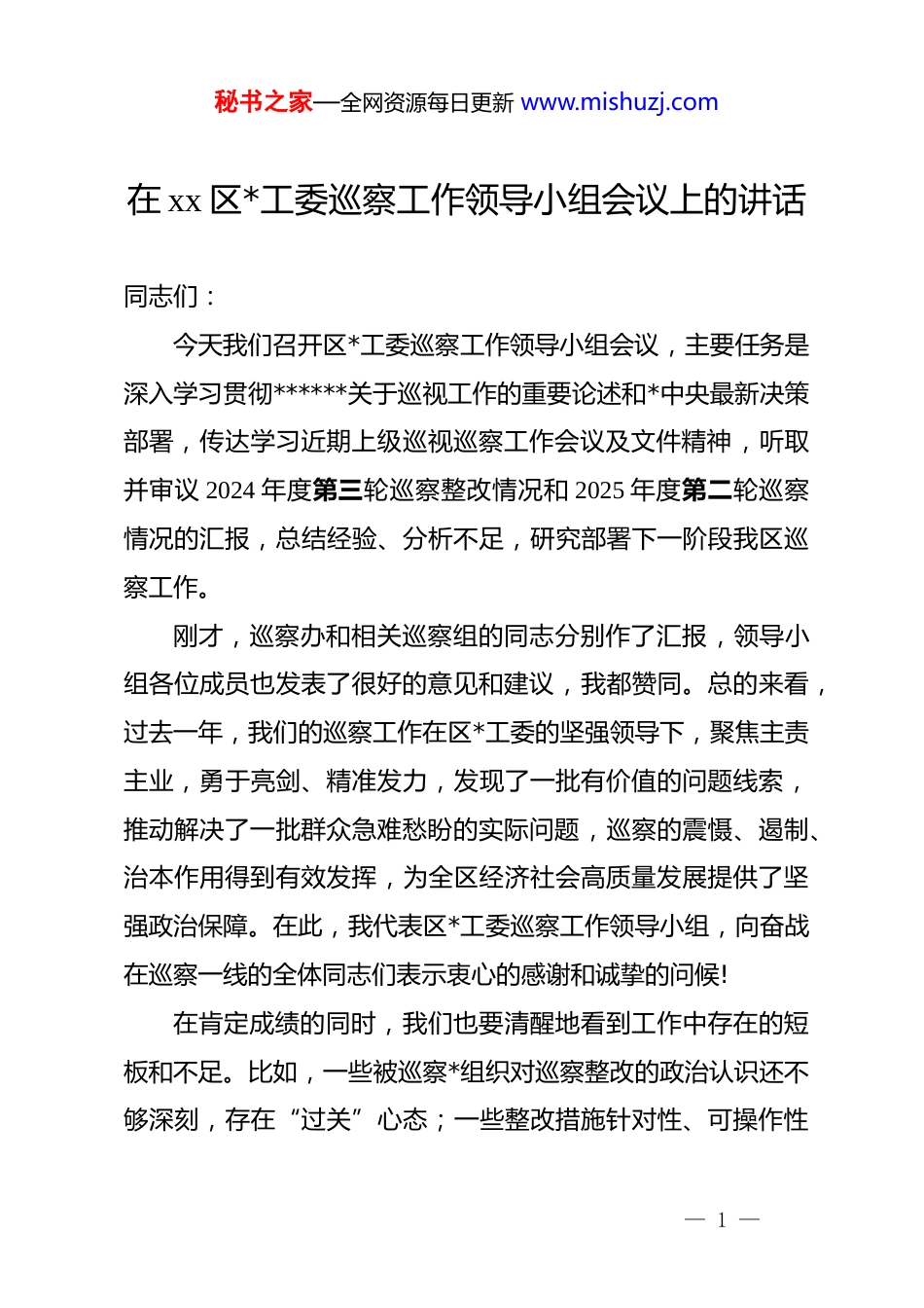 秘书之家—全网资源每日更新 www.mishuzj.com在 xx 区*工委巡察工作领导小组会议上的讲话同志们:今天我们召开区*工委巡察工作领导小组会议,主要任务是深入学习贯彻******关于巡视工作的重要论述和*中央最新决策部署,传达学习近期上级巡视巡察工作会议及文件精神,听取并审议 2024 年度第三轮巡察整改情况和 2025 年度第二轮巡察情况的汇报,总结经验、分析不足,研究部署下一阶段我区巡察工作。刚才,巡察办和相关巡察组的同志分别作了汇报,领导小组各位成员也发表了很好的意见和建议,我都赞同。总的来看,过去一年,我们的巡察工作在区*工委的坚强领导下,聚焦主责主业,勇于亮剑、精准发力,发现了一批有价值的问题线索,推动解决了一批群众急难愁盼的实际问题,巡察的震慑、遏制、治本作用得到有效发挥,为全区经济社会高质量发展提供了坚强政治保障。在此,我代表区*工委巡察工作领导小组,向奋战在巡察一线的全体同志们表示衷心的感谢和诚挚的问候!在肯定成绩的同时,我们也要清醒地看到工作中存在的短板和不足。比如,一些被巡察*组织对巡察整改的政治认识还不够深刻,存在“过关”心态;一些整改措施针对性、可操作性— 1 —秘书之家—全网资源每日更新 www.mishuzj.com不强,存在“纸面整改”“数字整改”的现象;巡察成果的综合运用和系统集成效应还有待进一步提升。这些问题,都需要我们在今后的工作中高度重视,切实加以解决。下面,结合今天的会议内容和当前形势要求,我讲三点意见。一、深化思想认识,坚守政治定位,以更高站位把握新时代巡察工作的根本方向巡视巡察是*之利器、国之利器,是上级*组织对下级*组织履行*的领导职能责任的政治监督。我们必须始终心怀“国之大者”,不断深化对巡察工作政治属性的理解和把握,确保巡察利剑始终沿着正确的政治方向前进。第一,必须把“两个维护”作为巡察工作的“纲”和“魂”。******反复强调,巡视是政治巡视,本质是政治监督。我们的巡察工作,首要任务就是检查被巡察*组织是否把“两个维护”真正落实到行动上、体现在工作中。要聚焦*的二十大及二十届历次全会精神,特别是刚刚闭幕不久的二十届四中全会精神的贯彻落实情况,深入检查被巡察*组织在坚持和加强*的全面领导、推进治理体系和治理能力现代化等重大决策部署上的政治态度和实际行动。要对照上级巡视巡察工作会议精神,将政治监督具体化、精准化、常态化,紧盯被巡察单位的职能职责,透过业务看政治,透过问题看责任,透过现象看本质,— 2 —秘书之家—全网资源每日更新 www.mishuzj.com精准查找和纠正政治偏差。决不能把巡察等同于一般的业务检查或*风廉政建设检查,必须始终突出政治监督的核心地位,确保*中央政令畅通、令行禁止。第二,必须紧扣中心大局发挥监督保障执行、促进完善发展作用。巡察工作不能脱离中心工作搞“体外循环”,必须自觉融入全区发展大局。当前,我区正处于深入实施“十五五”规划的关键起步期,各项改革发展任务艰巨繁重。我们的巡察工作,就是要围绕区*工委的中心任务来谋划和展开。比如,在对经济部门的巡察中,要重点关注其在优化营商环境、服务市场主体、推动产业升级等方面的履职情况;在对民生部门的巡察中,要重点关注其在解决教育、医疗、养老等群众急难愁盼问题上的担当作为;在对基层单位的巡察中,要重点关注其在抓 dj 促乡村振兴、加强基层社会治理等方面的实际成效。通过有力有效的政治巡察,打通政策落实的“中梗阻”,清除影响发展的“绊脚石”,推动各级*组织把智慧和力量凝聚到干事创业上来,以高质量巡察护航全区经济社会高质量发展。第三,必须坚持以人民为中心的发展思想。民心是最大的政治。巡察工作的出发点和落脚点,就是要维护好、实现好、发展好最广大人民的根本利益。要始终站稳人民立场,把群众满意不满意、高兴不高兴、答应不答应作为检验巡察成效的根— 3 —秘书之家—全网资源每日更新 www.mishuzj.com本标准。要畅通群众信访举报渠道,深入基层一线,听民声、察民情、解民忧,重点关注发生在群众身边的腐败问题和不正之风,严肃查处在惠民政策落实中搞变通、打折扣,在服务群...