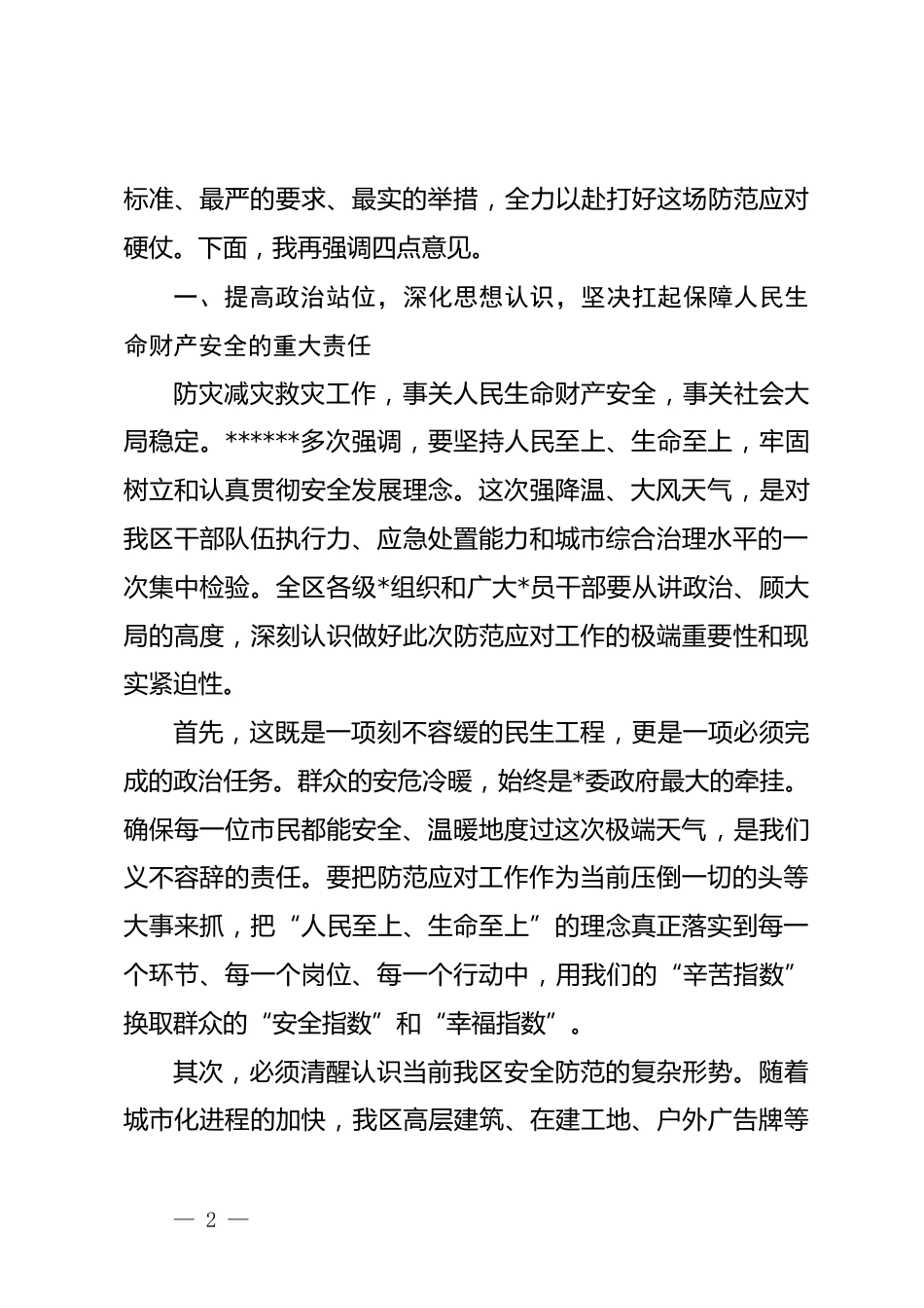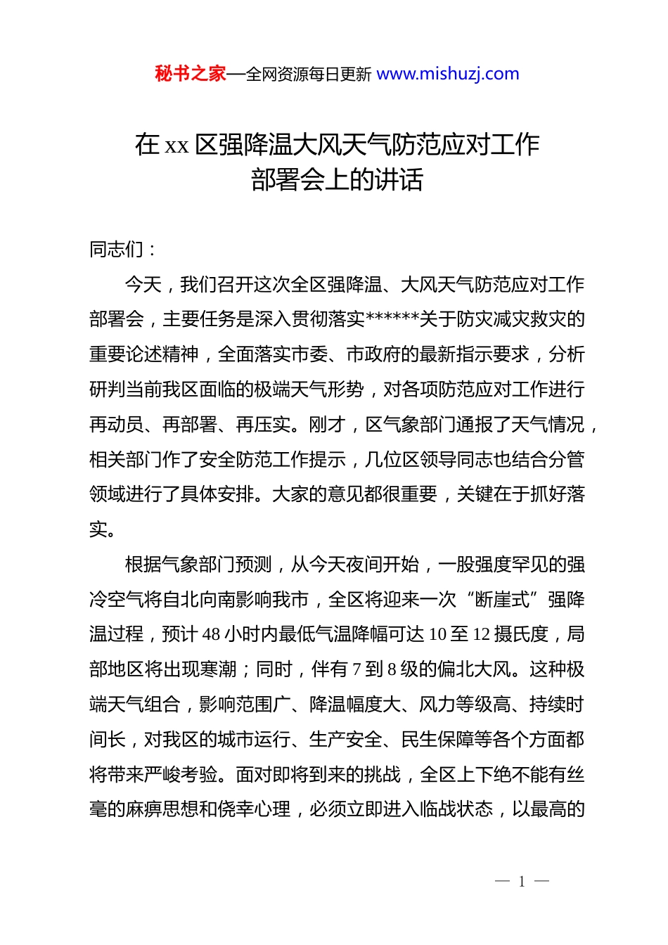 秘书之家—全网资源每日更新 www.mishuzj.com在 xx 区强降温大风天气防范应对工作部署会上的讲话同志们:今天,我们召开这次全区强降温、大风天气防范应对工作部署会,主要任务是深入贯彻落实******关于防灾减灾救灾的重要论述精神,全面落实市委、市政府的最新指示要求,分析研判当前我区面临的极端天气形势,对各项防范应对工作进行再动员、再部署、再压实。刚才,区气象部门通报了天气情况,相关部门作了安全防范工作提示,几位区领导同志也结合分管领域进行了具体安排。大家的意见都很重要,关键在于抓好落实。根据气象部门预测,从今天夜间开始,一股强度罕见的强冷空气将自北向南影响我市,全区将迎来一次“断崖式”强降温过程,预计 48 小时内最低气温降幅可达 10 至 12 摄氏度,局部地区将出现寒潮;同时,伴有 7 到 8 级的偏北大风。这种极端天气组合,影响范围广、降温幅度大、风力等级高、持续时间长,对我区的城市运行、生产安全、民生保障等各个方面都将带来严峻考验。面对即将到来的挑战,全区上下绝不能有丝毫的麻痹思想和侥幸心理,必须立即进入临战状态,以最高的— 1 —标准、最严的要求、最实的举措,全力以赴打好这场防范应对硬仗。下面,我再强调四点意见。一、提高政治站位,深化思想认识,坚决扛起保障人民生命财产安全的重大责任防灾减灾救灾工作,事关人民生命财产安全,事关社会大局稳定。******多次强调,要坚持人民至上、生命至上,牢固树立和认真贯彻安全发展理念。这次强降温、大风天气,是对我区干部队伍执行力、应急处置能力和城市综合治理水平的一次集中检验。全区各级*组织和广大*员干部要从讲政治、顾大局的高度,深刻认识做好此次防范应对工作的极端重要性和现实紧迫性。首先,这既是一项刻不容缓的民生工程,更是一项必须完成的政治任务。群众的安危冷暖,始终是*委政府最大的牵挂。确保每一位市民都能安全、温暖地度过这次极端天气,是我们义不容辞的责任。要把防范应对工作作为当前压倒一切的头等大事来抓,把“人民至上、生命至上”的理念真正落实到每一个环节、每一个岗位、每一个行动中,用我们的“辛苦指数”换取群众的“安全指数”和“幸福指数”。其次,必须清醒认识当前我区安全防范的复杂形势。随着城市化进程的加快,我区高层建筑、在建工地、户外广告牌等— 2 —秘书之家—全网资源每日更新 www.mishuzj.com日益增多,人口密度持续加大,城市运行系统日趋复杂,抵御自然灾害的脆弱性也在某些方面相应增加。同时,一些老旧小区基础设施老化,部分群众防灾避险意识不强,这些都构成了我们工作中的风险点和薄弱点。必须坚持底线思维,增强忧患意识,把问题想得更深入一些,把风险估计得更充分一些,把措施准备得更周全一些,做到未雨绸缪、有备无患。最后,要将此次应对工作作为锤炼干部作风、提升治理效能的实战场。灾害面前,最能考验一个地区的组织动员能力,最能检验一名干部的责任与担当。各单位“一把手”要亲自挂帅、靠前指挥,领导干部要深入一线、现场督导,切实将压力传导到位、责任落实到位。要通过这次实战,进一步完善我区的应急管理体系,提升基层社会治理能力,真正做到守土有责、守土负责、守土尽责。二、聚焦重点领域,实施精准施策,全面筑牢城市安全运行的坚固防线防范工作必须突出重点,抓住关键。要坚决做到以防为主、防治结合,针对此次强降温、大风天气的特点,对重点区域、关键环节和薄弱部位进行全方位、无死角的风险排查和隐患整治,确保绝对安全。第一,要全面加强对重点设施和区域的安全监管。住建、— 3 —城管、应急等部门要立即组织力量,对全区所有在建工地开展专项巡查,重点检查塔吊、脚手架、施工围挡、临时工棚等设施的加固情况,该停工的必须坚决停工,并妥善安置好施工人员。要对高层建筑的玻璃幕墙、外墙附着物、空调外机以及各类广告牌、指示牌、灯箱等进行拉网式排查,对存在松动、脱落风险的,要立即设置警戒区域,并迅速组织加固或拆除。各街道和社区要对辖区内的老旧小区、危旧房屋进行再排查,特别关注屋顶瓦片、阳台悬挂物等,及时消除高空坠物隐患。交通运输部...