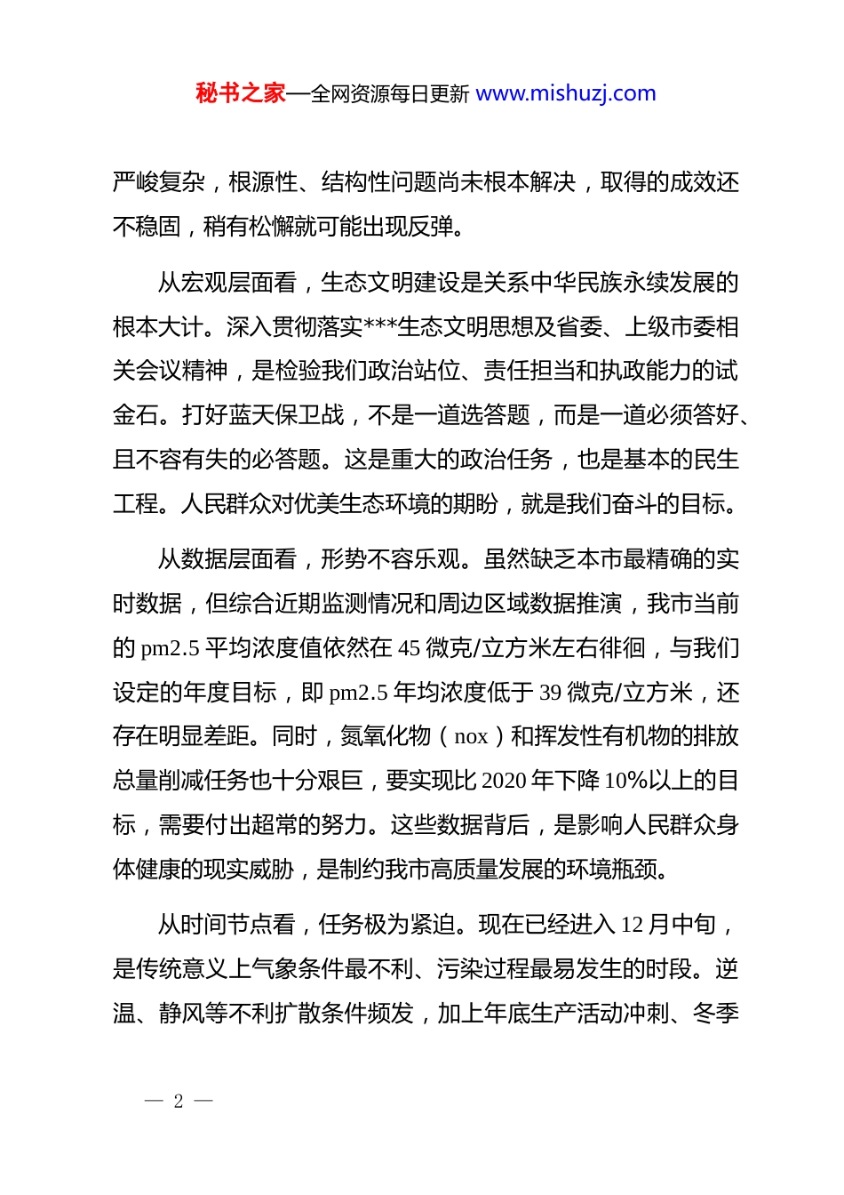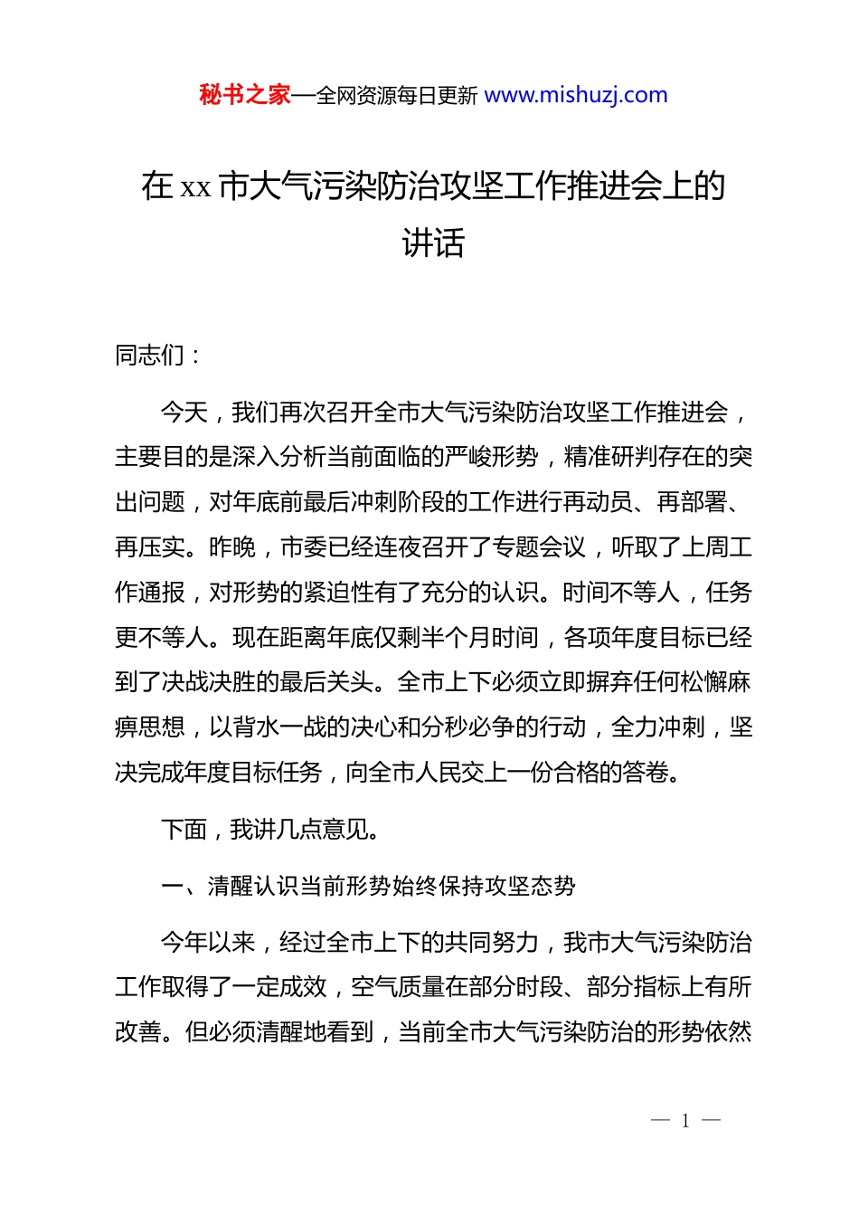 秘书之家—全网资源每日更新 www.mishuzj.com在 xx 市大气污染防治攻坚工作推进会上的讲话同志们:今天,我们再次召开全市大气污染防治攻坚工作推进会,主要目的是深入分析当前面临的严峻形势,精准研判存在的突出问题,对年底前最后冲刺阶段的工作进行再动员、再部署、再压实。昨晚,市委已经连夜召开了专题会议,听取了上周工作通报,对形势的紧迫性有了充分的认识。时间不等人,任务更不等人。现在距离年底仅剩半个月时间,各项年度目标已经到了决战决胜的最后关头。全市上下必须立即摒弃任何松懈麻痹思想,以背水一战的决心和分秒必争的行动,全力冲刺,坚决完成年度目标任务,向全市人民交上一份合格的答卷。下面,我讲几点意见。一、清醒认识当前形势始终保持攻坚态势今年以来,经过全市上下的共同努力,我市大气污染防治工作取得了一定成效,空气质量在部分时段、部分指标上有所改善。但必须清醒地看到,当前全市大气污染防治的形势依然— 1 —秘书之家—全网资源每日更新 www.mishuzj.com严峻复杂,根源性、结构性问题尚未根本解决,取得的成效还不稳固,稍有松懈就可能出现反弹。从宏观层面看,生态文明建设是关系中华民族永续发展的根本大计。深入贯彻落实***生态文明思想及省委、上级市委相关会议精神,是检验我们政治站位、责任担当和执政能力的试金石。打好蓝天保卫战,不是一道选答题,而是一道必须答好、且不容有失的必答题。这是重大的政治任务,也是基本的民生工程。人民群众对优美生态环境的期盼,就是我们奋斗的目标。从数据层面看,形势不容乐观。虽然缺乏本市最精确的实时数据,但综合近期监测情况和周边区域数据推演,我市当前的 pm2.5 平均浓度值依然在 45 微克/立方米左右徘徊,与我们设定的年度目标,即 pm2.5 年均浓度低于 39 微克/立方米,还存在明显差距。同时,氮氧化物(nox)和挥发性有机物的排放总量削减任务也十分艰巨,要实现比 2020 年下降 10%以上的目标,需要付出超常的努力。这些数据背后,是影响人民群众身体健康的现实威胁,是制约我市高质量发展的环境瓶颈。从时间节点看,任务极为紧迫。现在已经进入 12 月中旬,是传统意义上气象条件最不利、污染过程最易发生的时段。逆温、静风等不利扩散条件频发,加上年底生产活动冲刺、冬季— 2 —秘书之家—全网资源每日更新 www.mishuzj.com取暖需求增加等因素叠加,污染物极易累积,污染峰值浓度随时可能被推高。可以说,我们是在逆风爬坡,每争取一个优良天,每降低一个微克的浓度,都需要比以往付出加倍的努力。剩下的十几天时间,是决定全年成败的“窗口期”,更是考验干部作风的“攻坚期”。因此,全市各级各部门必须立刻紧张起来、行动起来,把思想和行动统一到市委市政府的决策部署上来,切实增强责任感、使命感和紧迫感。要坚定信心、迎难而上,坚决克服“看天吃饭”的消极思想、“尽力而为”的应付心态和“屡战屡败”的畏难情绪,以壮士断腕的勇气和一抓到底的韧劲,把各项工作抓得更紧、更实、更细。二、深化六源协同治理实现污染精准削减打赢大气污染防治攻坚战,关键在于精准施策、科学治理。必须坚持问题导向,紧盯污染源头,严格落实“早、快、实、精、狠、准”的六字要求,持续深化“六源”治理。这里的“六源”,指的是工业源、扬尘源、移动源、生活源、农业源及其他面源。要对这六类污染源进行全方位、全链条、全时段的系统管控,实现源头削减、过程控制与末端治理的有机统一。— 3 —秘书之家—全网资源每日更新 www.mishuzj.com第一,严控工业源头,推动产业绿色转型。工业污染源是大气污染治理的重中之重。必须督促企业不折不扣地落实主体责任和各项减排政策。一方面,要强化对钢铁、水泥、化工、玻璃等重点排污企业的监管,确保其污染防治设施稳定运行,污染物达标排放。要利用在线监测、分表计电等科技手段,实现 24 小时不间断监控,杜绝偷排漏排、超标排放等违法行为。另一方面,要大力推进产业结构和能源结构调整。要下决心淘汰一批高污染、高耗能的落后产能,为优质、绿色、高效的新兴产业腾出发展空间。要积极推广清洁能源,提高天然气和...