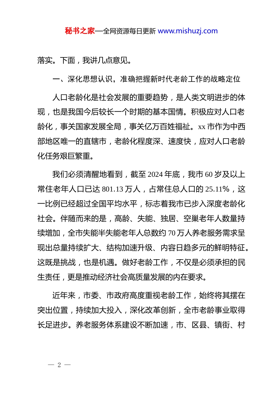 秘书之家—全网资源每日更新 www.mishuzj.com在 xx 市老龄委全体会议暨全市深化养老服务改革发展工作会议上的讲话同志们:今天,我们召开 xx 市老龄委全体会议暨全市深化养老服务改革发展工作会议,主要任务是深入贯彻落实*中央、国务院关于积极应对人口老龄化的决策部署,总结近年来我市老龄及养老服务工作,分析当前面临的新形势新挑战,安排部署下一阶段的重点任务。这次会议既是一次回顾总结会,更是一次改革动员会,对于推动我市老龄事业和产业高质量发展具有十分重要的意义。刚才,xx 同志通报了全市老龄及养老工作情况,xx 区、xx区、xx 区以及市发展改革委、市卫生健康委、市住房城乡建委等单位作了很好的交流发言,分享了经验,提出了思路,听了很受启发。会议还书面审议了《xx 市关于进一步支持老年人社会参与推动实现老有所為若干措施》等四份重要文件。这些文件凝聚了各方智慧,是指导未来一个时期我市老龄工作的纲领性文件,各区县、各部门要认真学习领会,结合实际抓好贯彻— 1 —秘书之家—全网资源每日更新 www.mishuzj.com落实。下面,我讲几点意见。一、深化思想认识,准确把握新时代老龄工作的战略定位人口老龄化是社会发展的重要趋势,是人类文明进步的体现,也是我国今后较长一个时期的基本国情。积极应对人口老龄化,事关国家发展全局,事关亿万百姓福祉。xx 市作为中西部地区唯一的直辖市,老龄化程度深、速度快,应对人口老龄化任务艰巨繁重。我们必须清醒地看到,截至 2024 年底,我市 60 岁及以上常住老年人口已达 801.13 万人,占常住总人口的 25.11%,这一比例已经超过全国平均水平,标志着我市已步入深度老龄化社会。伴随而来的是,高龄、失能、独居、空巢老年人数量持续增加,全市失能半失能老年人总数约 70 万人养老服务需求呈现出总量持续扩大、结构加速升级、内容日趋多元的鲜明特征。这既是挑战,也是机遇。做好老龄工作,不仅是必须承担的民生责任,更是推动经济社会高质量发展的内在要求。近年来,市委、市政府高度重视老龄工作,始终将其摆在突出位置,持续加大投入,深化改革创新,全市老龄事业取得长足进步。养老服务体系建设不断加速,市、区县、镇街、村— 2 —秘书之家—全网资源每日更新 www.mishuzj.com(社区)四级养老服务网络初步形成,养老机构床位总数突破23.7 万张护理型床位占比提升至 67.4%朝着到 2025 年全市养老服务床位达到 25 万张的目标稳步迈进。老年健康服务能力持续增强,医养结合机构达到 176 家,床位总数超过 5.1 万张。老年人社会保障体系更加健全,老年人社会参与渠道不断拓宽。这些成绩的取得,为我们应对人口老龄化挑战奠定了坚实基础。在肯定成绩的同时,我们更要正视工作中存在的短板和不足。比如,养老服务供给与老年人日益增长的多元化、个性化需求之间仍有差距;城乡、区域养老服务发展不平衡问题依然突出,农村养老服务短板尤为明显;银发经济规模不大、结构不优,高质量的产品和服务供给不足;养老服务人才队伍建设亟待加强;全社会积极应对人口老龄化的思想共识和行动合力仍需进一步凝聚。面对这些问题,回避没有出路,懈怠等于落后。全市上下必须把思想和行动统一到中央决策部署和市委工作要求上来,强化使命感和紧迫感,以更大的决心、更实的举措,奋力开创我市老龄工作新局面。二、聚焦体系建设,推动养老服务供给侧结构性改革构建和完善养老服务体系,是积极应对人口老龄化的核心任务。必须堅持问题导向和需求导向,深化供给侧结构性改革,— 3 —秘书之家—全网资源每日更新 www.mishuzj.com推动养老服务从“有没有”向“好不好”转变,不断提升服务效能和质量。第一,要着力构建凝聚力的四级服务网络。养老服务体系的根基在基层,枢纽在网络。要按照“市级统筹指导、区县枢纽支撑、街镇区域辐射、村社一线”的思路,织密织牢全市养老服务网络。市级层面要强化规划、政策、标准和平台的顶层设计。区县级要建强具有综合功能的养老服务中心,发挥其对辖区养老资源的统筹调度、指导培训和应急支援作用。镇街层面要优化布局养老服务中心,将其打造为区域性“...
