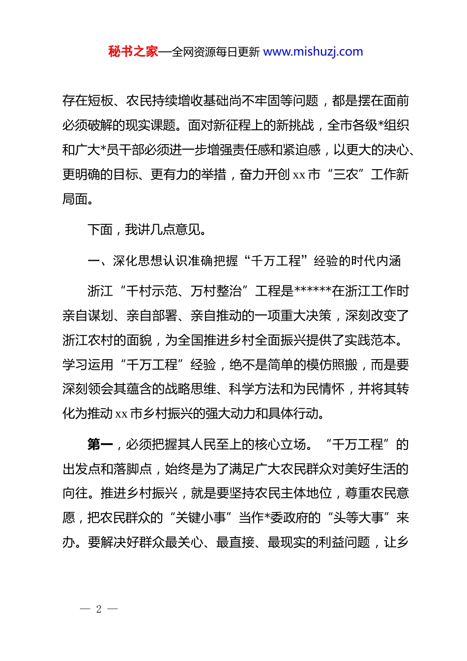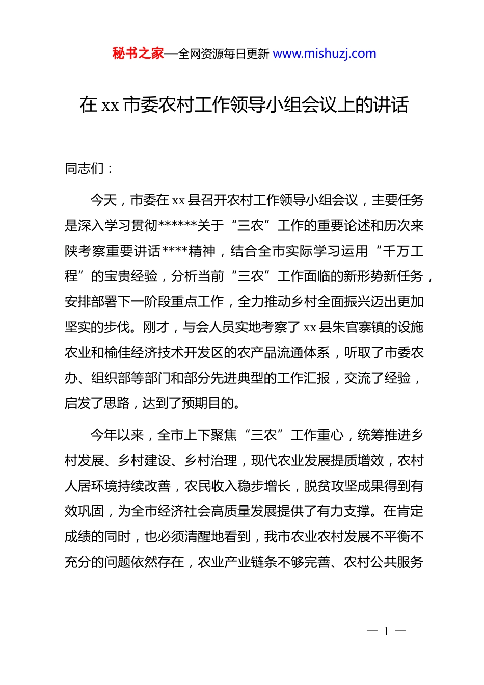秘书之家—全网资源每日更新 www.mishuzj.com在 xx 市委农村工作领导小组会议上的讲话同志们:今天,市委在 xx 县召开农村工作领导小组会议,主要任务是深入学习贯彻******关于“三农”工作的重要论述和历次来陕考察重要讲话****精神,结合全市实际学习运用“千万工程”的宝贵经验,分析当前“三农”工作面临的新形势新任务,安排部署下一阶段重点工作,全力推动乡村全面振兴迈出更加坚实的步伐。刚才,与会人员实地考察了 xx 县朱官寨镇的设施农业和榆佳经济技术开发区的农产品流通体系,听取了市委农办、组织部等部门和部分先进典型的工作汇报,交流了经验,启发了思路,达到了预期目的。今年以来,全市上下聚焦“三农”工作重心,统筹推进乡村发展、乡村建设、乡村治理,现代农业发展提质增效,农村人居环境持续改善,农民收入稳步增长,脱贫攻坚成果得到有效巩固,为全市经济社会高质量发展提供了有力支撑。在肯定成绩的同时,也必须清醒地看到,我市农业农村发展不平衡不充分的问题依然存在,农业产业链条不够完善、农村公共服务— 1 —秘书之家—全网资源每日更新 www.mishuzj.com存在短板、农民持续增收基础尚不牢固等问题,都是摆在面前必须破解的现实课题。面对新征程上的新挑战,全市各级*组织和广大*员干部必须进一步增强责任感和紧迫感,以更大的决心、更明确的目标、更有力的举措,奋力开创 xx 市“三农”工作新局面。下面,我讲几点意见。一、深化思想认识准确把握“千万工程”经验的时代内涵浙江“千村示范、万村整治”工程是******在浙江工作时亲自谋划、亲自部署、亲自推动的一项重大决策,深刻改变了浙江农村的面貌,为全国推进乡村全面振兴提供了实践范本。学习运用“千万工程”经验,绝不是简单的模仿照搬,而是要深刻领会其蕴含的战略思维、科学方法和为民情怀,并将其转化为推动 xx 市乡村振兴的强大动力和具体行动。第一,必须把握其人民至上的核心立场。“千万工程”的出发点和落脚点,始终是为了满足广大农民群众对美好生活的向往。推进乡村振兴,就是要坚持农民主体地位,尊重农民意愿,把农民群众的“关键小事”当作*委政府的“头等大事”来办。要解决好群众最关心、最直接、最现实的利益问题,让乡— 2 —秘书之家—全网资源每日更新 www.mishuzj.com村振兴的成果惠及每一位农民,不断提升农民群众的获得感、幸福感、安全感。第二,必须把握其系统谋划的科学方法。“千万工程”不是孤立的“盆景”,而是统筹城乡发展的一盘大棋。它强调整体规划、系统推进,从整治农村人居环境入手,延伸到乡村产业发展、乡风文明建设、乡村治理等方方面面。我市在推进乡村振兴工作中,必须强化系统观念,做好顶层设计。要将产业发展、人才培育、文化建设、生态保护和组织建设统筹起来,一体规划、一体部署、一体推进,形成全面振兴的强大合力。根据全市的规划,到 2027 年,要建成 200 个左右的市级“千万工程”重点村,并力争其中大部分获得省级示范村认定。截至2025 年底,全市已分级分类打造了超过 100 个省市两级“千万工程”示范村,这正是系统推进的初步成果,后续工作必须在此基础上持续深化。第三,必须把握其久久为功的战略定力。“千万工程”历经二十余年,一张蓝图绘到底,一任接着一任干,彰显了强大的战略定力和历史耐心。乡村振兴是一项长期而艰巨的历史任务,不可能一蹴而就。要杜绝急功近利的短视行为和华而不实的“形象工程”。必须树立正确的政绩观,保持历史耐心,发— 3 —秘书之家—全网资源每日更新 www.mishuzj.com扬“钉钉子”精神,稳扎稳打、步步为营。对于看准了的事情、定下来的规划,就要坚定不移地抓下去,确保各项工作部署都能落地生根、开花结果。二、聚焦关键领域夯实乡村全面振兴的坚实根基学习运用“千万工程”经验,关键在于行动,在于结合 xx实际解决突出问题。当前和今后一个时期,全市的“三农”工作要紧紧围绕产业兴旺、农民增收和民生改善这三个核心,精准发力,务求实效。第一,聚力产业兴旺,构筑现代特色农业产业链条。产业是乡村振兴的基石。没有产业的支撑,乡村振兴就成了无源之水、无本...