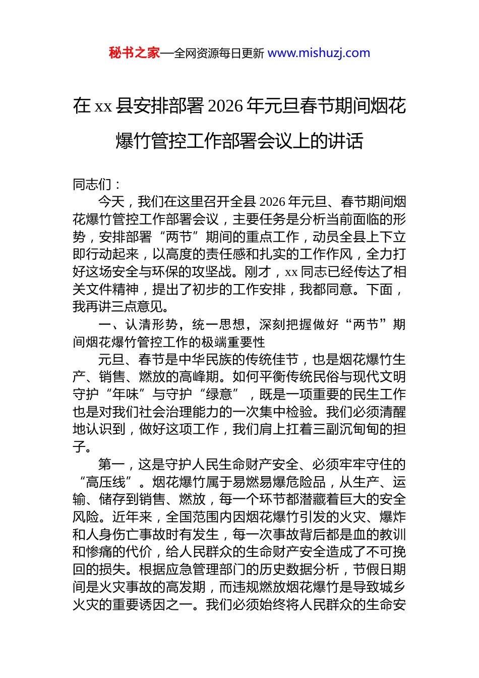 秘书之家—全网资源每日更新 www.mishuzj.com在 xx 县安排部署 2026 年元旦春节期间烟花爆竹管控工作部署会议上的讲话同志们:今天,我们在这里召开全县 2026 年元旦、春节期间烟花爆竹管控工作部署会议,主要任务是分析当前面临的形势,安排部署“两节”期间的重点工作,动员全县上下立即行动起来,以高度的责任感和扎实的工作作风,全力打好这场安全与环保的攻坚战。刚才,xx 同志已经传达了相关文件精神,提出了初步的工作安排,我都同意。下面,我再讲三点意见。一、认清形势,统一思想,深刻把握做好“两节”期间烟花爆竹管控工作的极端重要性元旦、春节是中华民族的传统佳节,也是烟花爆竹生产、销售、燃放的高峰期。如何平衡传统民俗与现代文明守护“年味”与守护“绿意”,既是一项重要的民生工作也是对我们社会治理能力的一次集中检验。我们必须清醒地认识到,做好这项工作,我们肩上扛着三副沉甸甸的担子。第一,这是守护人民生命财产安全、必须牢牢守住的“高压线”。烟花爆竹属于易燃易爆危险品,从生产、运输、储存到销售、燃放,每一个环节都潜藏着巨大的安全风险。近年来,全国范围内因烟花爆竹引发的火灾、爆炸和人身伤亡事故时有发生,每一次事故背后都是血的教训和惨痛的代价,给人民群众的生命财产安全造成了不可挽回的损失。根据应急管理部门的历史数据分析,节假日期间是火灾事故的高发期,而违规燃放烟花爆竹是导致城乡火灾的重要诱因之一。我们必须始终将人民群众的生命安秘书之家—全网资源每日更新 www.mishuzj.com全放在第一位,决不能有丝毫麻痹和侥幸心理。我们的目标是明确的,就是要坚决杜绝因燃放、生产、储存烟花爆竹引发的重特大火灾和人员伤亡事故,并将一般性火情和伤害事件的发生率降至历史最低水平。第二,这是打赢蓝天保卫战、必须坚决完成的“硬任务”。燃放烟花爆竹会急剧产生大量的二氧化硫、二氧化氮和 pm2.5、pm10 等颗粒物,对空气质量造成严重污染。根据生态环境部门往年的监测数据显示,在除夕、正月初一等集中燃放时段,我县城区的 pm2.5 小时浓度曾出现过超过 500 微克/立方米甚至更高的“爆表”情况,是平日的数十倍之多,严重影响空气质量和群众身体健康。xx 县的生态环境是我们最宝贵的财富,近年来,我们下大力气治理污染,空气质量持续改善,成果来之不易。我们绝不能因为节庆期间的短暂“烟火气”,而让长期的环保努力付诸东流。因此,我们必须设定严格的环保目标:在“两节”重点管控时段,特别是除夕夜间至初一上午,力争将县城建成区及周边重点区域的 pm2.5 小时平均浓度控制在 150 微克/立方米以下,杜绝出现长时间、大范围的重度及以上污染天气。第三,这是回应群众多元诉求、必须妥善解答的“新考卷”。随着社会的发展,群众的观念也在发生变化。一部分群众希望延续传统,通过燃放烟花爆竹增添节日气氛;而另一部分群众则对由此带来的环境污染、噪音扰民和安全隐患感到担忧和反感。同时,我们也必须看到,国家层面的《烟花爆竹安全管理条例》赋予了地方政府根据实际情况划定禁放、限放区域的权力。因此,我们的管控工作不能搞“一刀切”,更不能当“甩手掌柜”。既要依法依规,严格执法,又要充分考虑民俗传统和群众情感,体现人文关怀。要通过科学划定区域、精细化管理和人性化引导,在法律、安全、环保与民俗之间找到最佳平衡点,探索出一条既能守护蓝天白云、又能留住传统“年味”的 xx秘书之家—全网资源每日更新 www.mishuzj.com县特色治理路径,实现安全、环保与民俗的和谐共赢。二、明确目标,聚焦重点,以“四个到位”为抓手精准施策做好“两节”期间的烟花爆竹管控工作,任务艰巨,责任重大。全县各级各部门必须立即行动起来,紧紧围绕县委、县政府的统一部署,聚焦“宣传引导、源头治理、执法管控、协同联动”这四个关键环节,做到精准发力、靶向施策,确保各项工作落到实处、取得实效。(一)宣传引导必须精准到位,营造“全民参与”的浓厚氛围。管控工作要取得成功,群众的理解和支持是基础。必须迅速构建起一个全方位、多层次、立体化的宣传网络把政策讲清、把危害讲透、把新风讲明...