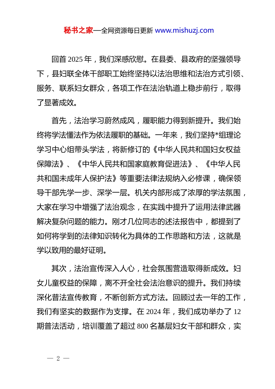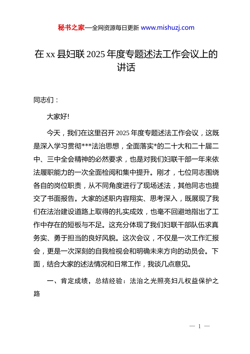 秘书之家—全网资源每日更新 www.mishuzj.com在 xx 县妇联 2025 年度专题述法工作会议上的讲话同志们:大家好!今天,我们在这里召开 2025 年度专题述法工作会议,这既是深入学习贯彻***法治思想,全面落实*的二十大和二十届二中、三中全会精神的必然要求,也是对我们妇联干部一年来依法履职能力的一次全面检阅和集中提升。刚才,七位同志围绕各自的岗位职责,从不同角度进行了现场述法,其他同志也提交了书面报告。大家的述职内容翔实、思考深入,既展现了我们在法治建设道路上取得的扎实成效,也毫不回避地指出了工作中存在的短板与不足。这充分体现了我们妇联干部队伍求真务实、勇于担当的良好风貌。这次会议,不仅是一次工作汇报会,更是一次深刻的自我检视会和明确未来方向的动员会。下面,结合大家的述法情况和日常工作,我谈几点意见。一、肯定成绩,总结经验:法治之光照亮妇儿权益保护之路— 1 —秘书之家—全网资源每日更新 www.mishuzj.com回首 2025 年,我们深感欣慰。在县委、县政府的坚强领导下,县妇联全体干部职工始终坚持以法治思维和法治方式引领、服务、联系妇女群众,各项工作在法治轨道上稳步前行,取得了显著成效。首先,法治学习蔚然成风,履职能力得到新提升。我们始终将学法懂法作为依法履职的基础。一年来,我们坚持*组理论学习中心组带头学法,将新修订的《中华人民共和国妇女权益保障法》、《中华人民共和国家庭教育促进法》、《中华人民共和国未成年人保护法》等重要法律法规纳入必修课,确保领导干部先学一步、深学一层。机关内部形成了浓厚的学法氛围,大家在学习中增强了法治观念,在实践中提升了运用法律武器解决复杂问题的能力。刚才几位同志的述法报告中,都提到了如何将学到的法律知识转化为具体的工作思路和方法,这就是学以致用的最好证明。其次,法治宣传深入人心,社会氛围营造取得新成效。妇女儿童权益的保障,离不开全社会法治意识的提升。我们持续深化普法宣传教育,不断创新方式方法。回顾过去一年的工作,我们有坚实的数据作为支撑。在 2024 年,我们成功举办了 12期普法活动,培训覆盖了超过 800 名基层妇女干部和群众,实— 2 —秘书之家—全网资源每日更新 www.mishuzj.com现了乡镇的全覆盖。在此基础上,2025 年我们进一步加大了力度,全年组织开展“xx 普法乡村行”等各类主题法治宣传活动超过 20 场,线上线下覆盖群众近万人次。我们不再满足于简单的发放宣传单,而是通过情景剧、以案释法、线上直播等群众喜闻乐见的形式,把“法言法语”转化为“家常话”,让法律知识真正走进妇女群众的心里。特别是我们联合县民政局、团县委等部门开展的“润心伴成长同心护未来”政策集中宣传活动,将未成年人保护的相关法律送到了最需要的家庭和孩子身边。再者,依法维权精准有力,服务大局彰显新作为。维护妇女儿童合法权益是妇联组织的天职。我们坚持用法治力量为妇女儿童排忧解难。我们与县法律援助中心联合成立的“xx 维权志愿服务队”,已经成为我县妇女维权工作的一张亮丽名片。这支由专业律师和基层法律服务工作者组成的队伍,通过“群众点单、妇联派单、志愿者接单、群众评单”的高效机制,为弱势妇女儿童提供了及时、专业的法律援助,仅去年一年就成功办理了 125 件援助案件,提供了超过 400 人次的法律咨询。今年,我们继续深化这一模式,处理的婚姻家庭纠纷调解成功率稳步提升,信访案件化解率达到 95%以上,切实让受困妇女— 3 —秘书之家—全网资源每日更新 www.mishuzj.com感受到了“娘家人”的温暖和法治的公正。最后,部门协作联动紧密,维权合力构筑新格局。我们深刻认识到,妇女儿童权益保障是一项系统工程,单靠妇联一家之力远远不够。为此,我们积极发挥“联”字优势,主动加强与公、检、法、司、民政、教育等部门的协作。我们与县检察院共同探索建立了维护妇女儿童权益的新举措,严厉打击侵害妇女儿童权益的犯罪行为;与县民政局联合举办“xx 护航”新婚夫妇婚姻辅导活动,从源头上预防和减少家庭矛盾;我们还在积极推动与法院、公安等部门建立更完善的反家暴联动机制,探索设立反...