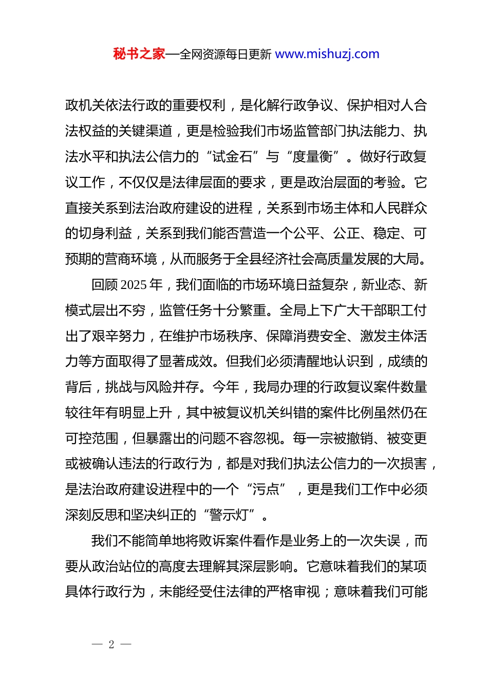 秘书之家—全网资源每日更新 www.mishuzj.com在 xx 县市场监督管理局 2025 年度行政复议案件复盘剖析暨整改推进会上的讲话同志们:大家下午好。今天,我们在这里召开 2025 年度行政复议案件复盘剖析暨整改推进会,这既是一次业务研讨会,也是一次问题剖析会,更是一次思想动员和工作部署会。会议的主题非常明确,就是聚焦过去一年我们在行政复议工作中暴露出的短板与不足,通过“一案一剖析、逐案找症结”的方式,进行一次全面、深刻、彻底的复盘,以刮骨疗毒的勇气直面问题,以精准务实的举措推动整改,从而全面提升我局依法行政的能力和水平。刚才,几个承办科室的负责同志对相关案件进行了详细的汇报和剖析,与会的同志们也进行了热烈的讨论,提出了很多有价值的意见和建议。大家准备充分、态度诚恳、剖析深刻,达到了预期效果,我完全赞同。下面,结合大家的发言和我的思考,我讲四点意见。一、提高站位,深刻认识行政复议工作的极端重要性,以“赶考”心态审视执法办案成效行政复议是宪法和法律赋予公民、法人或其他组织监督行— 1 —秘书之家—全网资源每日更新 www.mishuzj.com政机关依法行政的重要权利,是化解行政争议、保护相对人合法权益的关键渠道,更是检验我们市场监管部门执法能力、执法水平和执法公信力的“试金石”与“度量衡”。做好行政复议工作,不仅仅是法律层面的要求,更是政治层面的考验。它直接关系到法治政府建设的进程,关系到市场主体和人民群众的切身利益,关系到我们能否营造一个公平、公正、稳定、可预期的营商环境,从而服务于全县经济社会高质量发展的大局。回顾 2025 年,我们面临的市场环境日益复杂,新业态、新模式层出不穷,监管任务十分繁重。全局上下广大干部职工付出了艰辛努力,在维护市场秩序、保障消费安全、激发主体活力等方面取得了显著成效。但我们必须清醒地认识到,成绩的背后,挑战与风险并存。今年,我局办理的行政复议案件数量较往年有明显上升,其中被复议机关纠错的案件比例虽然仍在可控范围,但暴露出的问题不容忽视。每一宗被撤销、被变更或被确认违法的行政行为,都是对我们执法公信力的一次损害,是法治政府建设进程中的一个“污点”,更是我们工作中必须深刻反思和坚决纠正的“警示灯”。我们不能简单地将败诉案件看作是业务上的一次失误,而要从政治站位的高度去理解其深层影响。它意味着我们的某项具体行政行为,未能经受住法律的严格审视;意味着我们可能— 2 —秘书之家—全网资源每日更新 www.mishuzj.com因为事实认定不清、证据收集不全、程序履行不当或法律适用不准,而使市场主体的合法权益受到了不应有的影响。这种影响,小到挫伤一个企业的经营信心,大到损害政府在人民群众心中的形象。因此,我们必须摒弃“复议是法制机构的事”、“应诉是走过场”等错误观念,牢固树立“有权必有责、用权受监督”的法治理念,将每一次行政复议都看作是一次检验自身执法水平的“大考”,以如履薄冰、如临深渊的审慎态度,对待手中的执法权,确保每一起案件都办成经得起法律、历史和人民检验的“铁案”。二、正视问题,以“解剖麻雀”的精度深挖案件败诉的根源症结刚才的复盘环节,大家谈得很具体、很深入。我们就是要用这种“放大镜”和“显微镜”的精神,不回避、不遮掩,把问题摆在桌面上,把根源挖深挖透。综合来看,当前我局行政执法中存在的短板主要集中在以下三个方面:第一,事实认定与证据固定存在“软肋”。这是我们在复议案件中最常遇到的“硬伤”。有的案件,执法人员主观臆断多,客观证据少,仅凭经验判断就作出结论,导致事实根基不牢。例如,在处理一宗涉及虚假宣传的案件时,执法人员仅凭网页截图作为证据,但对宣传行为的持续时间、影响范围、获— 3 —秘书之家—全网资源每日更新 www.mishuzj.com利情况等关键事实缺乏深入调查和有效固证,导致在复议审查中,对违法行为的危害后果无法给出充分证明,最终行政处罚的幅度难以获得复议机关的支持。还有的案件,证据链条不完整、不闭合。比如,在查处无证经营案件时,虽然现场查获了经营工具和产品,但缺少能够直接证明经营行为持续性、经...