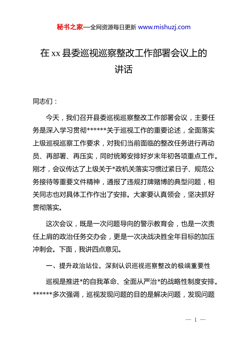 秘书之家—全网资源每日更新 www.mishuzj.com在 xx 县委巡视巡察整改工作部署会议上的讲话同志们:今天,我们召开县委巡视巡察整改工作部署会议,主要任务是深入学习贯彻******关于巡视工作的重要论述,全面落实上级巡视巡察工作要求,对我们当前面临的整改任务进行再动员、再部署、再压实,同时统筹安排好岁末年初各项重点工作。刚才,会议传达了上级关于*政机关落实习惯过紧日子、规范公务接待等重要文件精神,通报了违规打牌赌博的典型问题,相关同志也对具体工作作出了安排。大家要认真领会,坚决抓好贯彻落实。这次会议,既是一次问题导向的警示教育会,也是一次责任上肩的政治任务交办会,更是一次决战决胜全年目标的加压冲刺会。下面,我讲四点意见。一、提升政治站位,深刻认识巡视巡察整改的极端重要性巡视是推进*的自我革命、全面从严治*的战略性制度安排。******多次强调,巡视发现问题的目的是解决问题,发现问题— 1 —秘书之家—全网资源每日更新 www.mishuzj.com不解决,比不巡视的效果还坏。我们必须从政治和全局的高度,深刻认识抓好巡视巡察整改工作的极端重要性和现实紧迫性。第一,抓好整改是践行“两个维护”的试金石。巡视巡察本质上是政治监督,是对我们贯彻落实*中央决策部署和上级工作要求的“政治体检”。反馈的问题,无论大小,都直接或间接地反映出我们在政治站位、政治意识、政治能力上存在的差距。我们能不能以最坚决的态度、最迅速的行动、最扎实的举措抓好整改,检验的是我们的政治判断力、政治领悟力、政治执行力,体现的是我们对*忠诚与否的政治品格。全县各级*组织和广大*员干部必须清醒认识到,整改不是简单的业务工作,而是严肃的政治任务。对待整改的态度就是对待*的态度,整改成效就是我们的政治答卷。我们必须将整改工作作为一项重大的政治责任扛在肩上,以实际行动诠释对*的绝对忠诚。第二,抓好整改是推动全面从严治*的关键环节。近年来,通过多轮巡察,我县多个单位和部门都进行了整改工作,并取得了一定成效。但我们也要看到,一些问题积弊甚深、屡巡屡犯,一些整改“雨过地皮湿”、浮于表面。例如,有的单位理论学习不深入、学用脱节的问题依然存在;有的领域形式主义、官僚主义禁而未绝,为基层减负成效打了折扣;有的制度执行— 2 —秘书之家—全网资源每日更新 www.mishuzj.com不力,“牛栏关猫”的现象时有发生。这些问题,归根结底是管*治*责任没有压实、严的氛围没有形成。巡视巡察反馈意见,就是一面镜子,照出了我们管*治*的薄弱环节和廉政风险点。我们必须以巡视巡察整改为契机,拿出“向我开刀”的勇气和“刮骨疗毒”的决心,一体推进不敢腐、不能腐、不想腐,把严的主基调长期坚持下去,持续净化和修复政治生态,让全面从严治*在 xx 县落地生根、见到实效。第三,抓好整改是驱动 xx 高质量发展的强大动力。当前,xx 正处在爬坡过坎、转型升级的关键时期。我们既面临着前所未有的发展机遇,也面对着诸多风险挑战。巡视巡察反馈的问题,往往也是制约我们高质量发展的堵点、痛点和难点。比如,营商环境的短板、项目推进的迟滞、民生领域的欠账、干部作风的顽疾,这些问题不解决,高质量发展就是一句空话。我们必须把巡视巡察整改作为推进 xx 高质量发展的有力抓手,通过解决一个问题,带动一个领域的工作提升;通过一个单位的整改,促进整个系统的效能优化。要坚决摒弃“就整改抓整改”的狭隘思想,把整改融入日常工作、融入深化改革、融入全面从严治*、融入班子队伍建设,真正把整改的过程变成破解发展难题、提升治理能力、激发干事创业精气神的过程,以整改的— 3 —秘书之家—全网资源每日更新 www.mishuzj.com实际成效为 xx 高质量发展扫清障碍、注入动能。二、坚持动真碰硬,以钉钉子精神全面彻底完成整改任务抓整改,最忌讳的就是“虚”和“空”。必须拿出实打实的举措,坚持问题导向、效果导向,做到件件有着落、事事有回音。第一,要压实责任、闭环管理。整改责任不落实,一切都无从谈起。各级*组织要坚决扛起主体责任,“一把手”是第一责任人,要亲自部署、亲自过问、亲自协调、亲自督办,不...