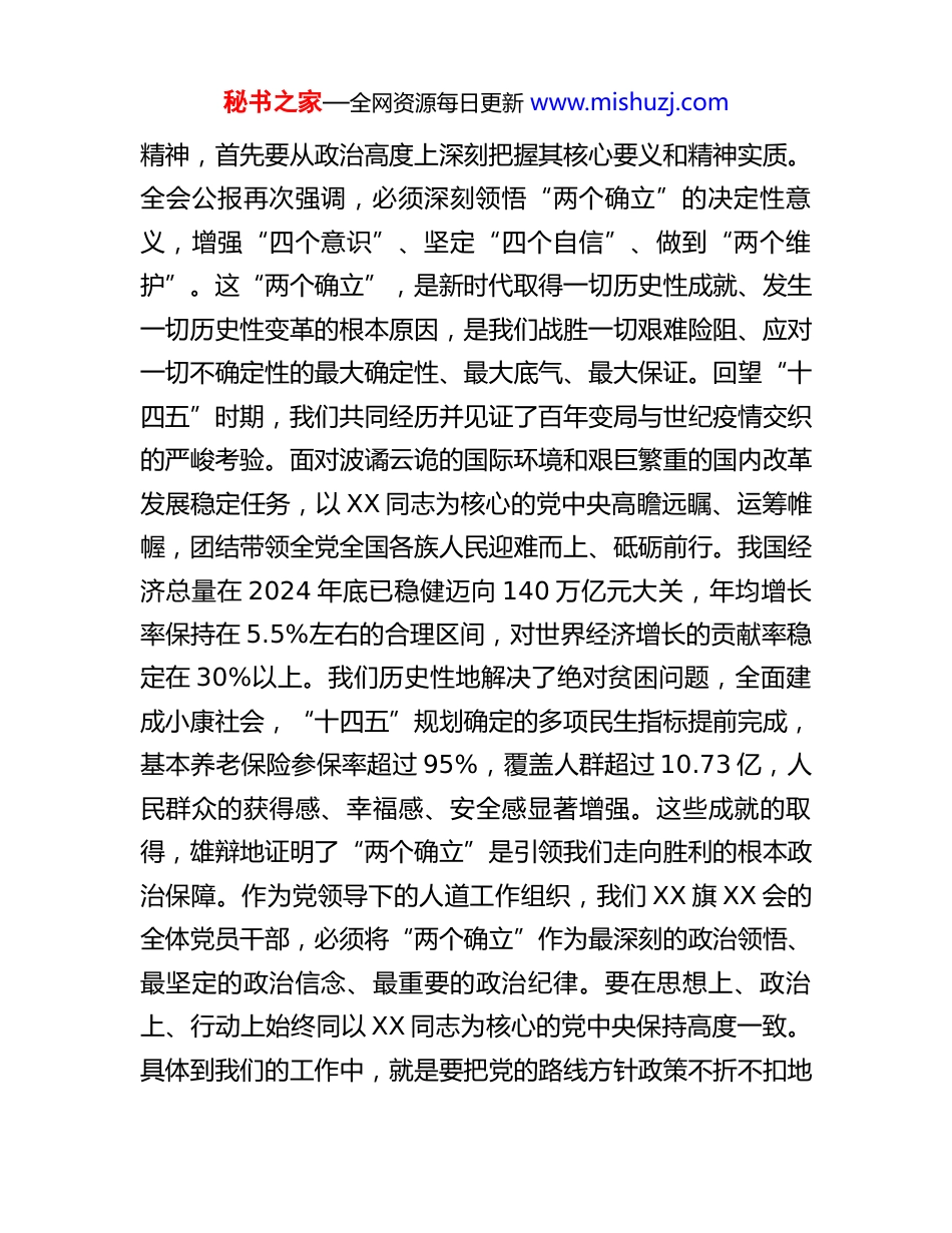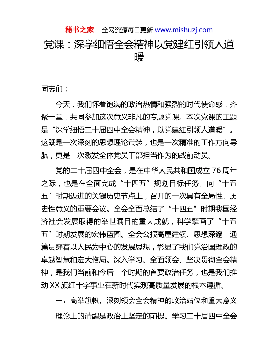 秘书之家—全网资源每日更新 www.mishuzj.com党课:深学细悟全会精神以党建红引领人道暖同志们:今天,我们怀着饱满的政治热情和强烈的时代使命感,齐聚一堂,共同参加这次意义非凡的专题党课。本次党课的主题是“深学细悟二十届四中全会精神,以党建红引领人道暖”。这既是一次深刻的思想理论武装,也是一次精准的工作方向导航,更是一次激发全体党员干部担当作为的战前动员。党的二十届四中全会,是在中华人民共和国成立 76 周年之际,也是在全面完成“十四五”规划目标任务、向“十五五”时期迈进的关键历史节点上,召开的一次具有全局性、历史性意义的重要会议。全会全面总结了“十四五”时期我国经济社会发展取得的举世瞩目的重大成就,科学擘画了“十五五”时期发展的宏伟蓝图。全会公报高屋建瓴、思想深邃,通篇贯穿着以人民为中心的发展思想,彰显了我们党治国理政的卓越智慧和宏大格局。深入学习、全面领会、坚决贯彻全会精神,是我们当前和今后一个时期的首要政治任务,也是我们推动 XX 旗红十字事业在新时代实现高质量发展的根本遵循。一、高举旗帜,深刻领会全会精神的政治站位和重大意义理论上的清醒是政治上坚定的前提。学习二十届四中全会秘书之家—全网资源每日更新 www.mishuzj.com精神,首先要从政治高度上深刻把握其核心要义和精神实质。全会公报再次强调,必须深刻领悟“两个确立”的决定性意义,增强“四个意识”、坚定“四个自信”、做到“两个维护”。这“两个确立”,是新时代取得一切历史性成就、发生一切历史性变革的根本原因,是我们战胜一切艰难险阻、应对一切不确定性的最大确定性、最大底气、最大保证。回望“十四五”时期,我们共同经历并见证了百年变局与世纪疫情交织的严峻考验。面对波谲云诡的国际环境和艰巨繁重的国内改革发展稳定任务,以 XX 同志为核心的党中央高瞻远瞩、运筹帷幄,团结带领全党全国各族人民迎难而上、砥砺前行。我国经济总量在 2024 年底已稳健迈向 140 万亿元大关,年均增长率保持在 5.5%左右的合理区间,对世界经济增长的贡献率稳定在 30%以上。我们历史性地解决了绝对贫困问题,全面建成小康社会,“十四五”规划确定的多项民生指标提前完成,基本养老保险参保率超过 95%,覆盖人群超过 10.73 亿,人民群众的获得感、幸福感、安全感显著增强。这些成就的取得,雄辩地证明了“两个确立”是引领我们走向胜利的根本政治保障。作为党领导下的人道工作组织,我们 XX 旗 XX 会的全体党员干部,必须将“两个确立”作为最深刻的政治领悟、最坚定的政治信念、最重要的政治纪律。要在思想上、政治上、行动上始终同以 XX 同志为核心的党中央保持高度一致。具体到我们的工作中,就是要把党的路线方针政策不折不扣地秘书之家—全网资源每日更新 www.mishuzj.com贯彻到应急救援、人道救助、应急救护、无偿献血、造血干细胞捐献、人体器官捐献等“三救三献”的每一个环节。我们的每一次救援行动,每一次救护培训,每一次爱心捐献的组织,都不仅仅是业务工作的开展,更是对“两个确立”决定性意义的生动践行,是对“两个维护”政治忠诚的直接检验。我们必须清醒地认识到,红十字事业的“红”,首先是党旗的颜色,是马克思主义的底色。只有坚持党的全面领导,我们的人道事业才能始终沿着正确的方向前进,才能拥有最坚强的后盾和最磅礴的力量。二、胸怀大局,准确把握全会精神与红十字事业的契合点二十届四中全会精神内容博大精深,为我们描绘了国家未来五年乃至更长时期的发展蓝图。作为基层红十字组织,我们必须找准自身定位,将全会提出的战略部署与我们的核心职能紧密结合,在服务国家大局中展现新担当、实现新作为。(一)深刻领会“坚持人民至上”的根本立场,筑牢人道服务的价值基石。全会公报将“坚持人民至上”作为“十五五”时期经济社会发展必须遵循的首要原则,强调要“以满足人民日益增长的美好生活需要为根本目的”。这与红十字运动“保护人的生命和健康,维护人的尊严”的根本宗旨高度一致,一脉相承。人民性,是党的事业的根本属性,也是红十字事业的本质特征。我们 XX 旗地处边境,地域辽阔,...