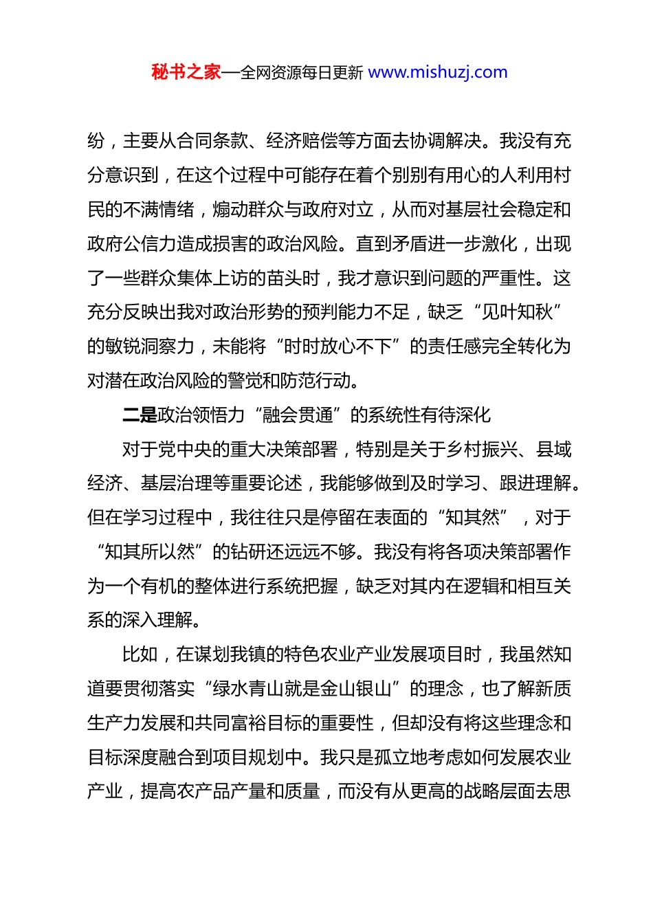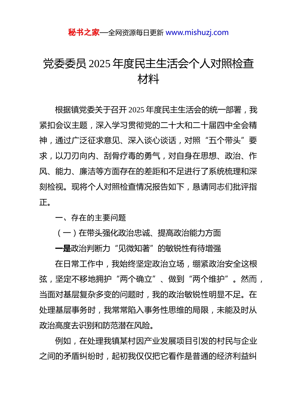 秘书之家—全网资源每日更新 www.mishuzj.com党委委员 2025 年度民主生活会个人对照检查材料 根据镇党委关于召开 2025 年度民主生活会的统一部署,我紧扣会议主题,深入学习贯彻党的二十大和二十届四中全会精神,通过广泛征求意见、深入谈心谈话,对照“五个带头”要求,以刀刃向内、刮骨疗毒的勇气,对自身在思想、政治、作风、能力、廉洁等方面存在的差距和不足进行了系统梳理和深刻检视。现将个人对照检查情况报告如下,恳请同志们批评指正。一、存在的主要问题(一)在带头强化政治忠诚、提高政治能力方面一是政治判断力“见微知著”的敏锐性有待增强在日常工作中,我始终坚定政治立场,绷紧政治安全这根弦,坚定不移地拥护“两个确立”、做到“两个维护”。然而,当面对基层复杂多变的问题时,我的政治敏锐性明显不足。在处理基层事务时,我常常陷入事务性思维的局限,未能及时从政治高度去识别和防范潜在风险。例如,在处理我镇某村因产业发展项目引发的村民与企业之间的矛盾纠纷时,起初我仅仅把它看作是普通的经济利益纠秘书之家—全网资源每日更新 www.mishuzj.com纷,主要从合同条款、经济赔偿等方面去协调解决。我没有充分意识到,在这个过程中可能存在着个别别有用心的人利用村民的不满情绪,煽动群众与政府对立,从而对基层社会稳定和政府公信力造成损害的政治风险。直到矛盾进一步激化,出现了一些群众集体上访的苗头时,我才意识到问题的严重性。这充分反映出我对政治形势的预判能力不足,缺乏“见叶知秋”的敏锐洞察力,未能将“时时放心不下”的责任感完全转化为对潜在政治风险的警觉和防范行动。二是政治领悟力“融会贯通”的系统性有待深化对于党中央的重大决策部署,特别是关于乡村振兴、县域经济、基层治理等重要论述,我能够做到及时学习、跟进理解。但在学习过程中,我往往只是停留在表面的“知其然”,对于“知其所以然”的钻研还远远不够。我没有将各项决策部署作为一个有机的整体进行系统把握,缺乏对其内在逻辑和相互关系的深入理解。比如,在谋划我镇的特色农业产业发展项目时,我虽然知道要贯彻落实“绿水青山就是金山银山”的理念,也了解新质生产力发展和共同富裕目标的重要性,但却没有将这些理念和目标深度融合到项目规划中。我只是孤立地考虑如何发展农业产业,提高农产品产量和质量,而没有从更高的战略层面去思秘书之家—全网资源每日更新 www.mishuzj.com考如何将生态保护、产业升级、农民增收等多个方面有机结合起来,实现经济、社会和生态效益的最大化。结果导致项目规划缺乏前瞻性和系统性,在实施过程中遇到了诸多困难,综合效益未达预期。这说明我对党的创新理论的整体性、关联性理解还不够透彻,在运用理论指导实践时缺乏深度和广度。三是政治执行力“一抓到底”的实效性有待强化对于上级党委、政府部署的工作任务,我一直能够迅速响应、坚决执行。但在推动政策落地“最后一公里”的过程中,我存在着“重部署、轻落实”的倾向,压力传导存在递减现象。例如,去年我镇启动了覆盖 20 个村的农村基础设施建设提升行动,旨在改善农村的道路、水电、通信等基础设施条件。在行动启动初期,我多次召开动员会议,对工作任务进行了详细的部署,并明确了各部门和各村的职责分工。然而,在后续的工作推进过程中,我对工作进展的跟踪问效不够及时、深入。我只是通过听取汇报、查看资料等方式了解情况,没有真正深入到项目现场进行实地检查和督促。结果导致部分村庄在基础设施建设过程中出现了工程质量不高、进度缓慢等问题,一些项目甚至出现了“烂尾”的情况。这反映出我在抓落实上还缺乏“钉钉子”精神和“一竿子插到底”的决心,没有将工作的实效性放在首位,导致政策执行效果大打折扣。秘书之家—全网资源每日更新 www.mishuzj.com(二)在带头固本培元、增强党性方面一是理论武装“补钙铸魂”的深度不够我坚持参加党委理论学习中心组学习和个人自学,但有时存在“完成任务”的心态,学习缺乏主动性和自觉性。在学习党的创新理论时,我只是满足于读原著、学原文,没有深入思考如何将理论与我镇的实际情况相结合,解决我镇发展中面临...