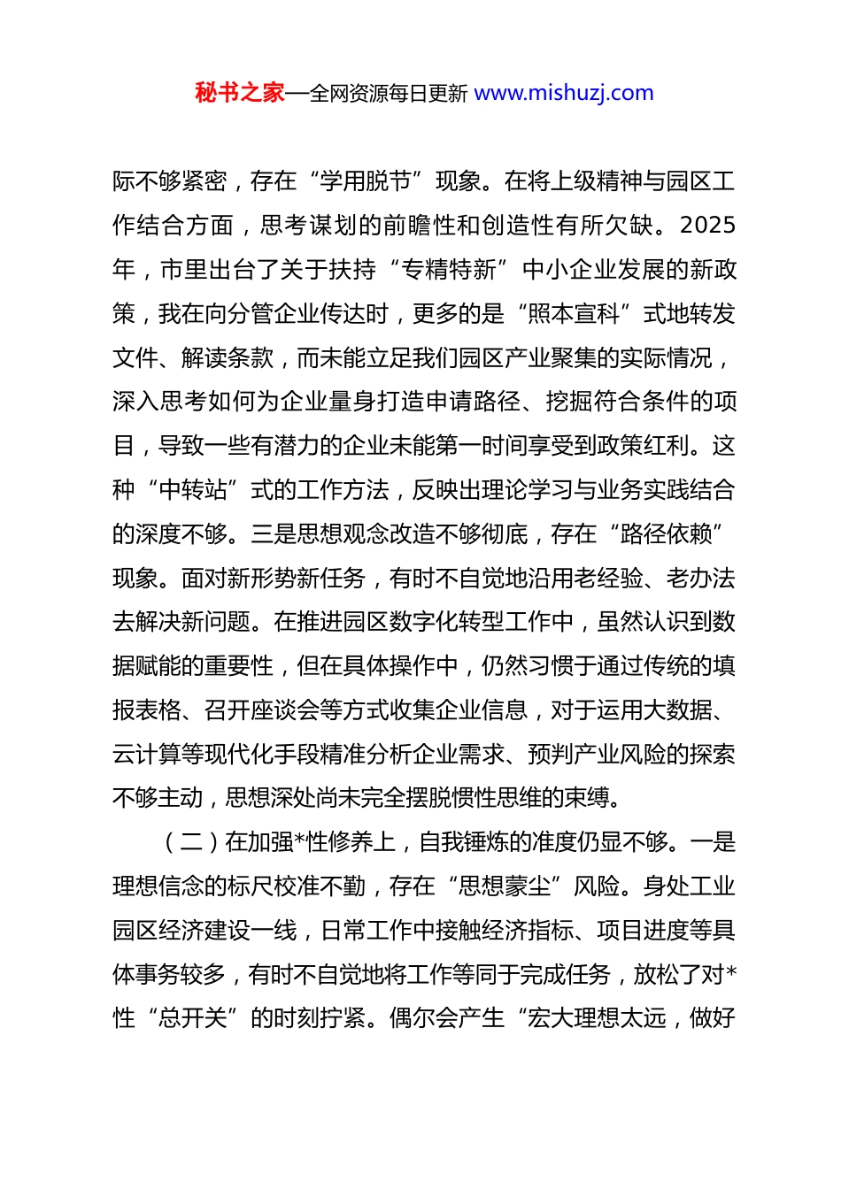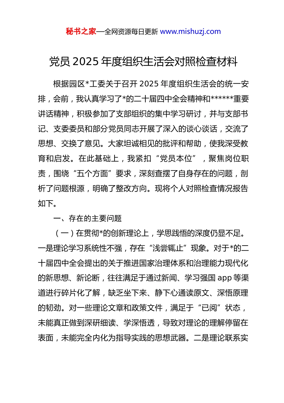 秘书之家—全网资源每日更新 www.mishuzj.com党员 2025 年度组织生活会对照检查材料根据园区*工委关于召开 2025 年度组织生活会的统一安排,会前,我认真学习了*的二十届四中全会精神和******重要讲话精神,积极参加了支部组织的集中学习研讨,并与支部书记、支委委员和部分党员同志开展了深入的谈心谈话,交流了思想、交换了意见。大家坦诚相见的批评和帮助,使我深受教育和启发。在此基础上,我紧扣“党员本位”,聚焦岗位职责,围绕“五个方面”要求,深刻查摆了自身存在的问题,剖析了问题根源,明确了整改方向。现将个人对照检查情况报告如下。一、存在的主要问题(一)在贯彻*的创新理论上,学思践悟的深度仍显不足。一是理论学习系统性不强,存在“浅尝辄止”现象。对于*的二十届四中全会提出的关于推进国家治理体系和治理能力现代化的新思想、新论断,往往满足于通过新闻、学习强国 app 等渠道进行碎片化了解,缺乏坐下来、静下心通读原文、深悟原理的韧劲。对一些理论文章和政策文件,满足于“已阅”状态,未能真正做到深研细读、学深悟透,导致对理论的理解停留在表面,未能完全内化为指导实践的思想武器。二是理论联系实秘书之家—全网资源每日更新 www.mishuzj.com际不够紧密,存在“学用脱节”现象。在将上级精神与园区工作结合方面,思考谋划的前瞻性和创造性有所欠缺。2025年,市里出台了关于扶持“专精特新”中小企业发展的新政策,我在向分管企业传达时,更多的是“照本宣科”式地转发文件、解读条款,而未能立足我们园区产业聚集的实际情况,深入思考如何为企业量身打造申请路径、挖掘符合条件的项目,导致一些有潜力的企业未能第一时间享受到政策红利。这种“中转站”式的工作方法,反映出理论学习与业务实践结合的深度不够。三是思想观念改造不够彻底,存在“路径依赖”现象。面对新形势新任务,有时不自觉地沿用老经验、老办法去解决新问题。在推进园区数字化转型工作中,虽然认识到数据赋能的重要性,但在具体操作中,仍然习惯于通过传统的填报表格、召开座谈会等方式收集企业信息,对于运用大数据、云计算等现代化手段精准分析企业需求、预判产业风险的探索不够主动,思想深处尚未完全摆脱惯性思维的束缚。(二)在加强*性修养上,自我锤炼的准度仍显不够。一是理想信念的标尺校准不勤,存在“思想蒙尘”风险。身处工业园区经济建设一线,日常工作中接触经济指标、项目进度等具体事务较多,有时不自觉地将工作等同于完成任务,放松了对*性“总开关”的时刻拧紧。偶尔会产生“宏大理想太远,做好秘书之家—全网资源每日更新 www.mishuzj.com本职工作就行”的松懈念头,导致在面对繁重任务时,首先想到的是如何完成,而不是思考如何通过完成这项任务来践行党员的初心使命,理想信念的“压舱石”作用未能时时凸显。二是参加组织生活的主动性不强,存在“被动应付”心态。能够按时参加“三会一课”、主题*日等活动,但参与的质量有待提高。例如,在 2025 年第四季度关于“优化营商环境,党员如何担当作为”的主题*日活动上,我虽然做了发言准备,但更多是围绕自身工作谈了一些常规性想法,对于其他同志提出的深刻见解,未能积极开展思想碰撞和深入研讨,把参加组织生活当成一项必须履行的“硬任务”,而忽视了其作为锤炼*性、提升自我的“大熔炉”作用。三是运用批评和自我批评武器不力,存在“一团和气”思想。在开展批评时,顾虑较多,担心影响同事关系,往往是“谈工作多、谈思想少,提希望多、点问题少”,辣味不足。在自我批评时,有时也存在避重就轻、蜻蜓点水的现象,对一些深层次的思想问题、作风问题,未能勇敢地、彻底地揭示出来。这种“爱惜羽毛”的心态,实质上是*性锻炼不够、斗争精神不足的表现。(三)在联系服务群众上,宗旨意识的牢度仍显欠缺。一是深入基层问需于企的情感温度不够。作为园区管委会的一员,服务的“群众”主要是园区内的广大企业。在日常走访秘书之家—全网资源每日更新 www.mishuzj.com中,习惯于与企业负责人、高管对接,了解宏观经营状况和项目进展,虽然也完成了下基层的“规定动作”,但深入生产一线、走进...