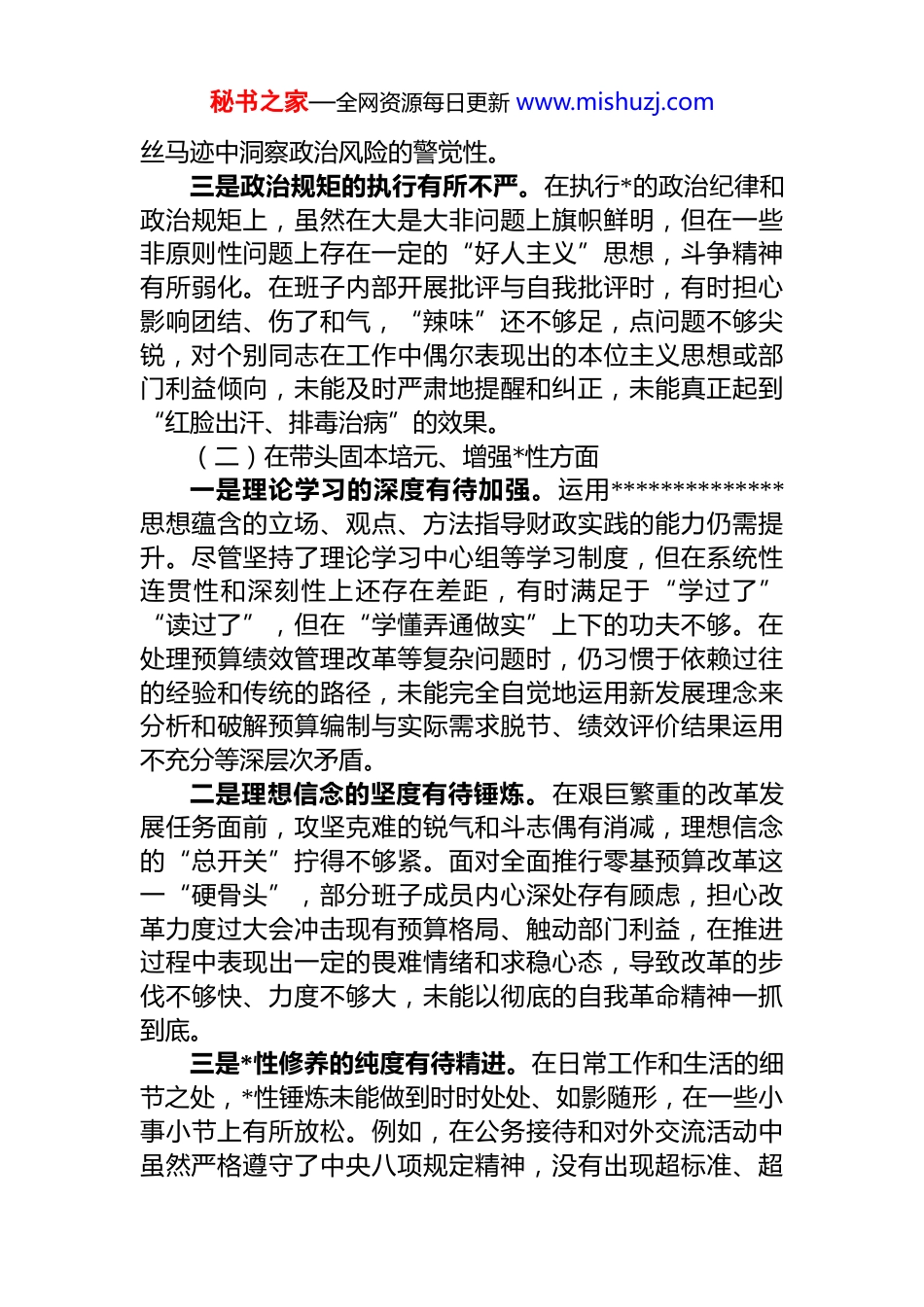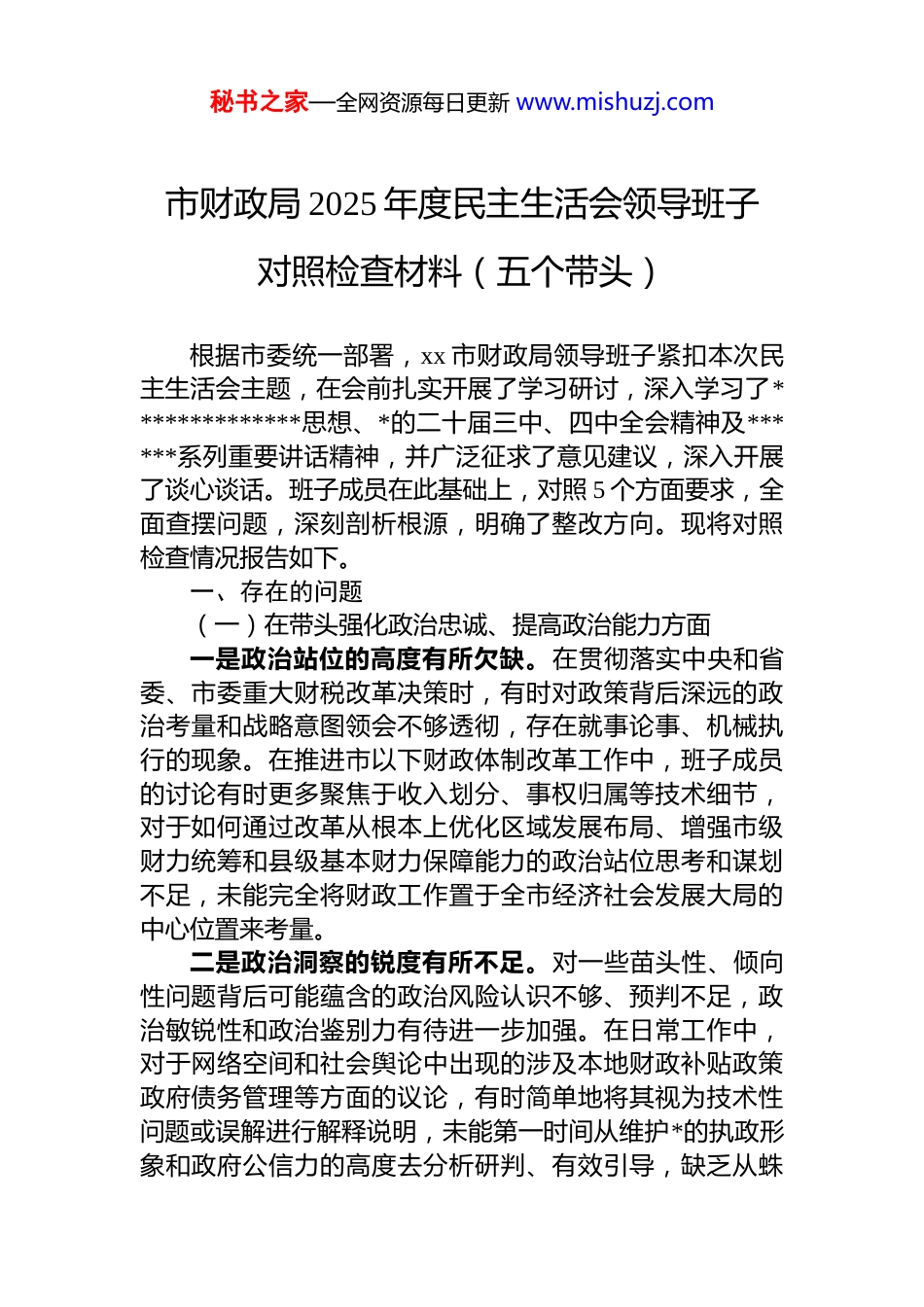 秘书之家—全网资源每日更新 www.mishuzj.com市财政局 2025 年度民主生活会领导班子对照检查材料(五个带头)根据市委统一部署,xx 市财政局领导班子紧扣本次民主生活会主题,在会前扎实开展了学习研讨,深入学习了**************思想、*的二十届三中、四中全会精神及******系列重要讲话精神,并广泛征求了意见建议,深入开展了谈心谈话。班子成员在此基础上,对照 5 个方面要求,全面查摆问题,深刻剖析根源,明确了整改方向。现将对照检查情况报告如下。一、存在的问题(一)在带头强化政治忠诚、提高政治能力方面一是政治站位的高度有所欠缺。在贯彻落实中央和省委、市委重大财税改革决策时,有时对政策背后深远的政治考量和战略意图领会不够透彻,存在就事论事、机械执行的现象。在推进市以下财政体制改革工作中,班子成员的讨论有时更多聚焦于收入划分、事权归属等技术细节,对于如何通过改革从根本上优化区域发展布局、增强市级财力统筹和县级基本财力保障能力的政治站位思考和谋划不足,未能完全将财政工作置于全市经济社会发展大局的中心位置来考量。二是政治洞察的锐度有所不足。对一些苗头性、倾向性问题背后可能蕴含的政治风险认识不够、预判不足,政治敏锐性和政治鉴别力有待进一步加强。在日常工作中,对于网络空间和社会舆论中出现的涉及本地财政补贴政策政府债务管理等方面的议论,有时简单地将其视为技术性问题或误解进行解释说明,未能第一时间从维护*的执政形象和政府公信力的高度去分析研判、有效引导,缺乏从蛛秘书之家—全网资源每日更新 www.mishuzj.com丝马迹中洞察政治风险的警觉性。三是政治规矩的执行有所不严。在执行*的政治纪律和政治规矩上,虽然在大是大非问题上旗帜鲜明,但在一些非原则性问题上存在一定的“好人主义”思想,斗争精神有所弱化。在班子内部开展批评与自我批评时,有时担心影响团结、伤了和气,“辣味”还不够足,点问题不够尖锐,对个别同志在工作中偶尔表现出的本位主义思想或部门利益倾向,未能及时严肃地提醒和纠正,未能真正起到“红脸出汗、排毒治病”的效果。(二)在带头固本培元、增强*性方面一是理论学习的深度有待加强。运用**************思想蕴含的立场、观点、方法指导财政实践的能力仍需提升。尽管坚持了理论学习中心组等学习制度,但在系统性连贯性和深刻性上还存在差距,有时满足于“学过了”“读过了”,但在“学懂弄通做实”上下的功夫不够。在处理预算绩效管理改革等复杂问题时,仍习惯于依赖过往的经验和传统的路径,未能完全自觉地运用新发展理念来分析和破解预算编制与实际需求脱节、绩效评价结果运用不充分等深层次矛盾。二是理想信念的坚度有待锤炼。在艰巨繁重的改革发展任务面前,攻坚克难的锐气和斗志偶有消减,理想信念的“总开关”拧得不够紧。面对全面推行零基预算改革这一“硬骨头”,部分班子成员内心深处存有顾虑,担心改革力度过大会冲击现有预算格局、触动部门利益,在推进过程中表现出一定的畏难情绪和求稳心态,导致改革的步伐不够快、力度不够大,未能以彻底的自我革命精神一抓到底。三是*性修养的纯度有待精进。在日常工作和生活的细节之处,*性锤炼未能做到时时处处、如影随形,在一些小事小节上有所放松。例如,在公务接待和对外交流活动中虽然严格遵守了中央八项规定精神,没有出现超标准、超秘书之家—全网资源每日更新 www.mishuzj.com范围的问题,但有时为了体现“热情周到”和“对等原则”,在活动安排上存在不够节约、略显铺陈的现象,勤俭节约、艰苦奋斗的优良传统在思想深处扎根不够牢固,未能始终以共产*员的先进性和纯洁性标准来审视每一个细节。(三)在带头敬畏人民、敬畏组织、敬畏法纪方面一是群众路线的深度有待拓展。践行新时代*的群众路线不够彻底,“四下基层”制度落实存在形式化倾向。在制定涉及群众切身利益的民生财政政策,如分配用于支持乡村振兴的衔接资金或老旧小区改造补助资金时,虽然履行了征求意见的必要程序,但更多是听取下级主管部门和项目实施单位的汇报,深入田间地头、村居社区,直接与受益群众面对面交流、心贴心沟通不够,对群众的真实想法...